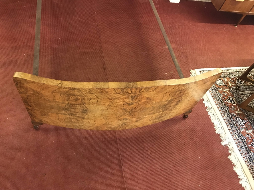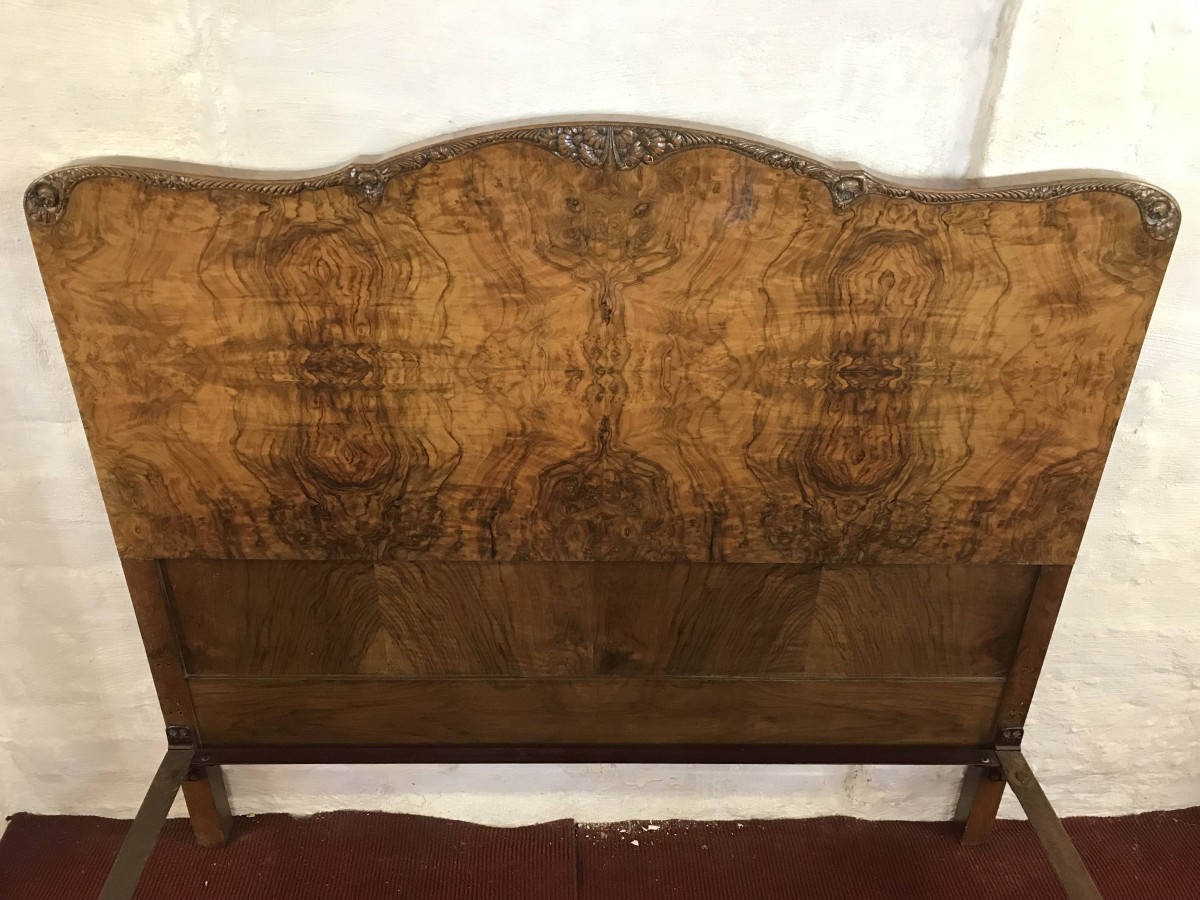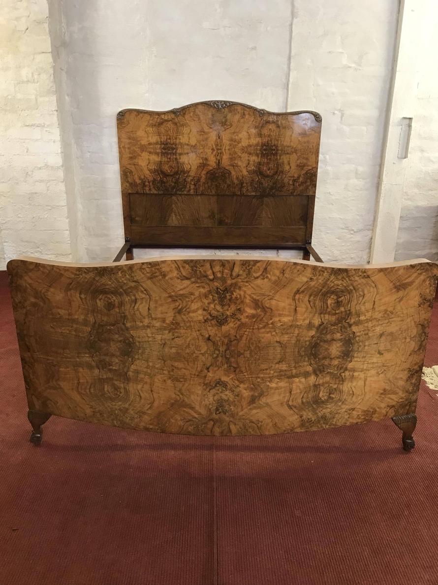 The headboard has a lovely flowing top with carved decoration below. The curved the footboard stands on two carved cabriole shaped legs. The headboard and footboard are connected by original bed irons. Please note the patina of the burr walnut is particularly striking on this bed, TOP QUALITY. The bed takes a standard 4 foot six double mattress.