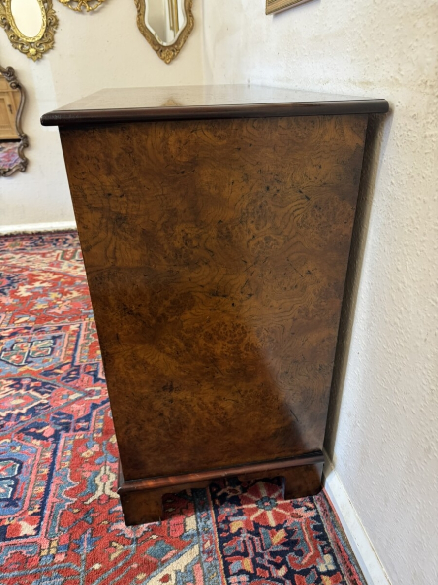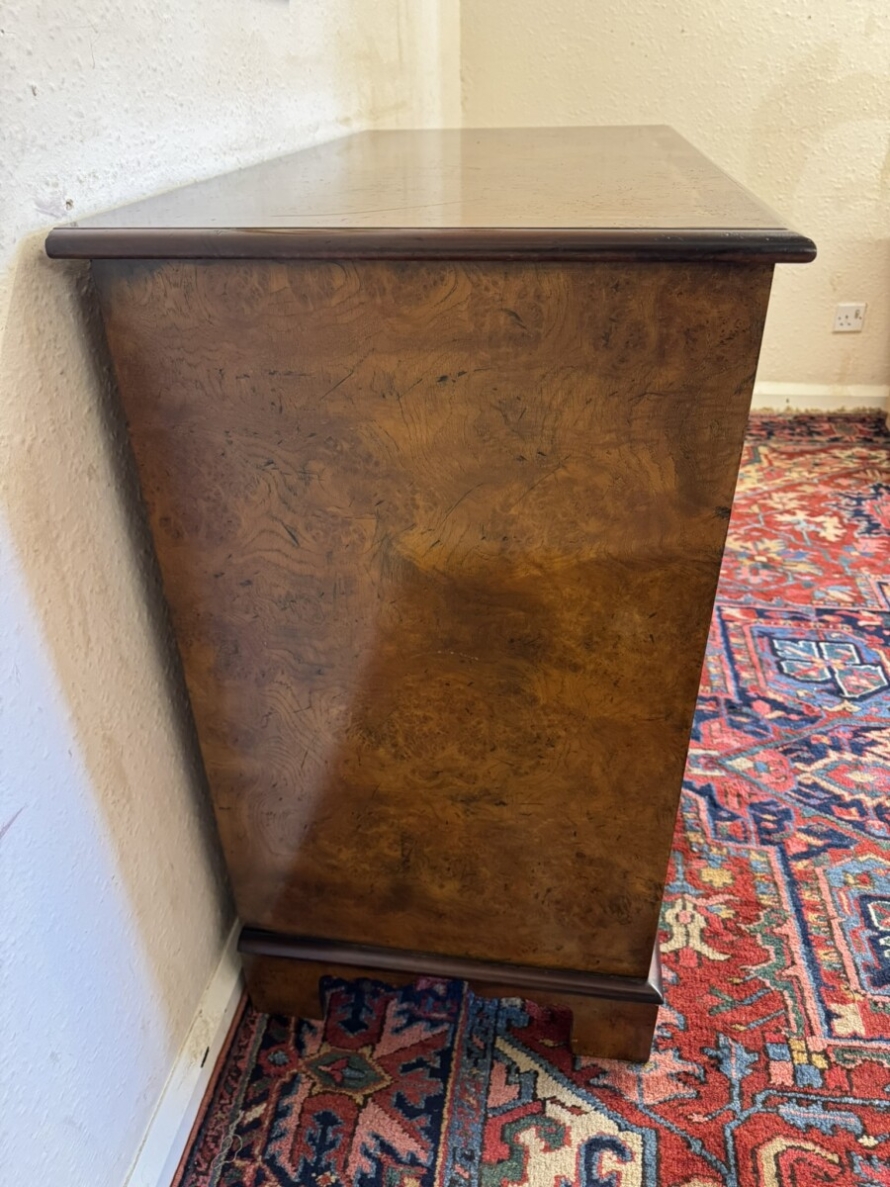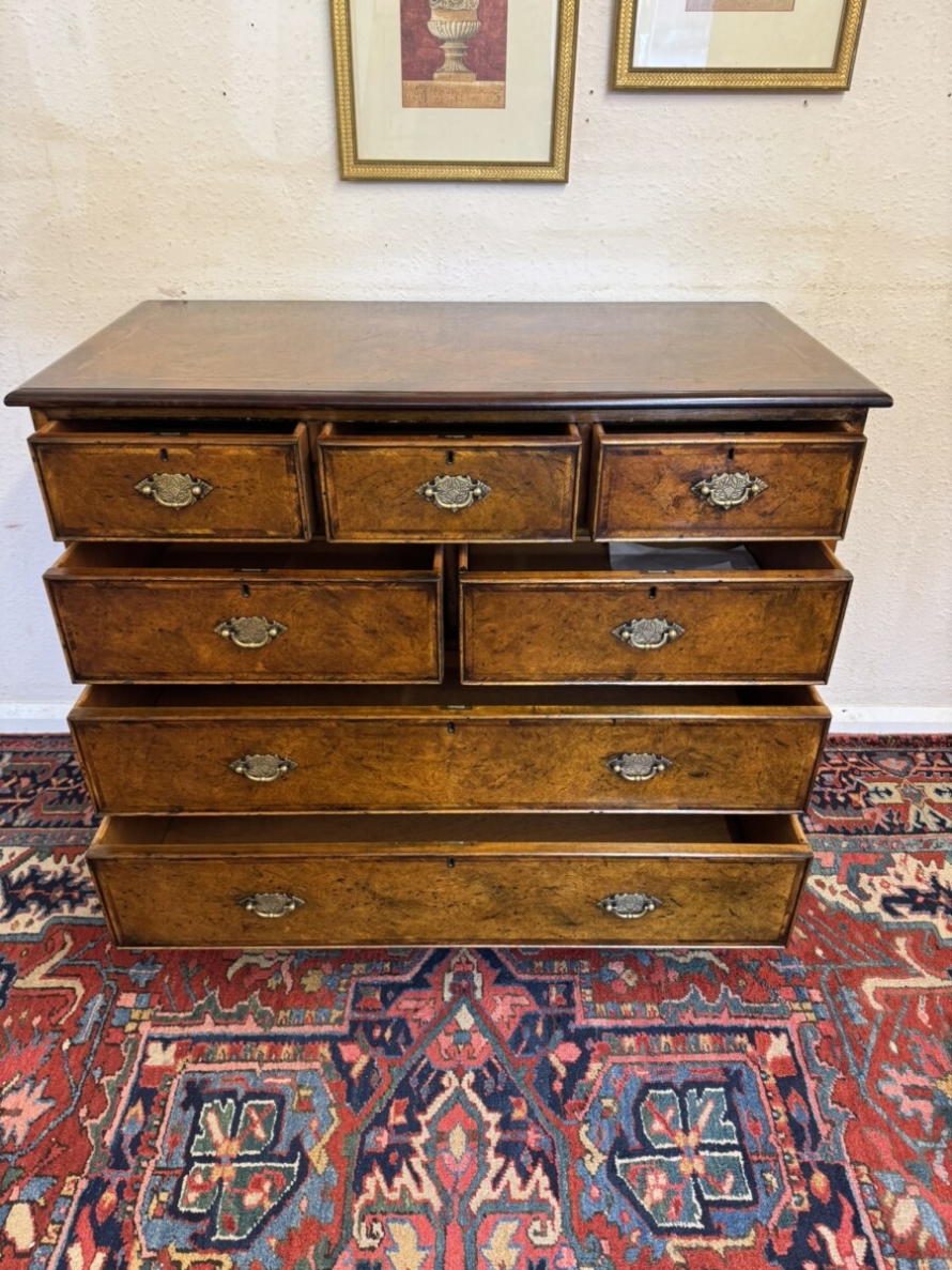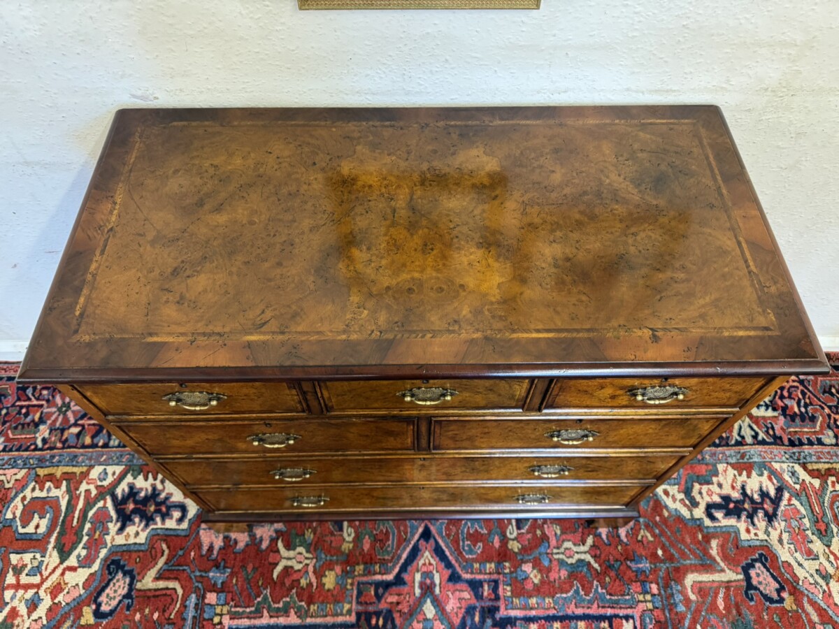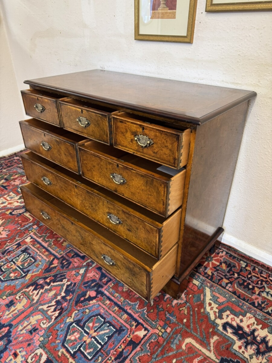 This stunning mid 20th century chest made in striking burr walnut is of exceptional quality and proportion and is in great condition. The oversailing top has herringbone inlaid decoration. The configuration of the drawers is superb with three drawers across the top, two short drawers and two long drawers below, each drawer has a fabulous brass handle. All the drawers are lockable and all have herringbone inlaid decoration. This fantastic chest of drawers sits on four bracket feet.