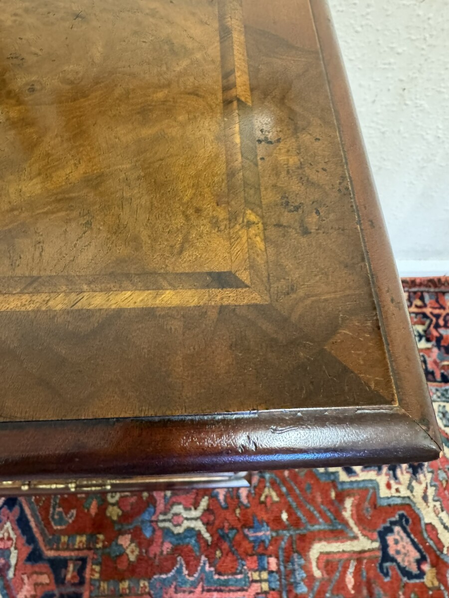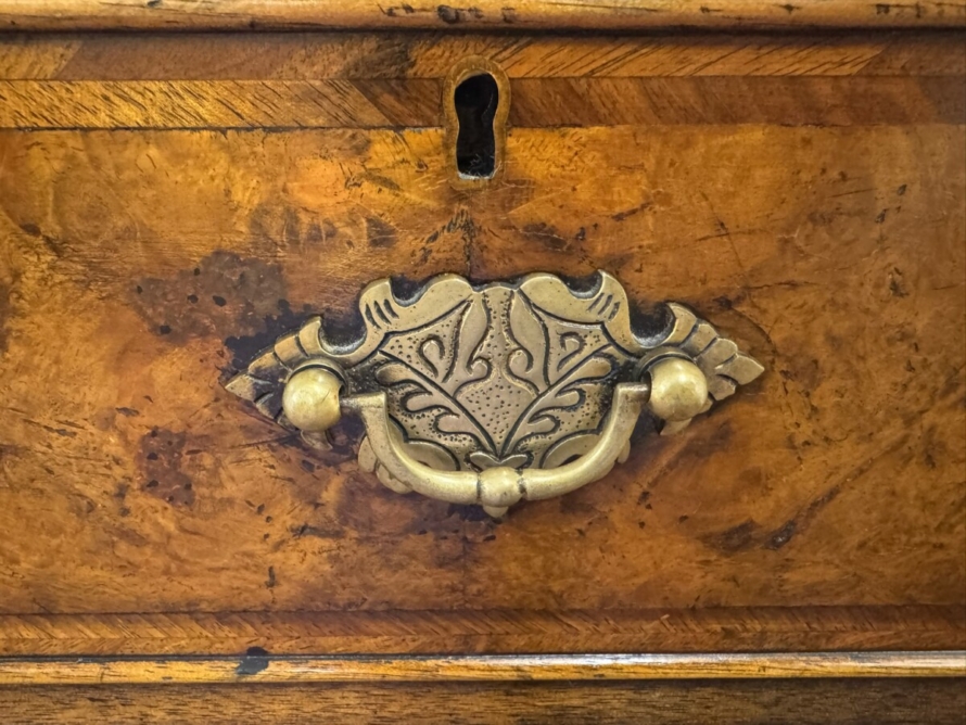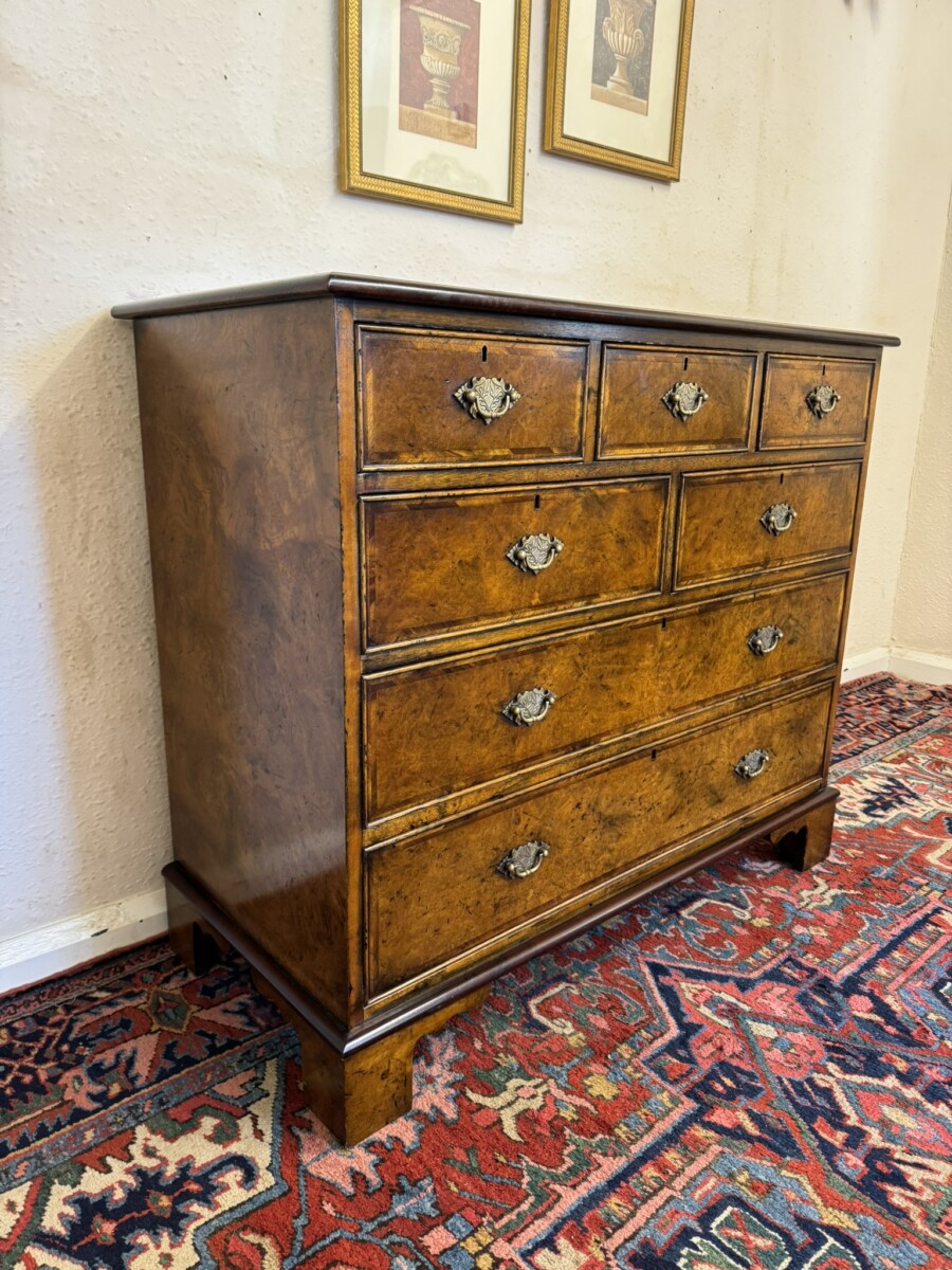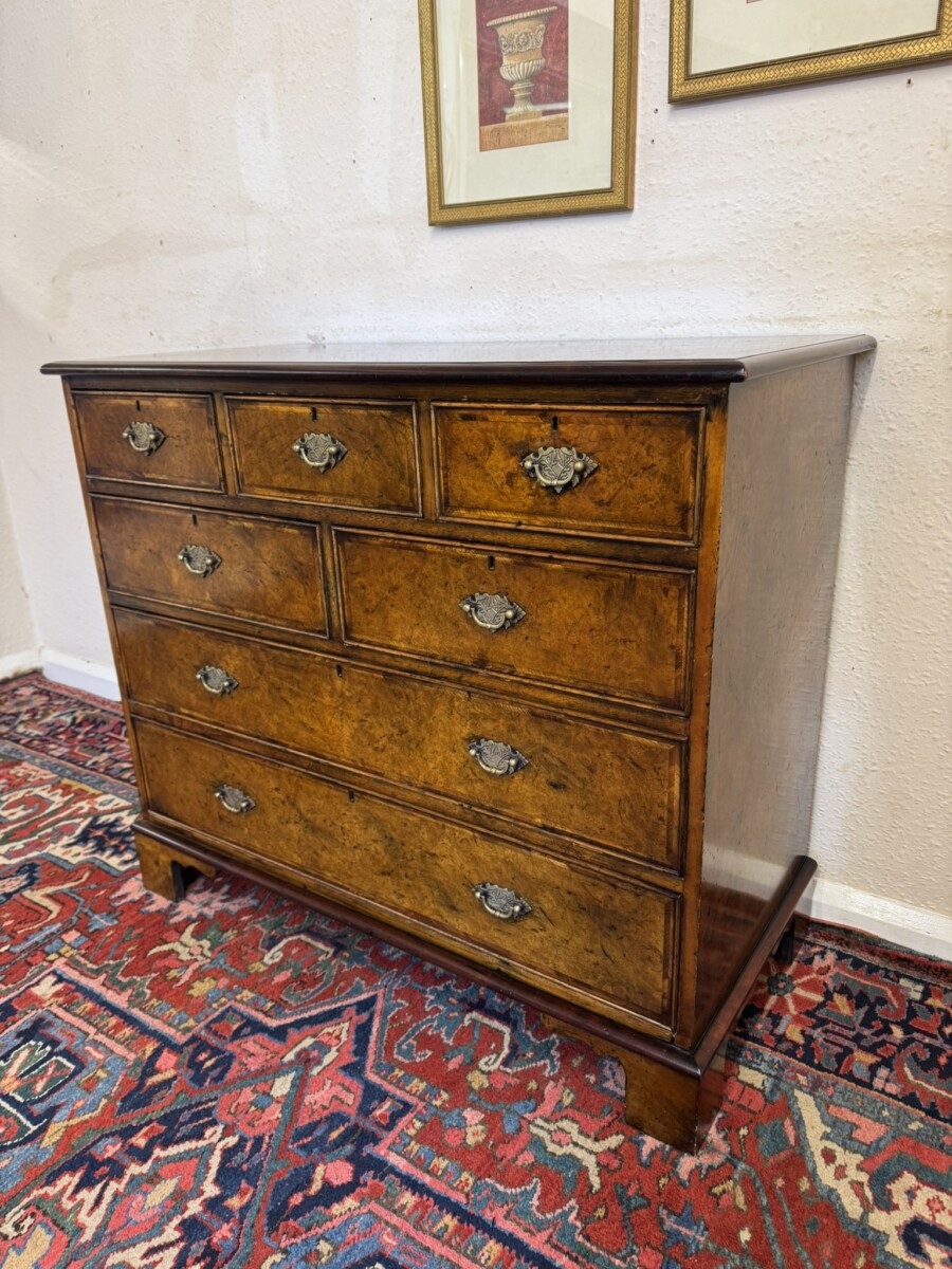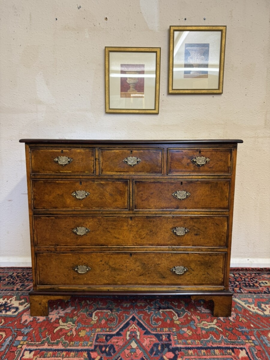 This stunning mid 20th century chest made in striking burr walnut is of exceptional quality and proportion and is in great condition. The oversailing top has herringbone inlaid decoration. The configuration of the drawers is superb with three drawers across the top, two short drawers and two long drawers below, each drawer has a fabulous brass handle. All the drawers are lockable and all have herringbone inlaid decoration. This fantastic chest of drawers sits on four bracket feet.
