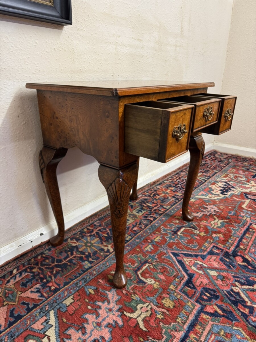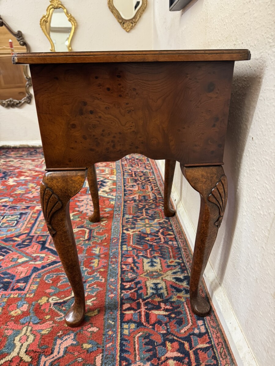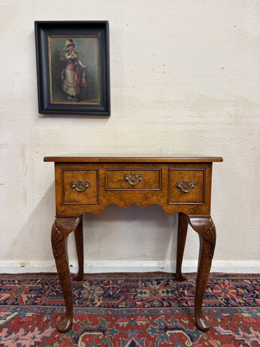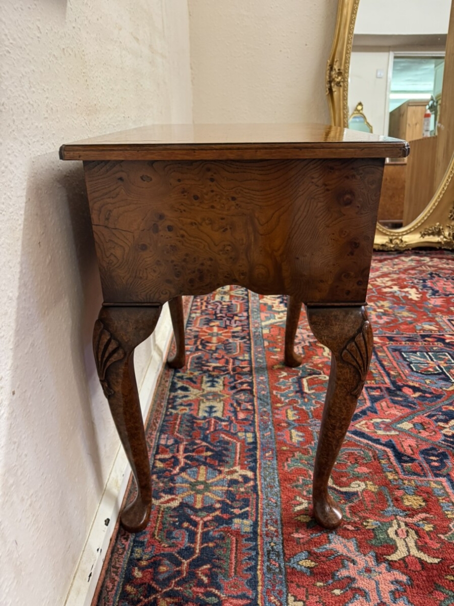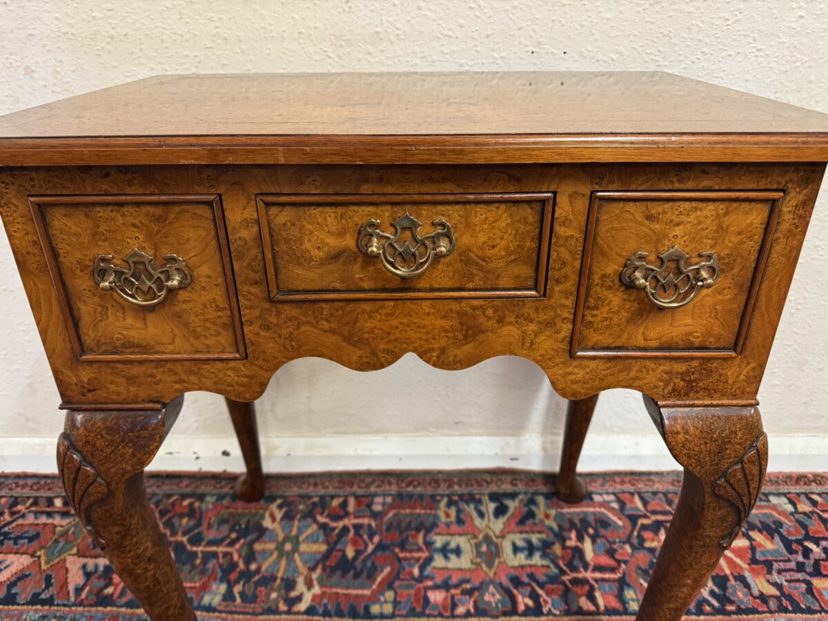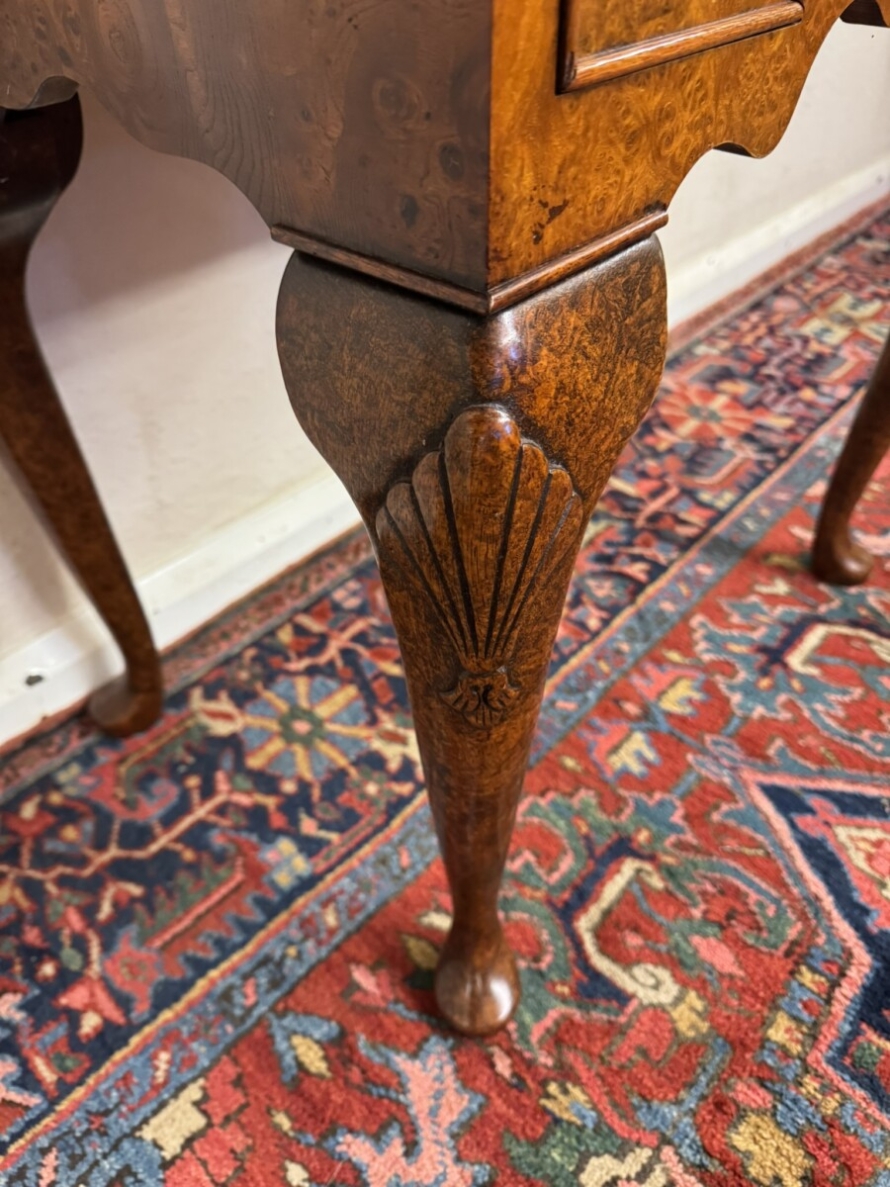 This fabulous table made in burr walnut is in excellent condition – the patina of the burr walnut is striking. The oversailing string inlaid top sits above a central drawer which is flanked by a pair of drawers, each of the drawers have brass handles. Wavy apron to the front and sides and standing proud on four elegant carved cabriole shaped legs.