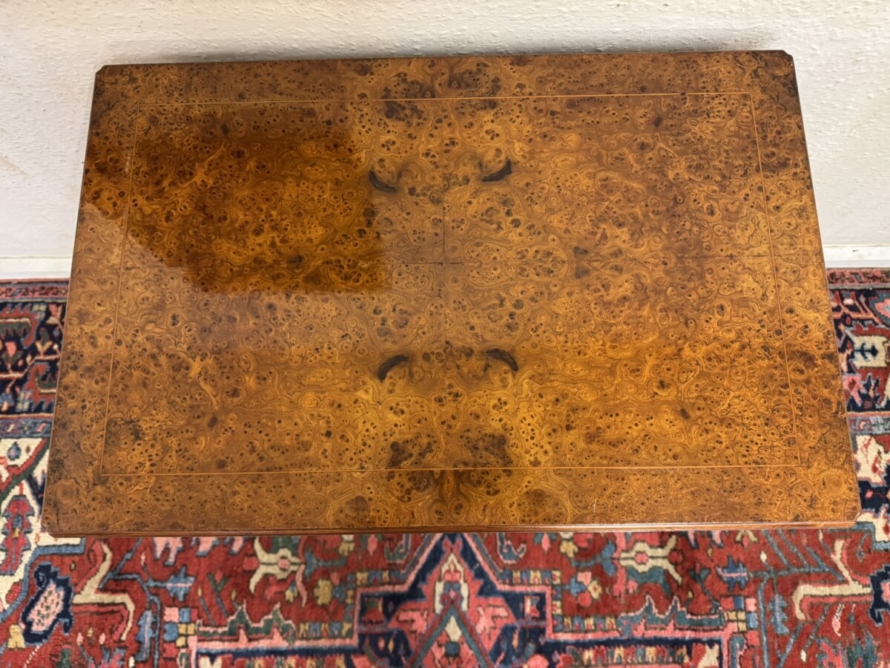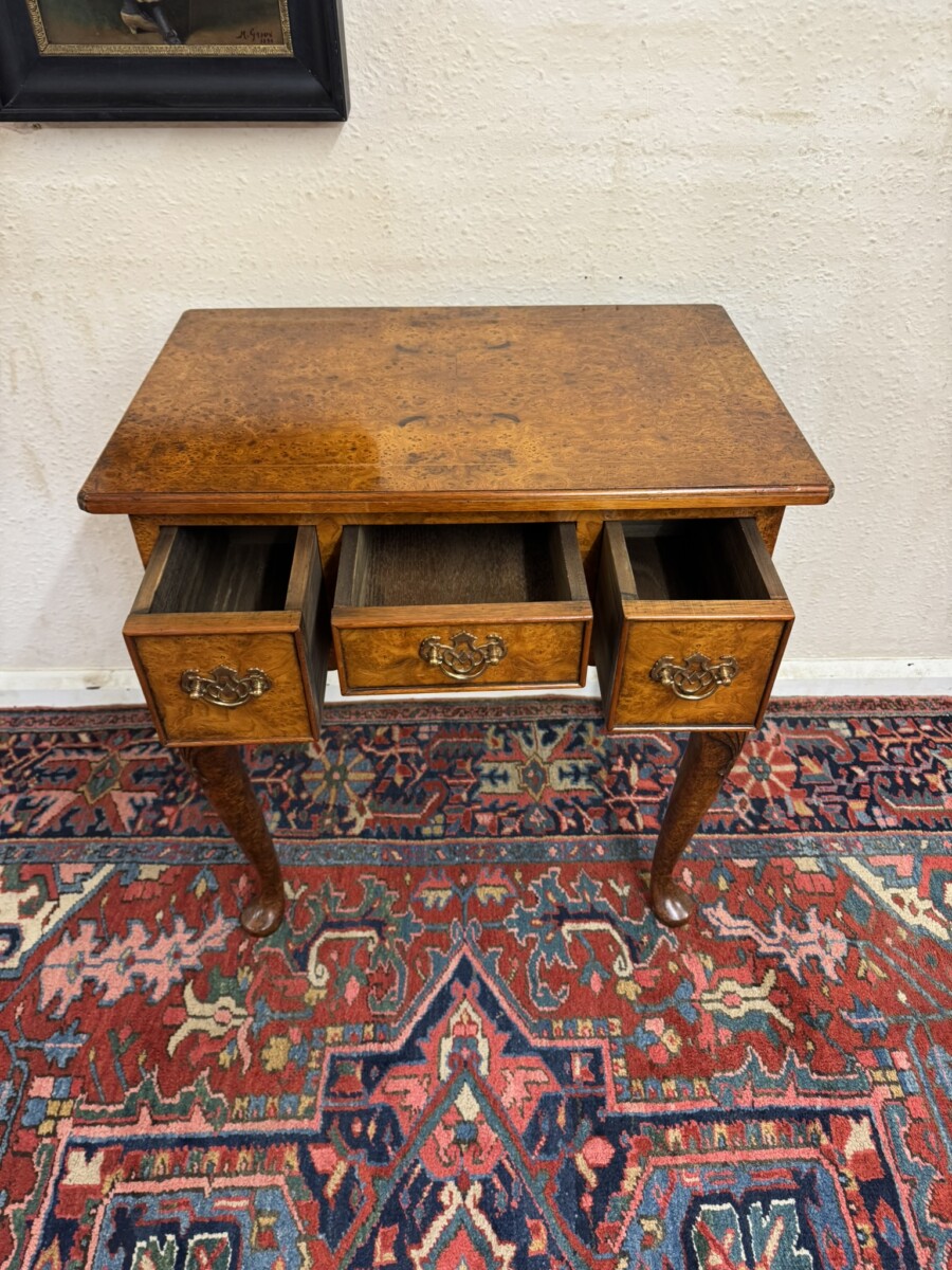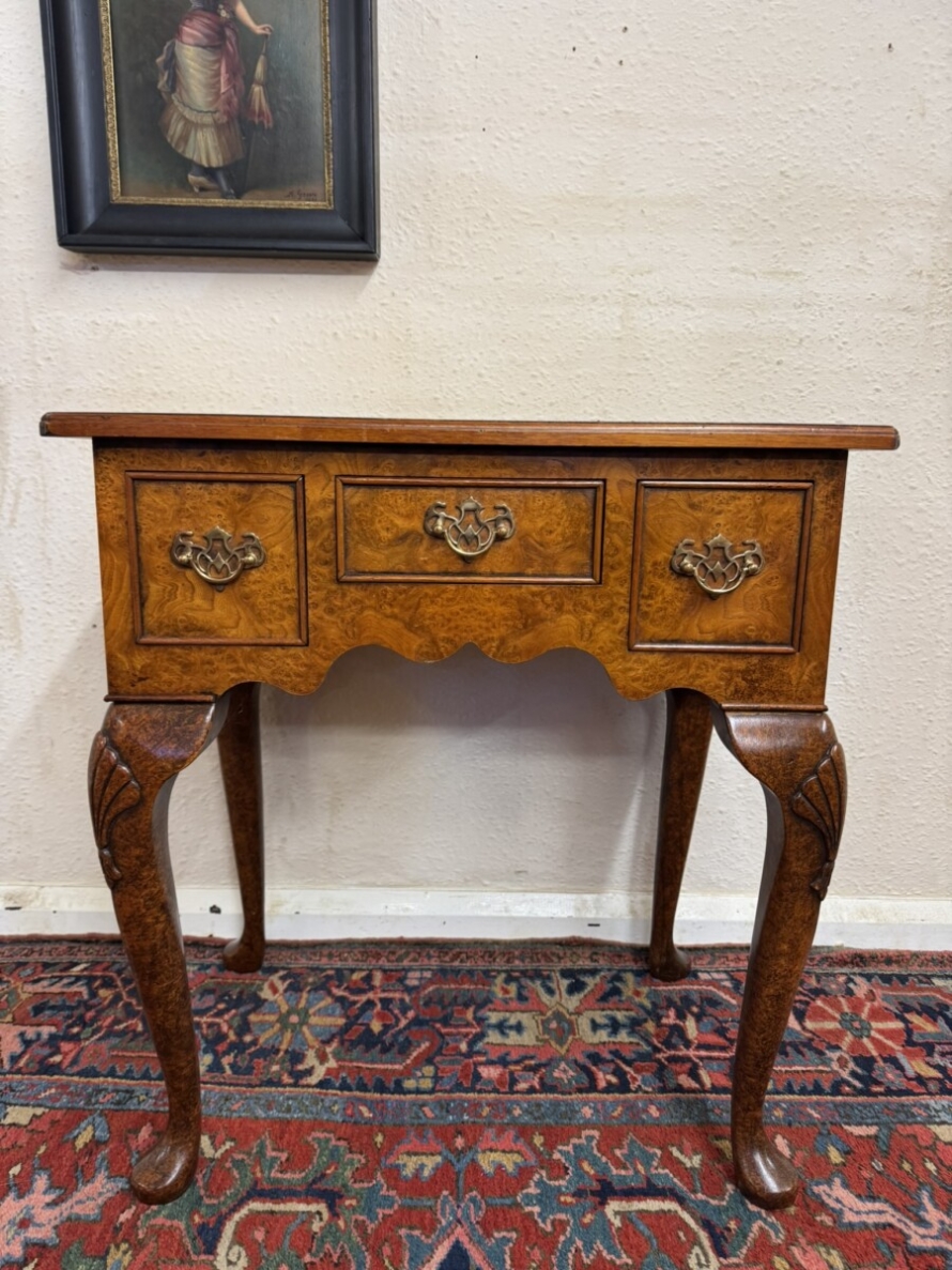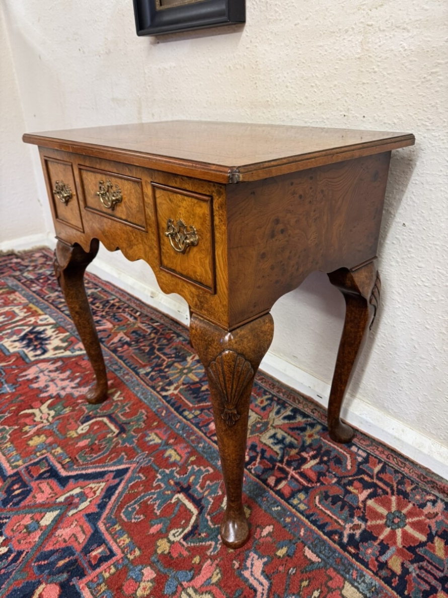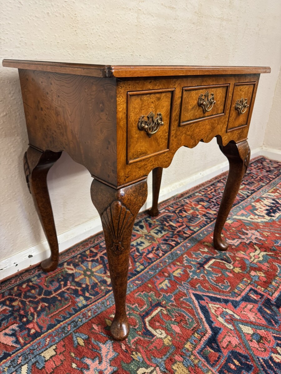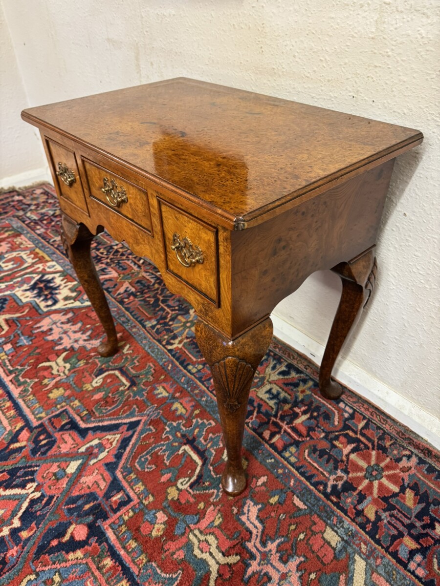 This fabulous table made in burr walnut is in excellent condition – the patina of the burr walnut is striking. The oversailing string inlaid top sits above a central drawer which is flanked by a pair of drawers, each of the drawers have brass handles. Wavy apron to the front and sides and standing proud on four elegant carved cabriole shaped legs.