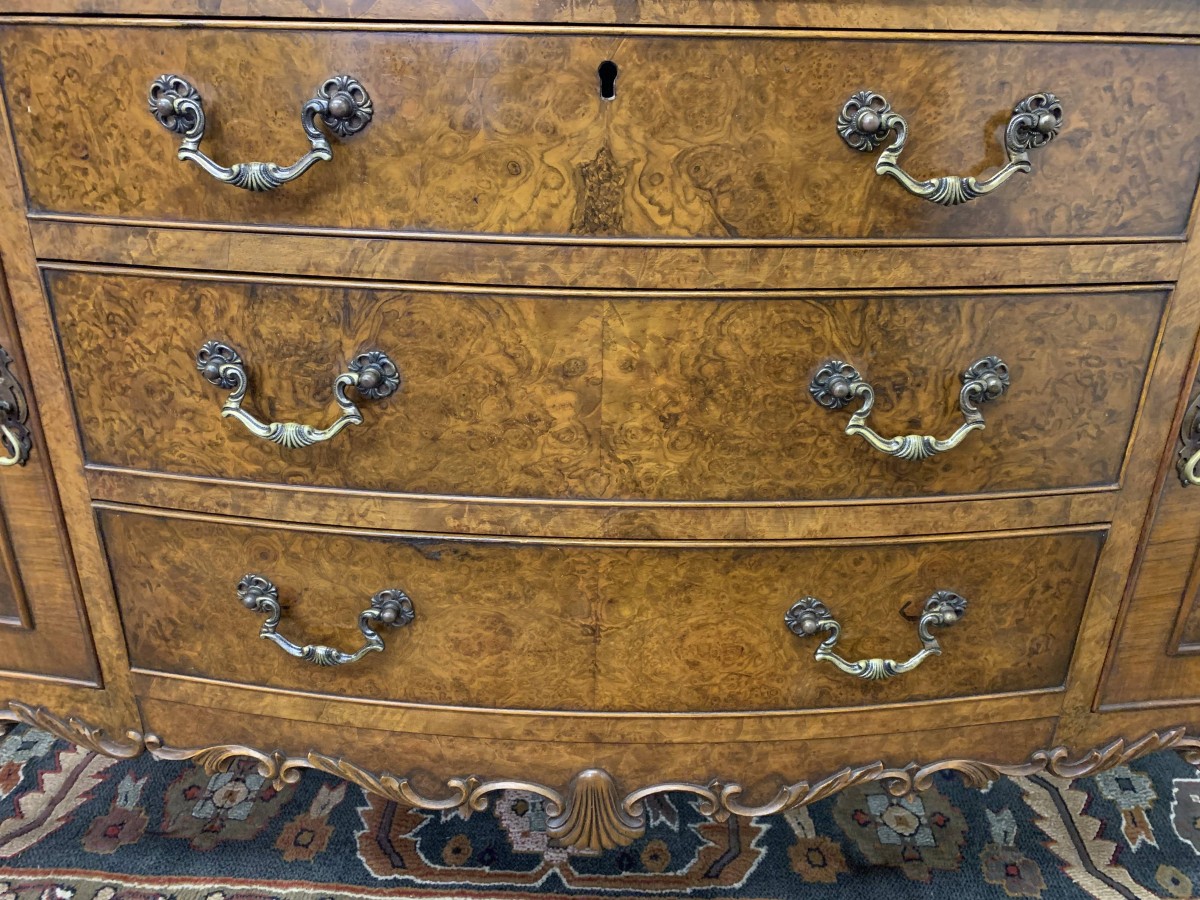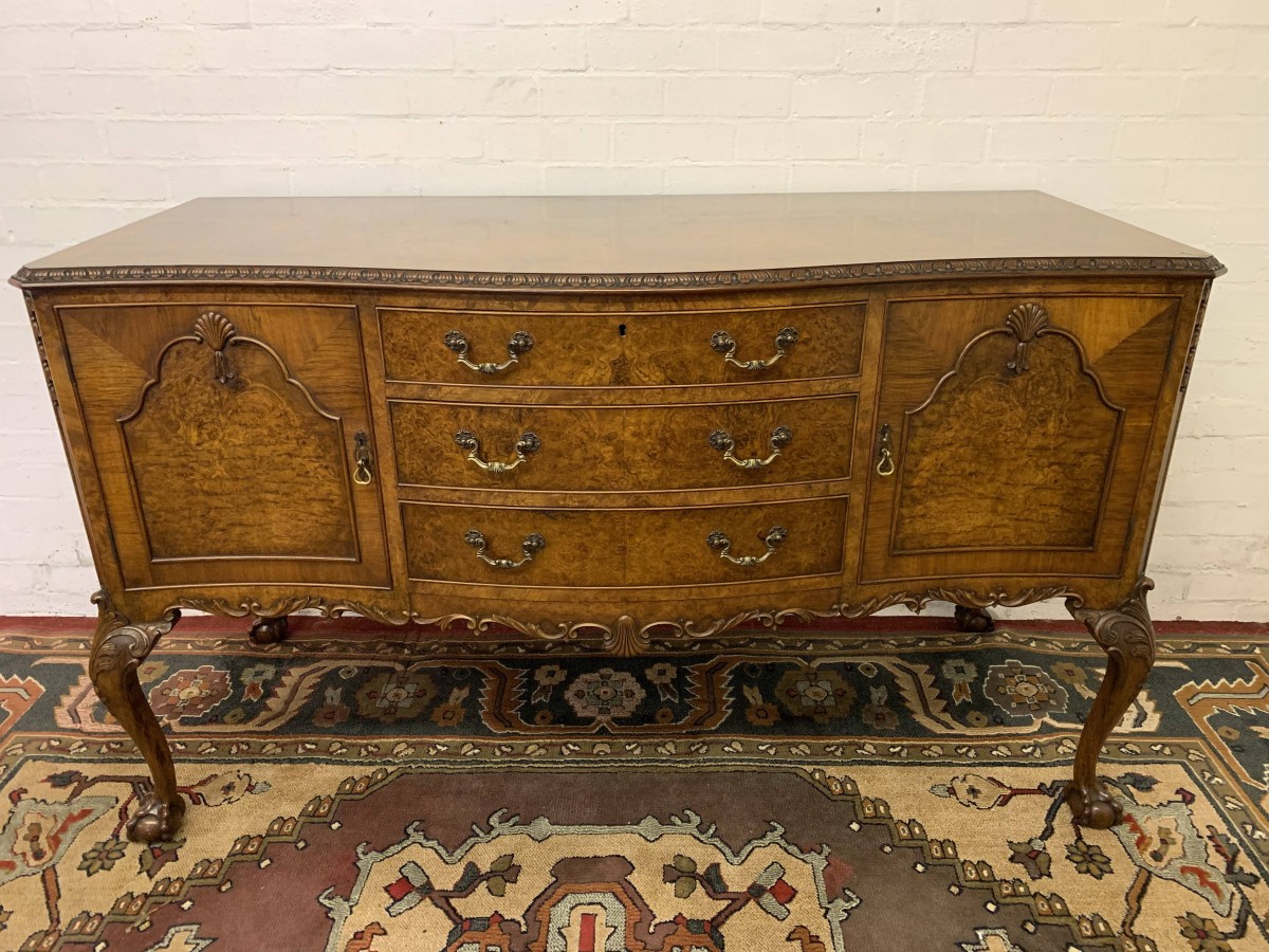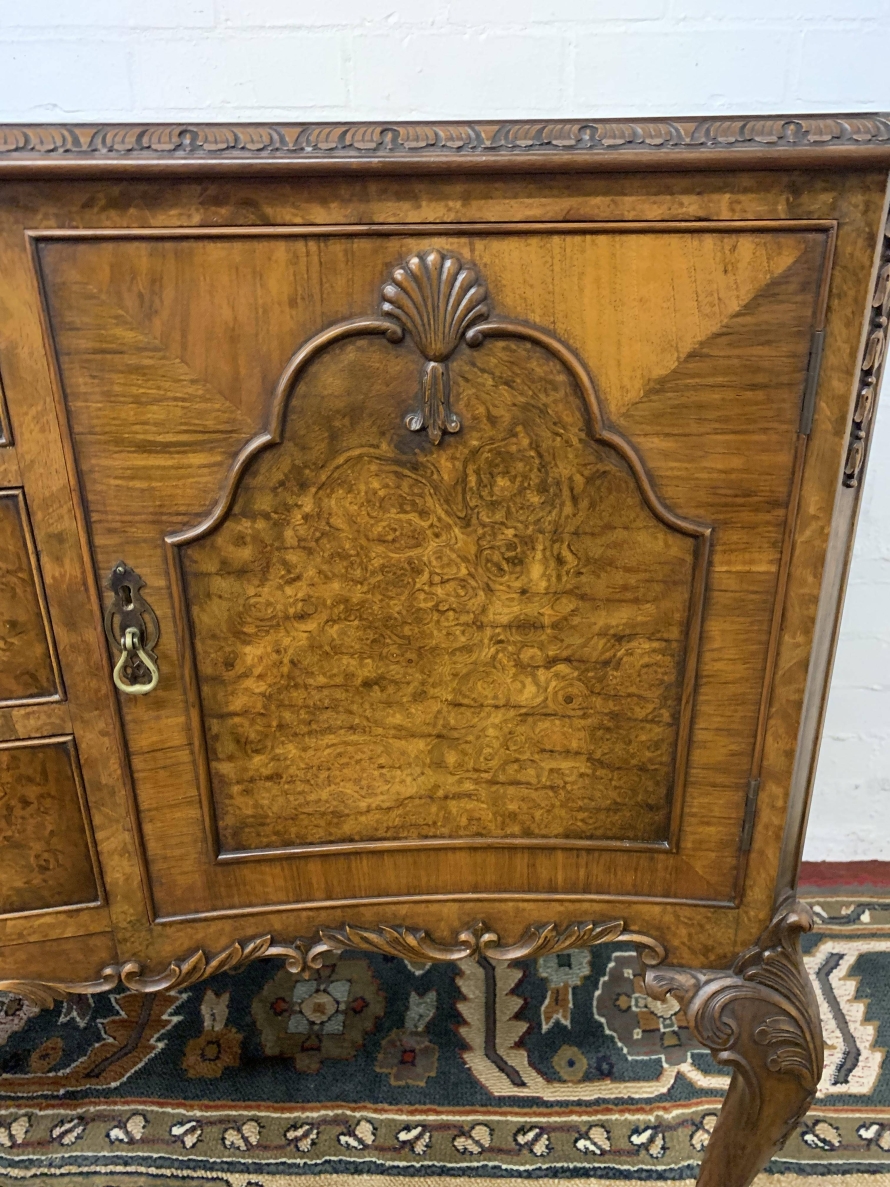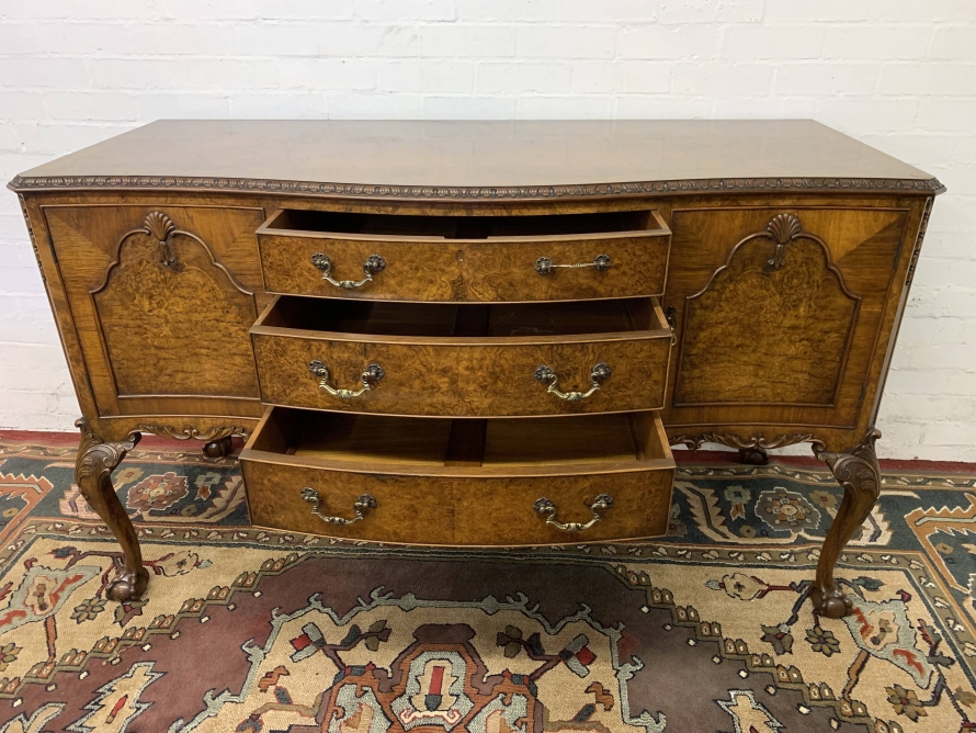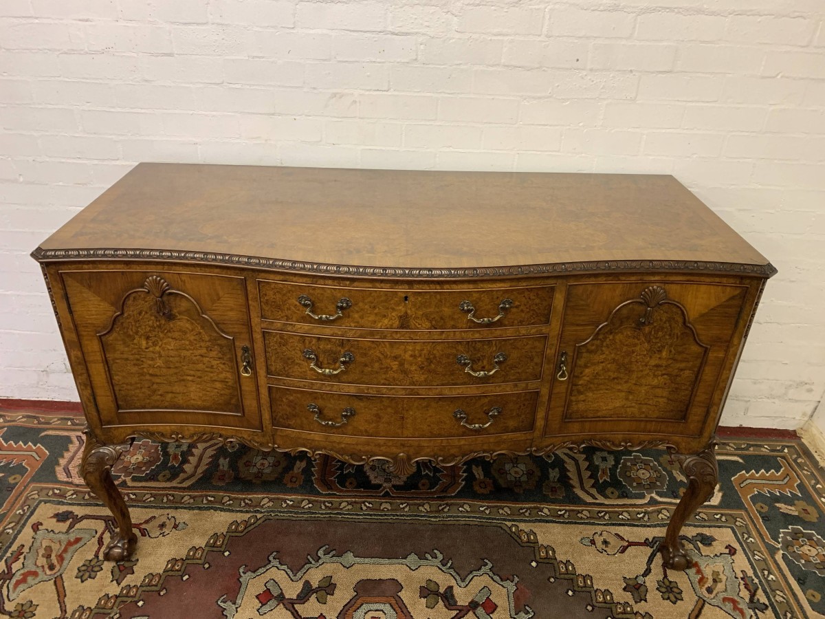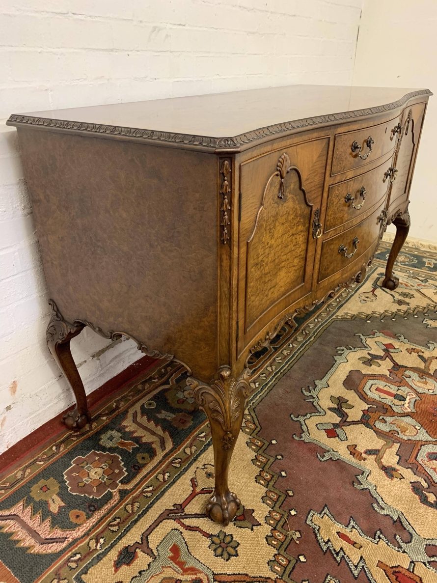 This beautiful sideboard oozes style and is made in the highest burr walnut. The shaped over sailing top is cross banded and has ornate carved edging. Below are three shaped central drawers, each drawer having a pair of ornate brass handles stepped to the sides or a pair of shaped cupboard doors, each door opens to reveal a removable shelf. Highly decorative carved skirt this stunning dresser stands proud on shaped carved cabriole legs with ball and claw feet. Please note the platina of the wall not is striking. Also for sale on our eBay site is a matching extending table, six chairs and Serpentine shaped side table.