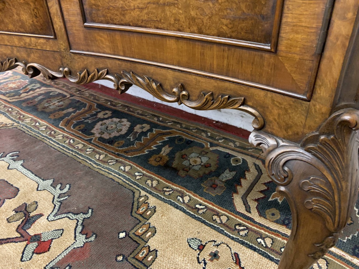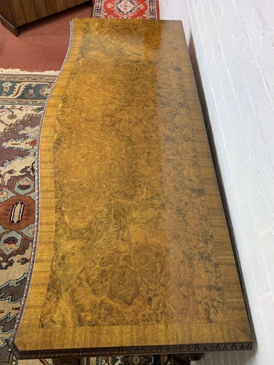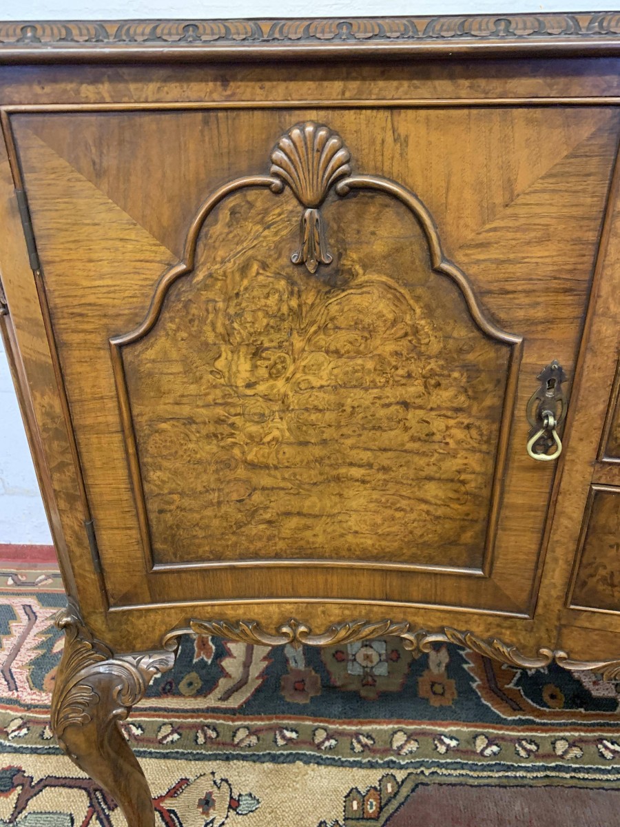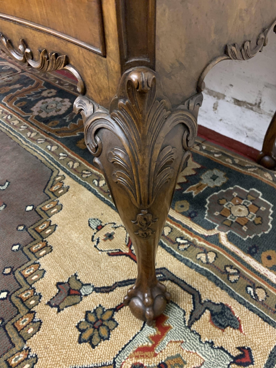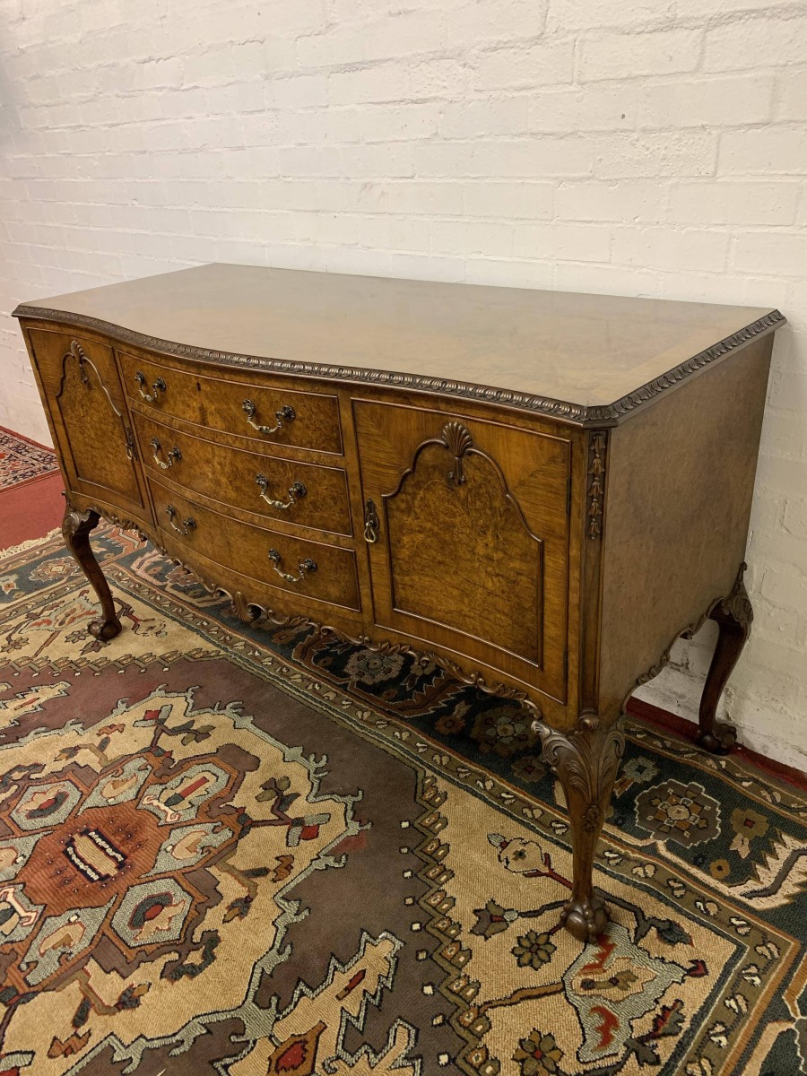 This beautiful sideboard oozes style and is made in the highest burr walnut. The shaped over sailing top is cross banded and has ornate carved edging. Below are three shaped central drawers, each drawer having a pair of ornate brass handles stepped to the sides or a pair of shaped cupboard doors, each door opens to reveal a removable shelf. Highly decorative carved skirt this stunning dresser stands proud on shaped carved cabriole legs with ball and claw feet. Please note the platina of the wall not is striking. Also for sale on our eBay site is a matching extending table, six chairs and Serpentine shaped side table.