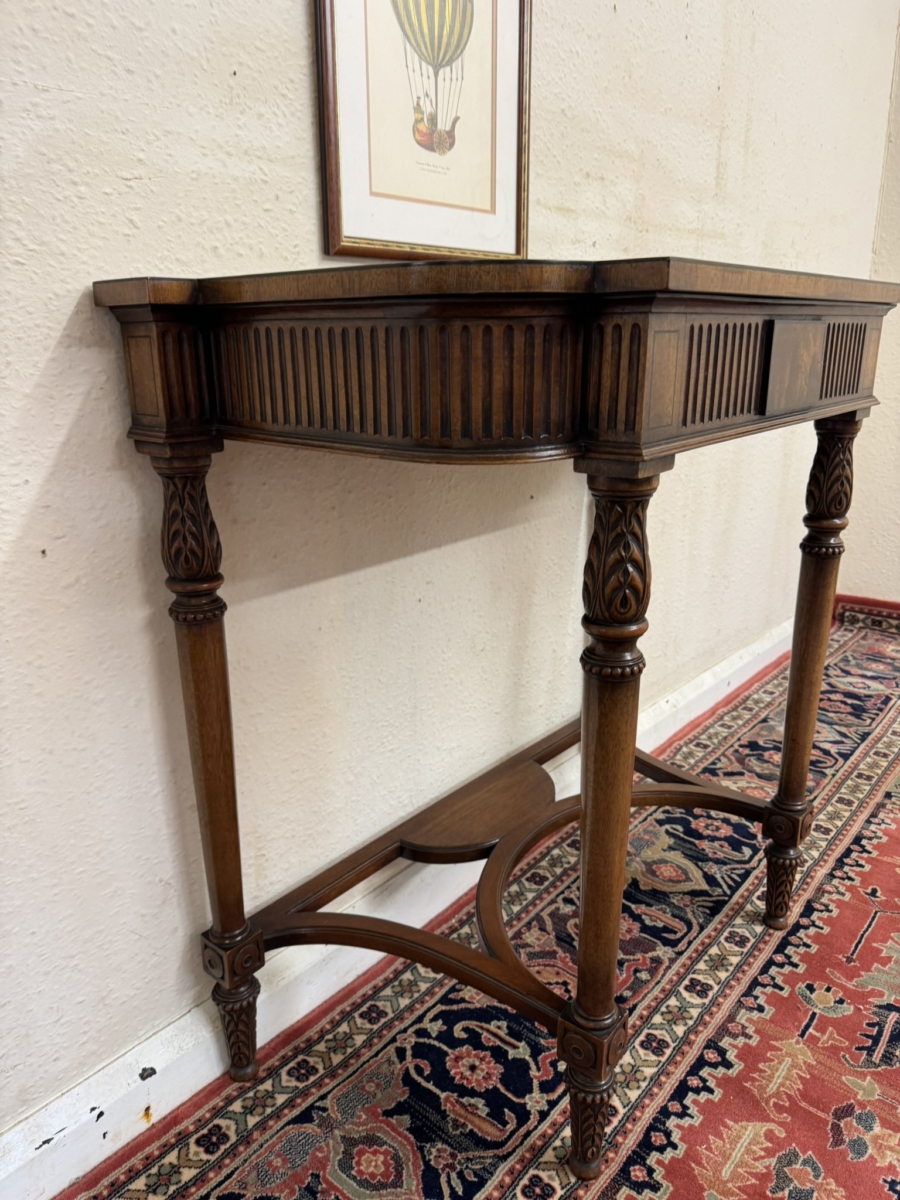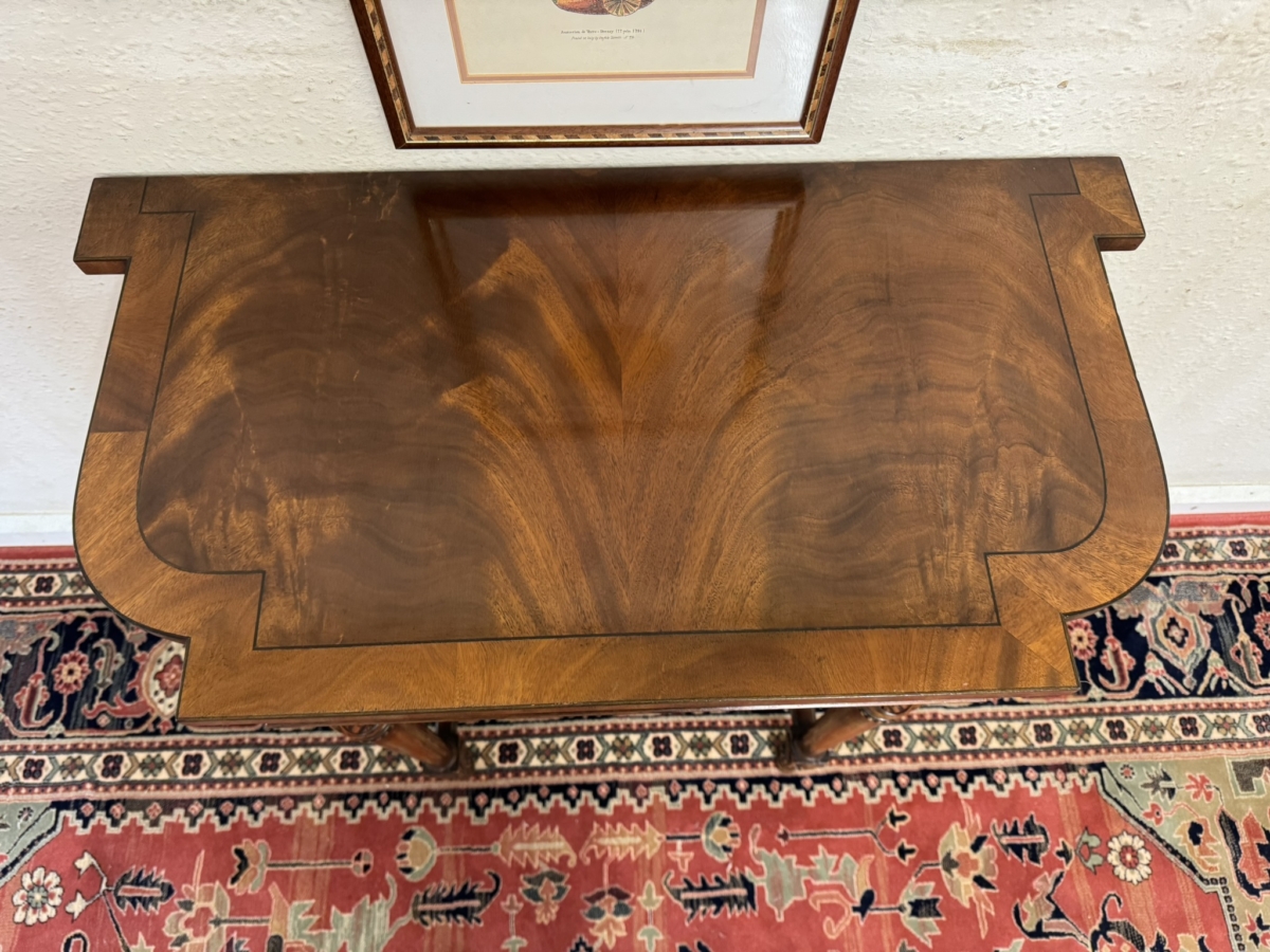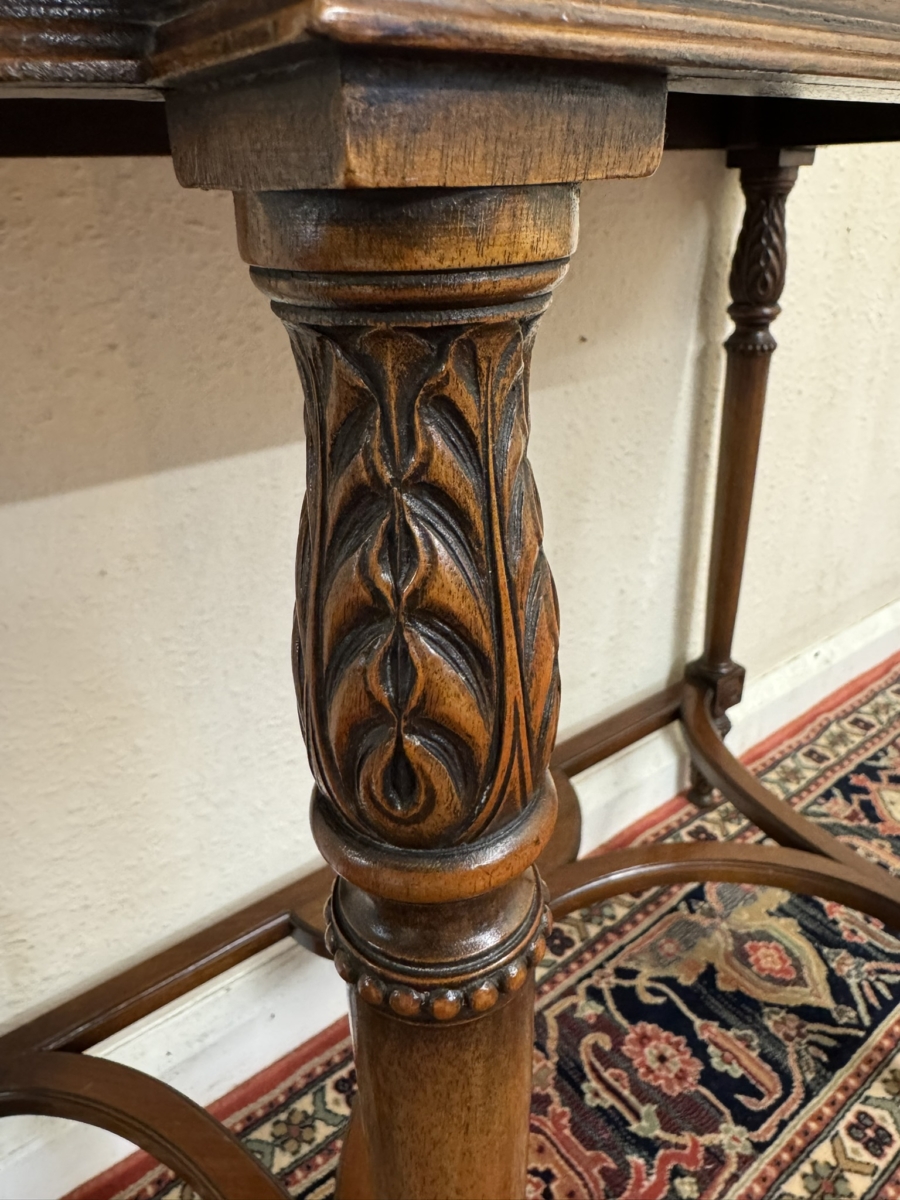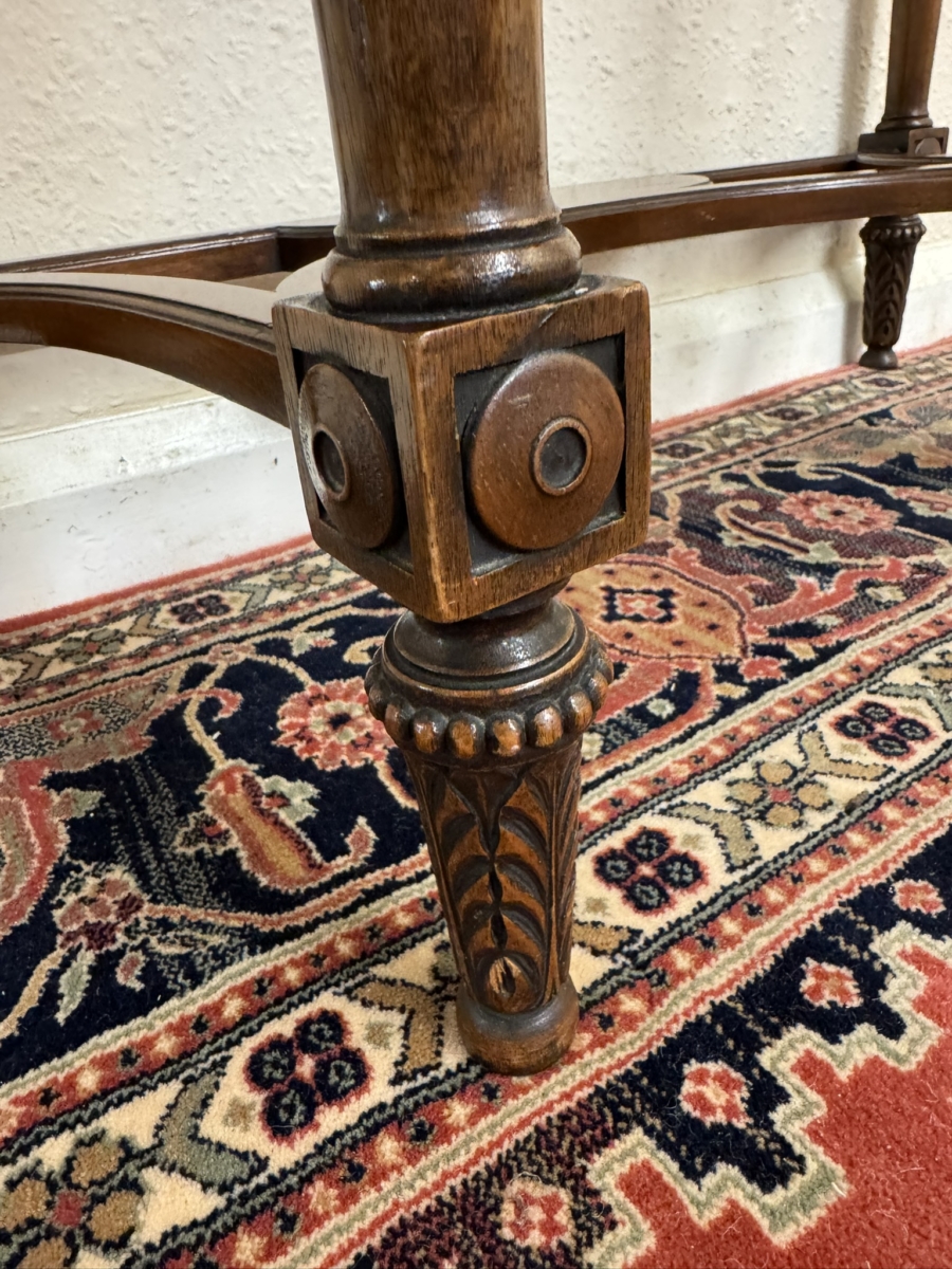 The shaped over sailing top has a cross banded edge, carving below, four carved legs, swept stretcher support and standing on carved feet.