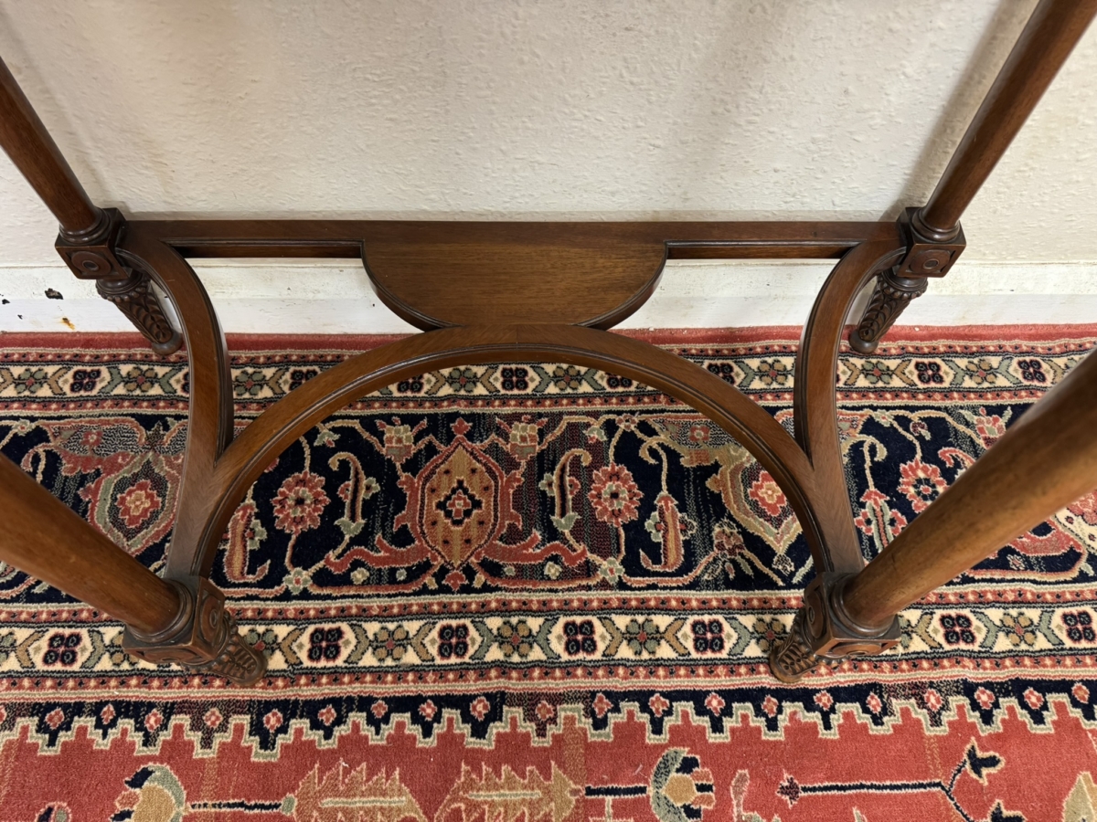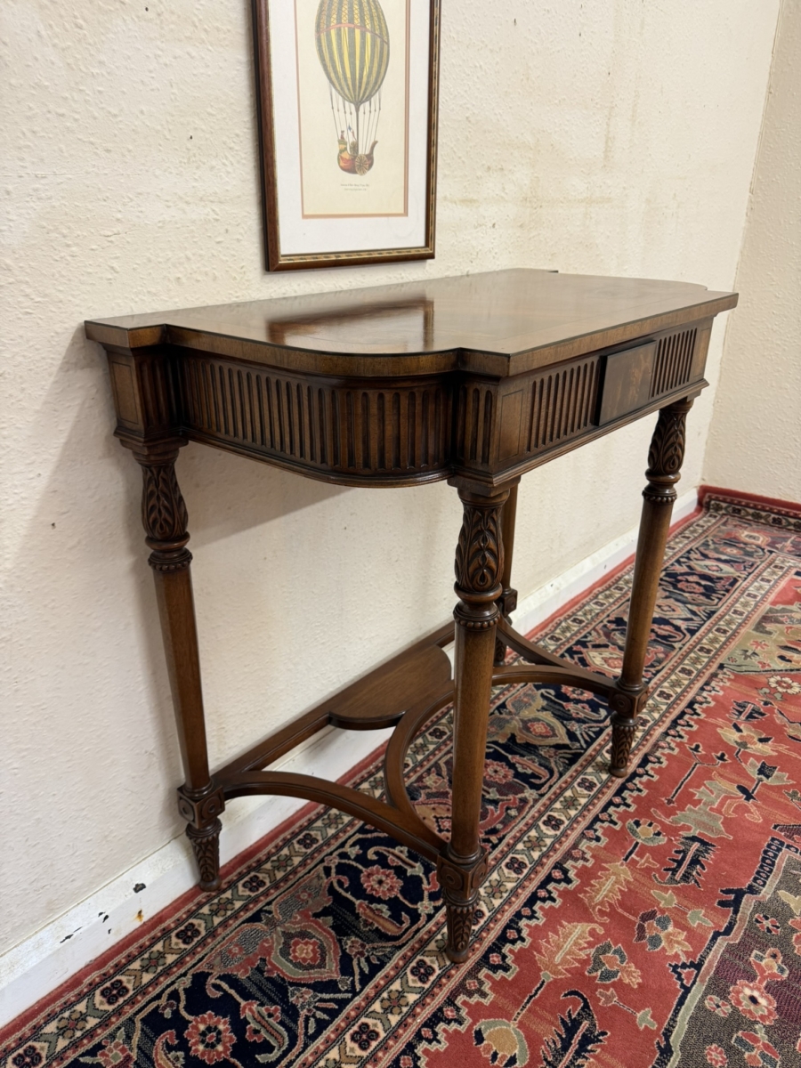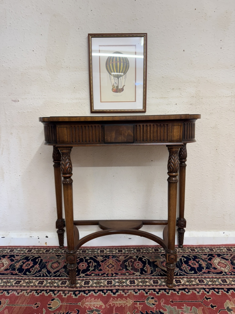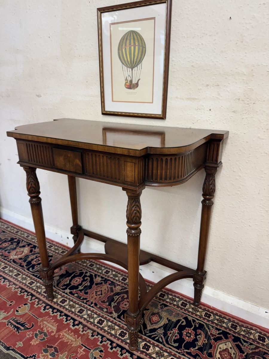 The shaped over sailing top has a cross banded edge, carving below, four carved legs, swept stretcher support and standing on carved feet.