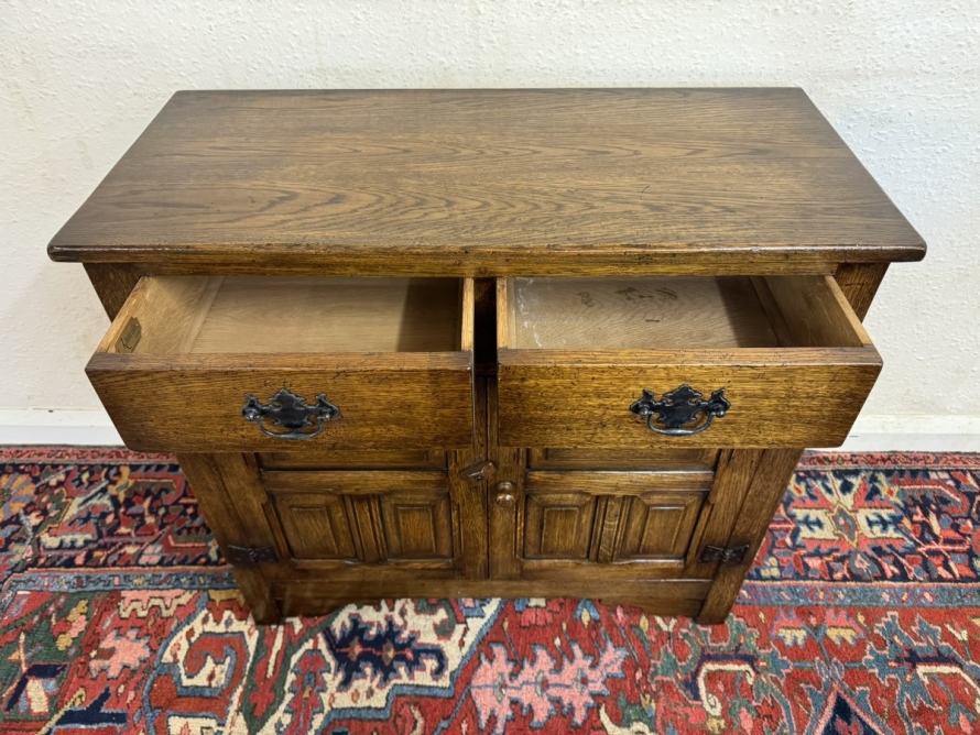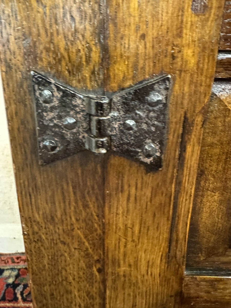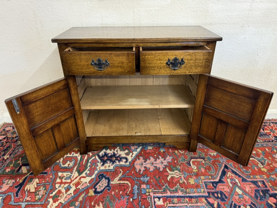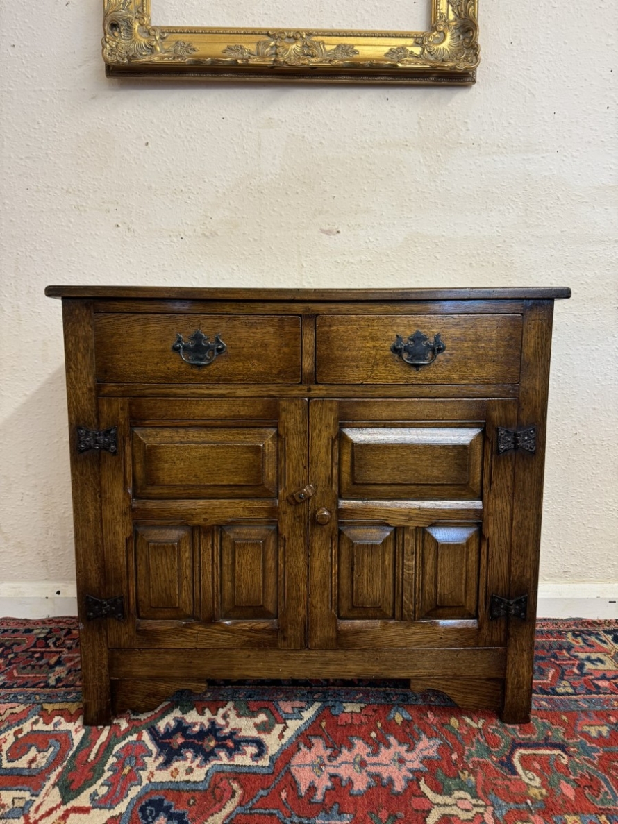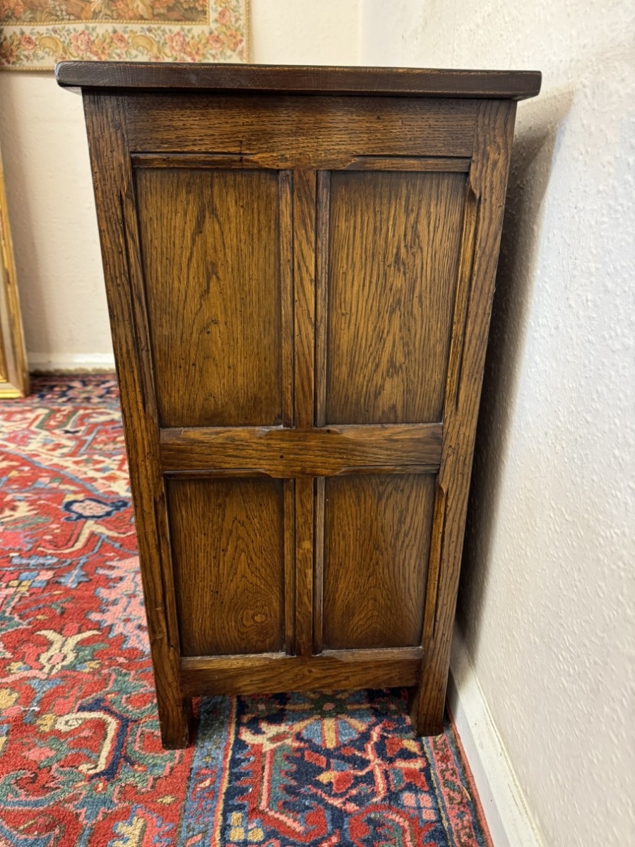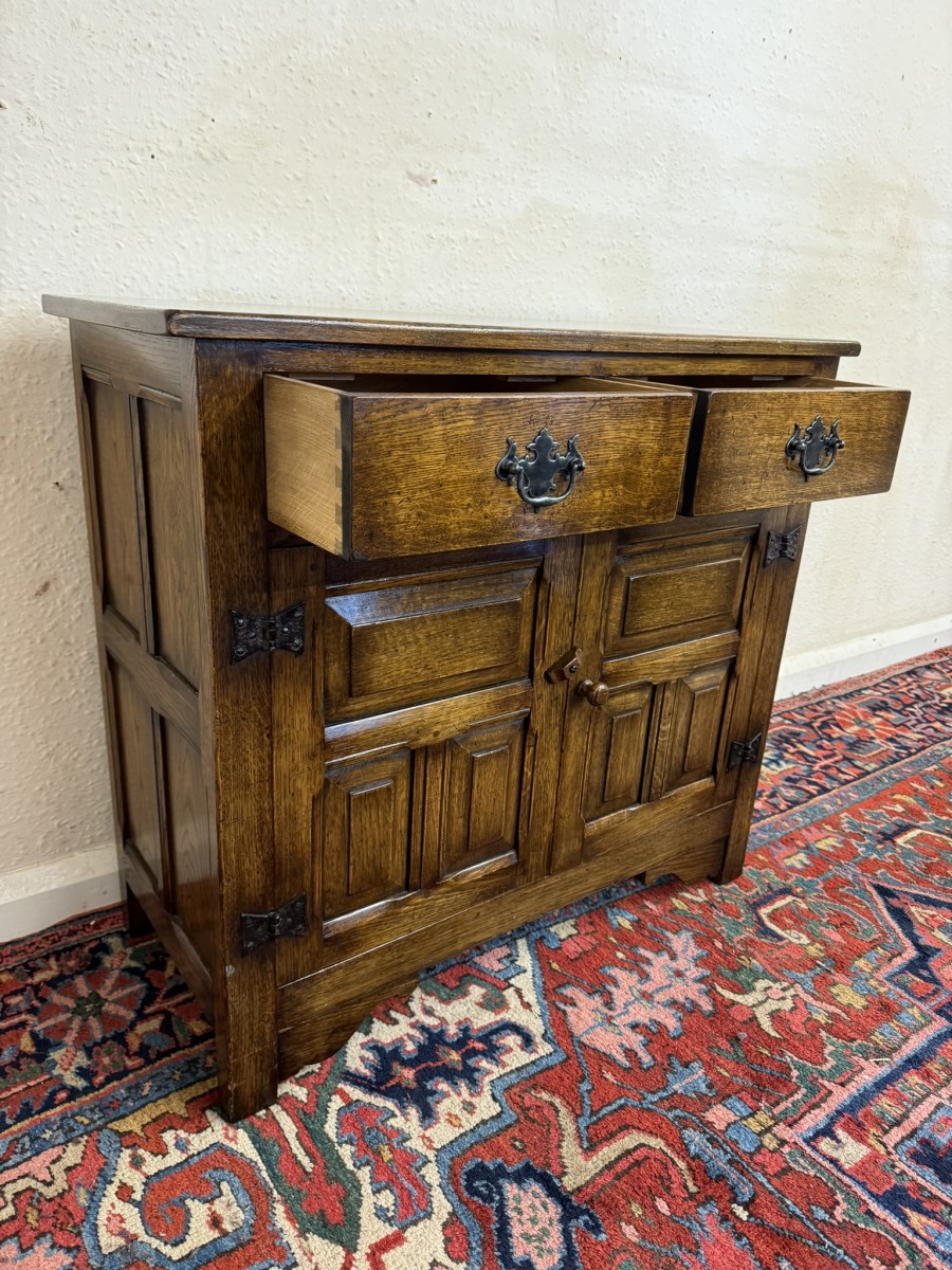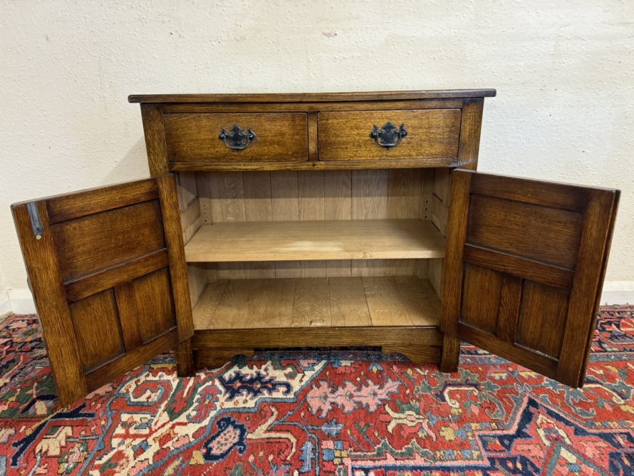 This fabulous cupboard is in excellent condition. The oversailing top has canted corners to the front, below are a pair of carved drawers, each drawer has a brass handle. Below is a pair of lockable carved recessed panelled doors, the doors open to reveal a removable shelf. Fielded panel sides, canted corners to the front and standing on two turned feet to the front.