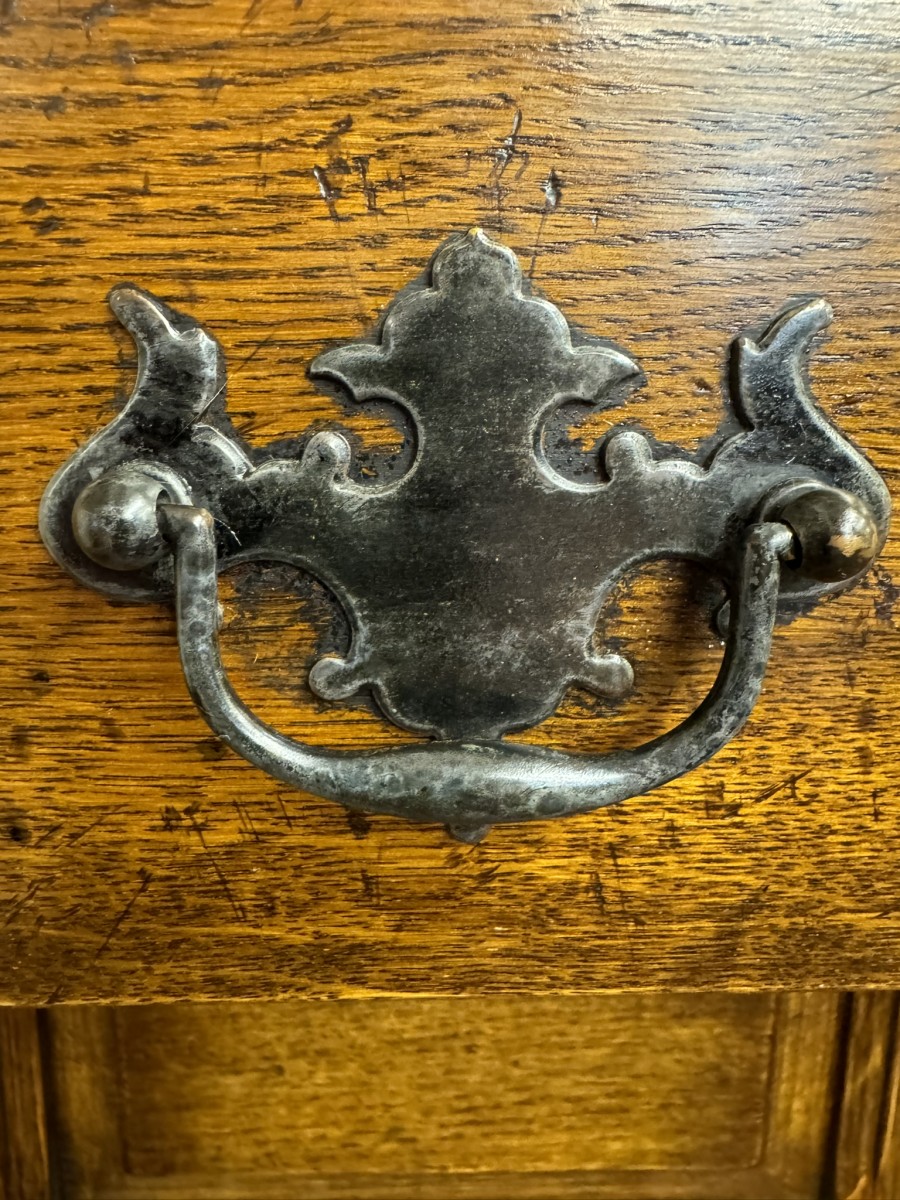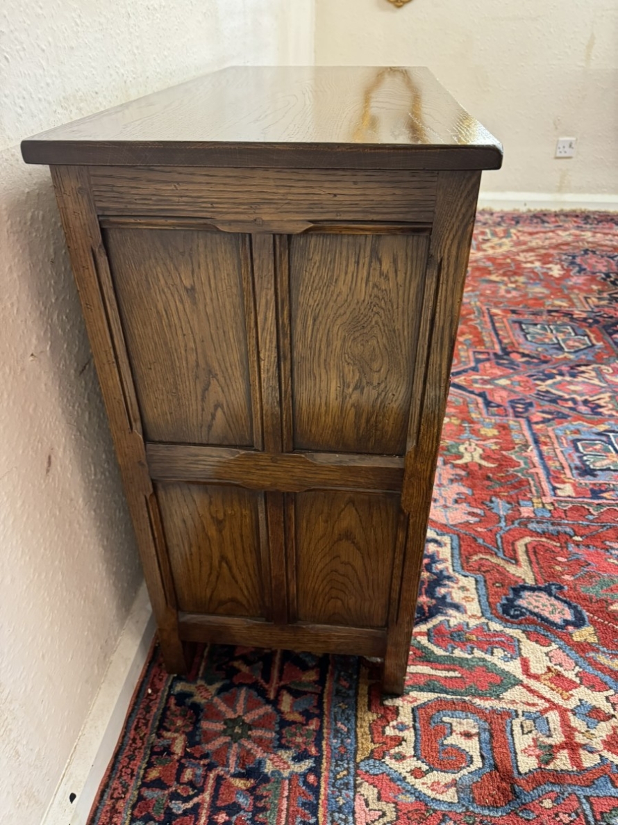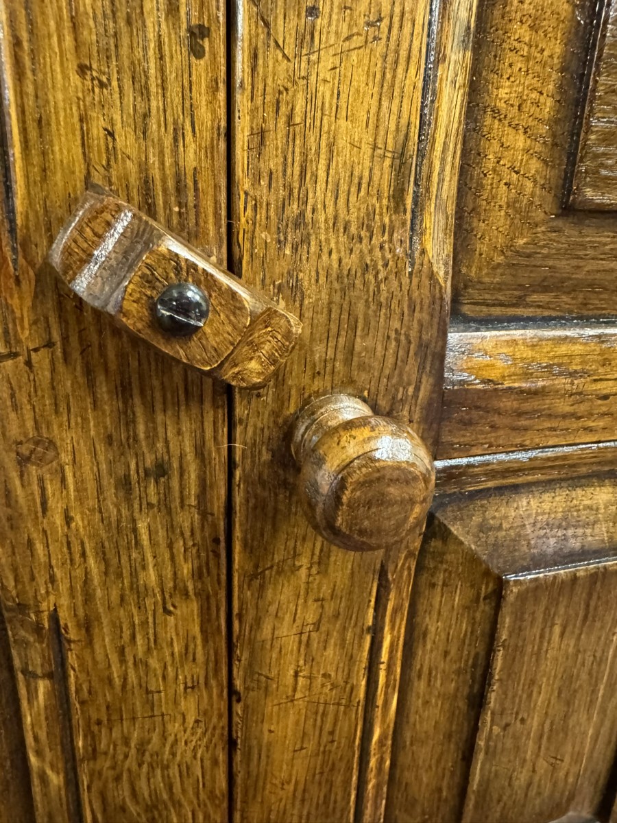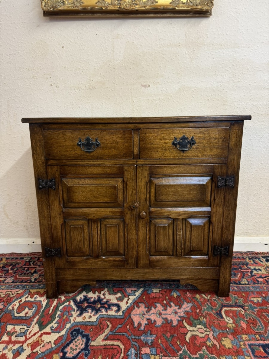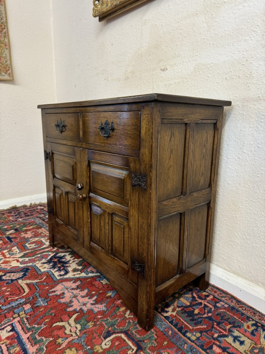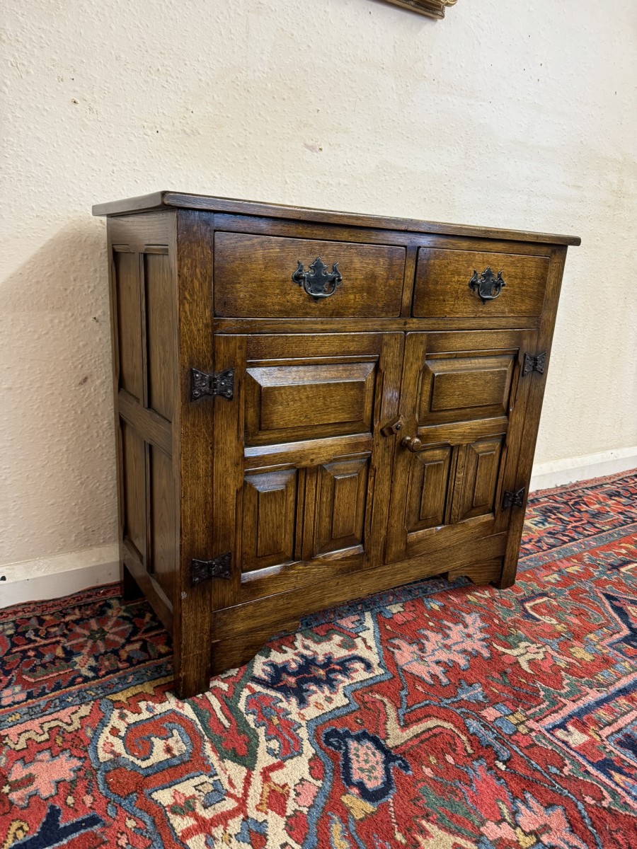 This fabulous cupboard is in excellent condition. The oversailing top has canted corners to the front, below are a pair of carved drawers, each drawer has a brass handle. Below is a pair of lockable carved recessed panelled doors, the doors open to reveal a removable shelf. Fielded panel sides, canted corners to the front and standing on two turned feet to the front.