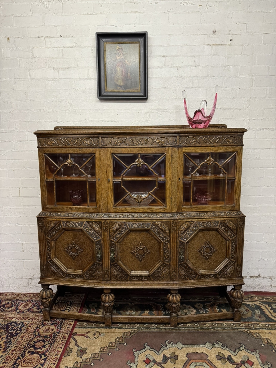 Made in fabulous solid oak this fabulous cabinet dates circa 1920 and is in excellent condition the quality is immense. The cabinet has a carved raised back rail which sits above three lockable bevel edged glazed doors with fantastic wood barring decoration. The doors open to reveal a removable shelf. Below are three fantastically carved lockable doors, the organic carvings throughout this cabinet are clear and crisp. The doors open to reveal a removable shelf. The cabinet has four carved bulbous legs to the front with stretcher supports..