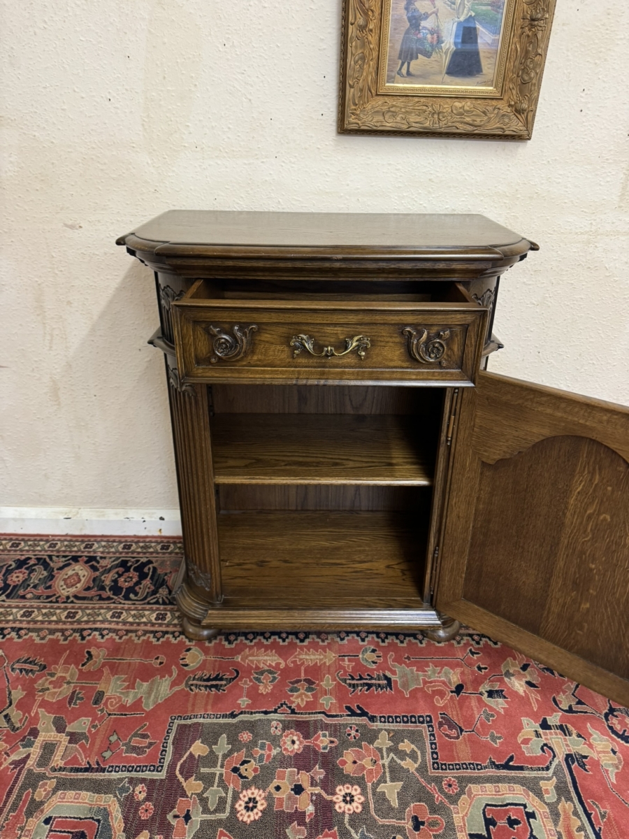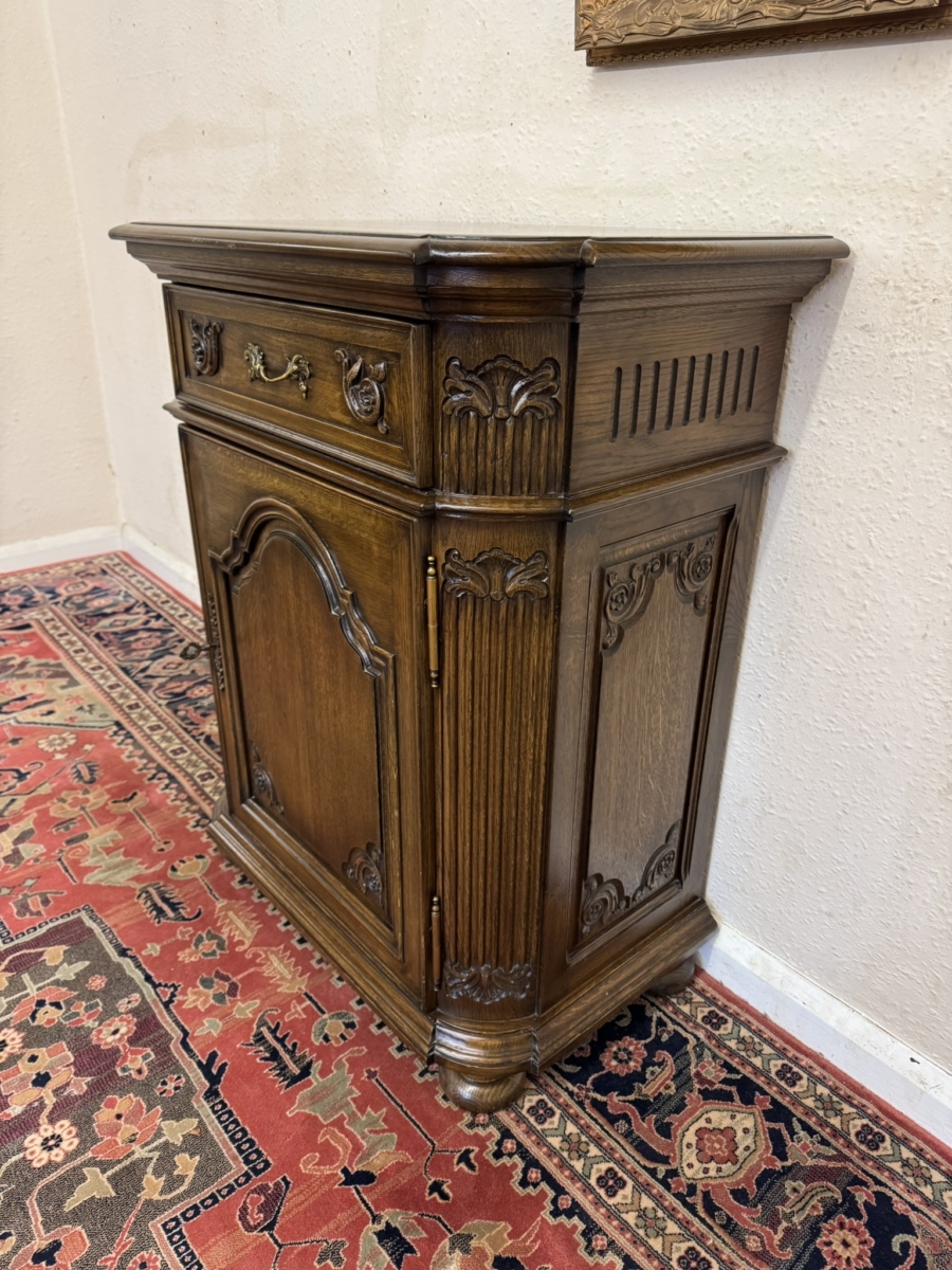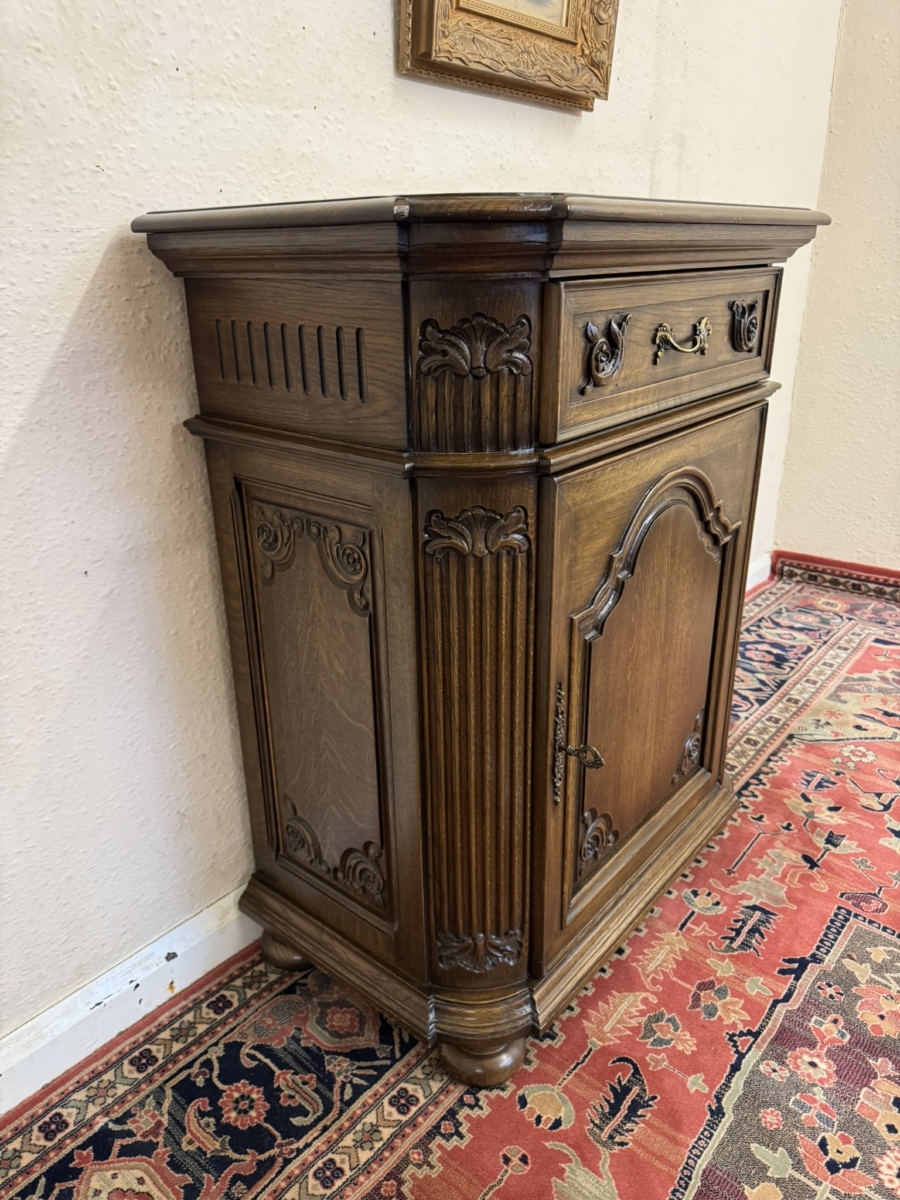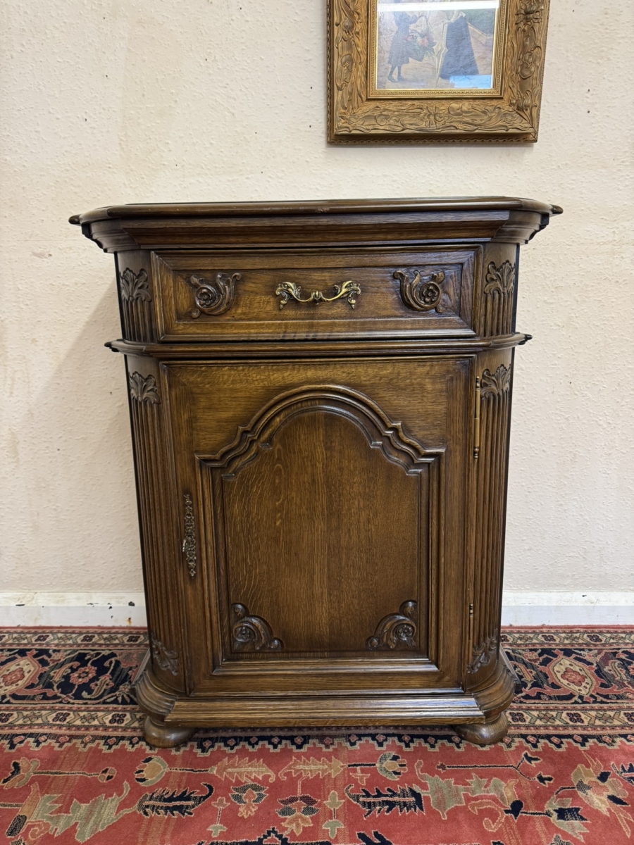 This cupboard is in excellent condition. The shaped over sailing top sits above a carved drawer, the drawer has an ornate brass handle. Lockable arched fielded panelled door below which has carvings, brass hinges, decorative brass escutcheon and key. The door opens to reveal an adjustable shelf. Carved canted front, carved sides and standing on four turned feet. Please note we are also listing a matching cupboard (as pictured).