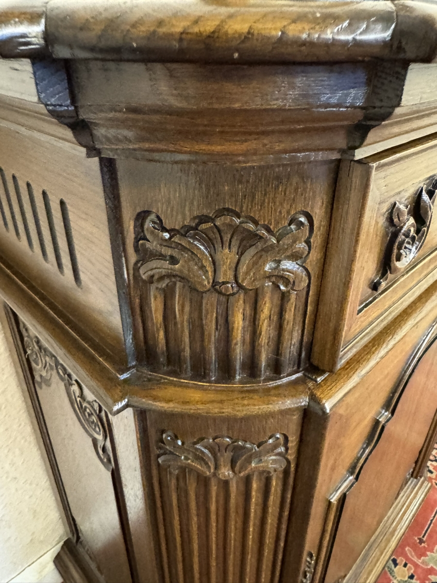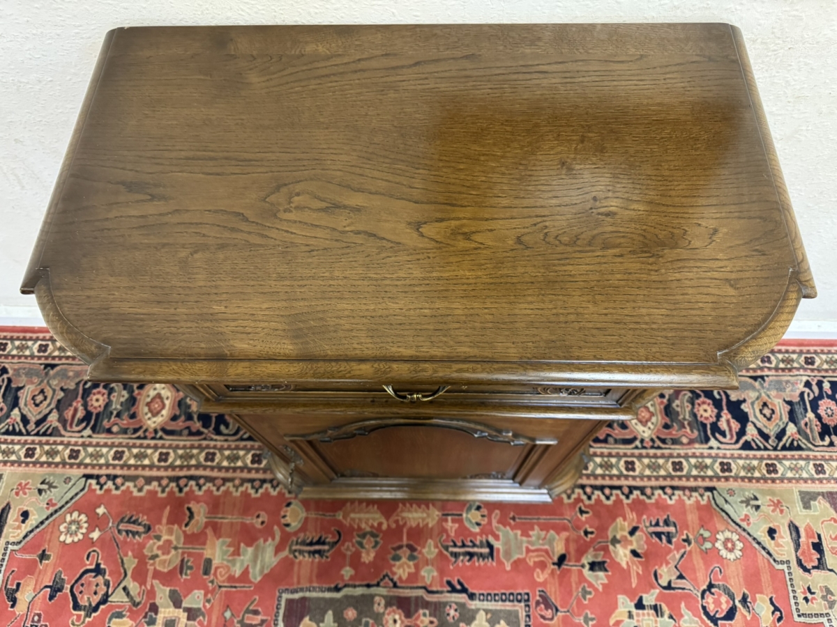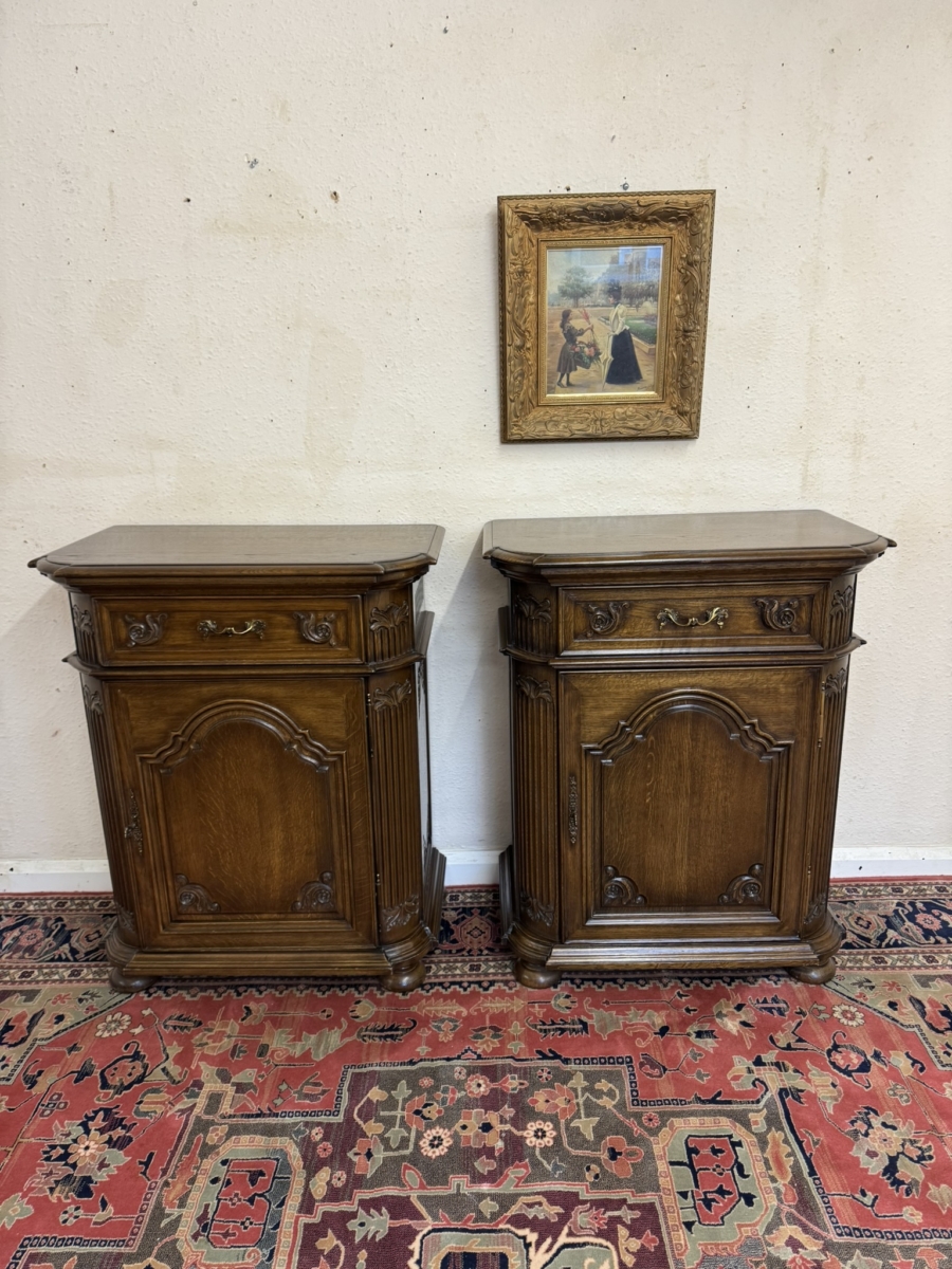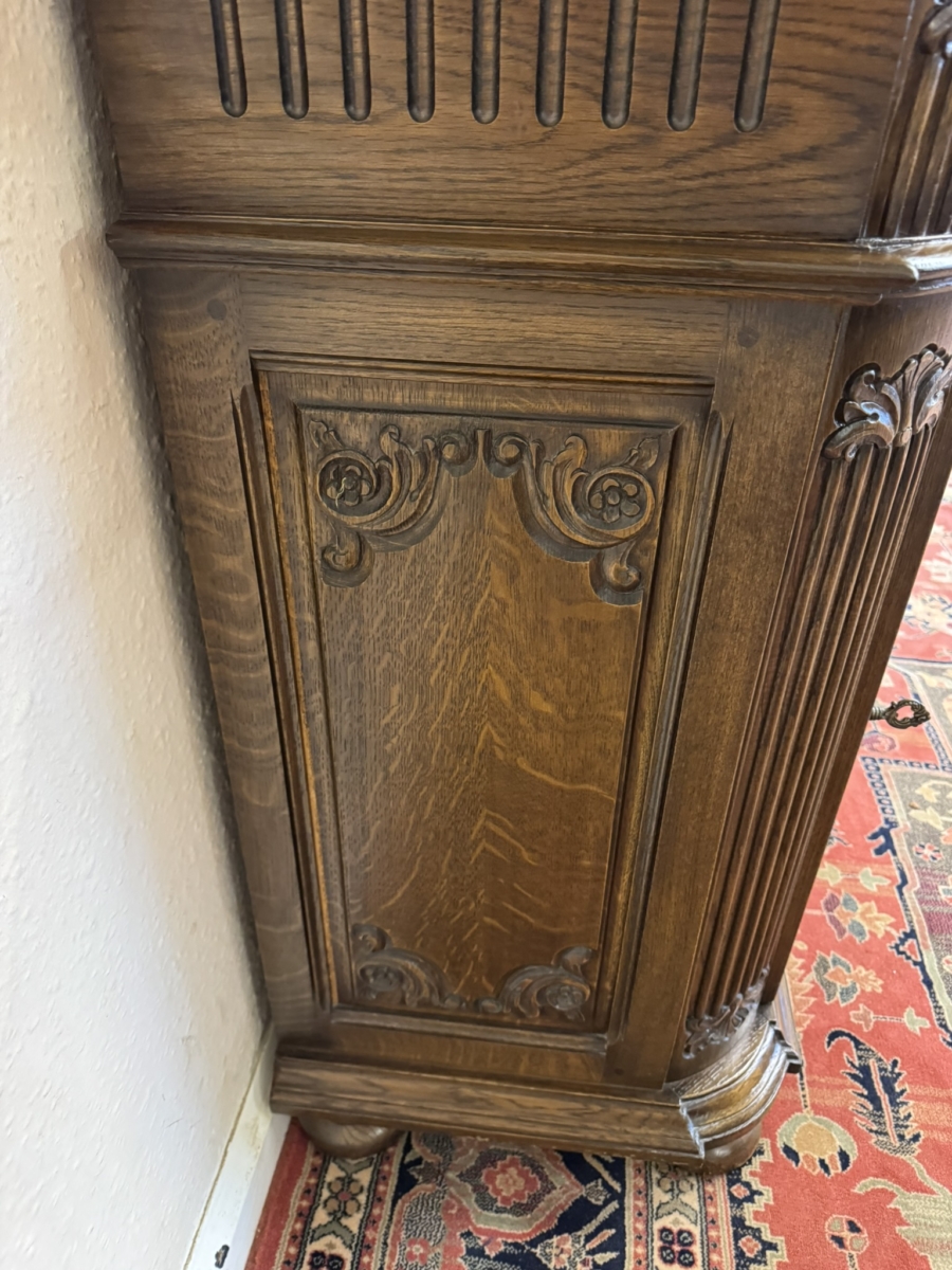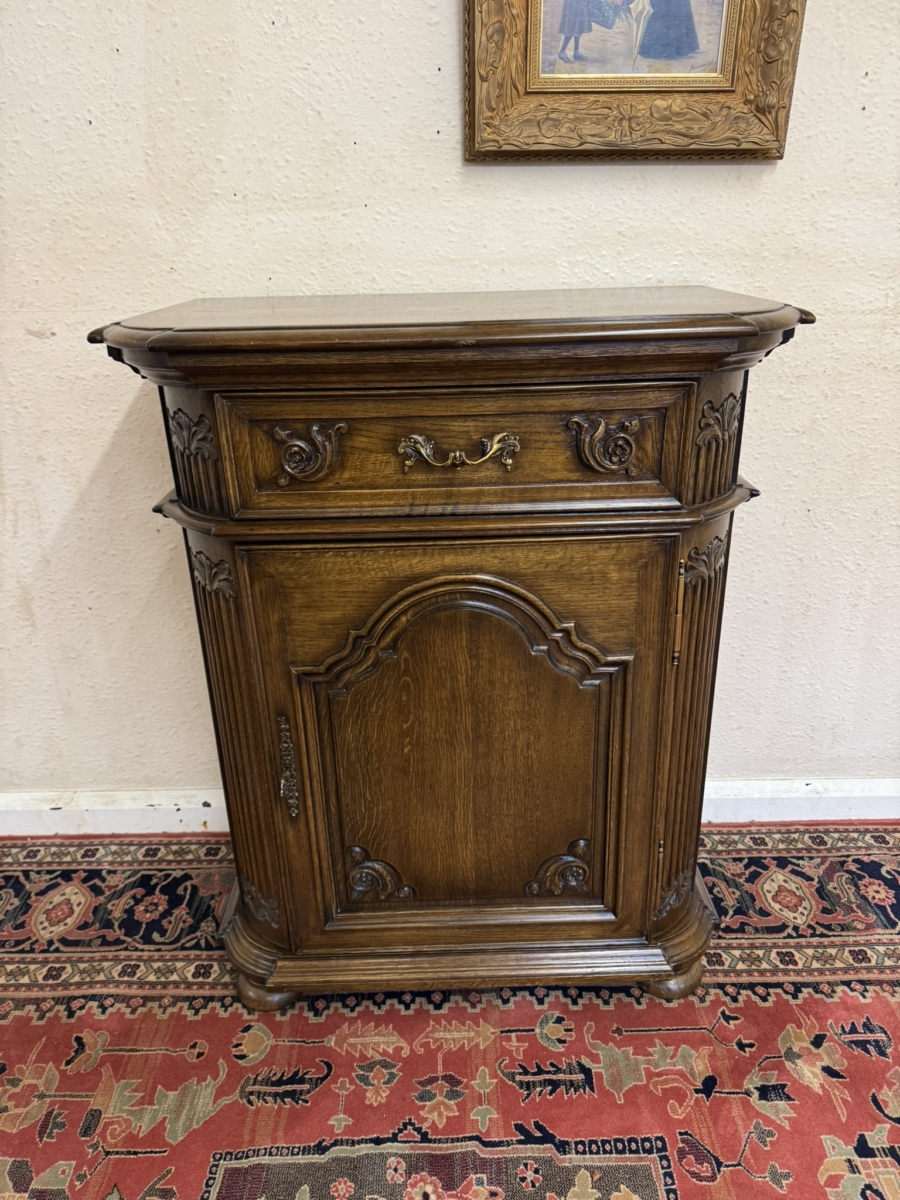 This cupboard is in excellent condition. The shaped over sailing top sits above a carved drawer, the drawer has an ornate brass handle. Lockable arched fielded panelled door below which has carvings, brass hinges, decorative brass escutcheon and key. The door opens to reveal an adjustable shelf. Carved canted front, carved sides and standing on four turned feet. Please note we are also listing a matching cupboard (as pictured).