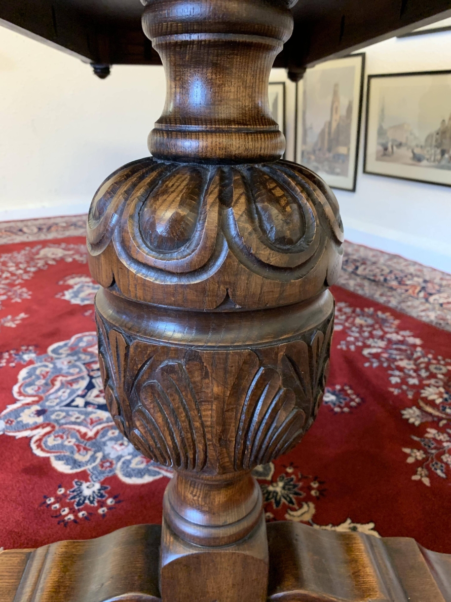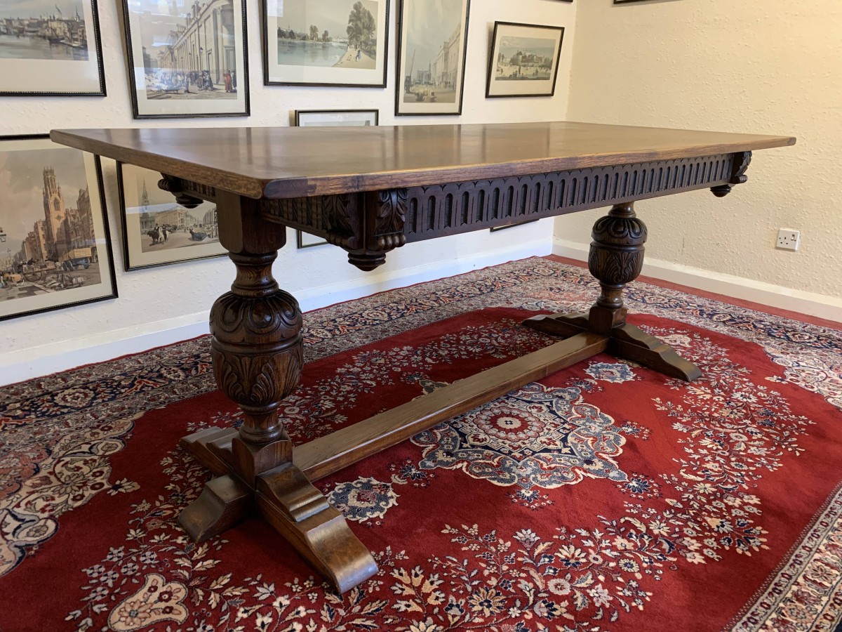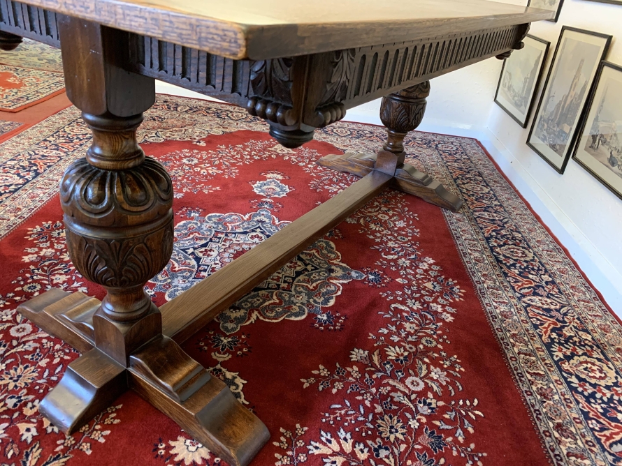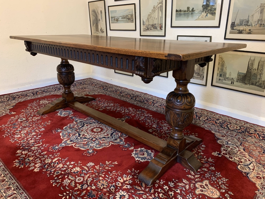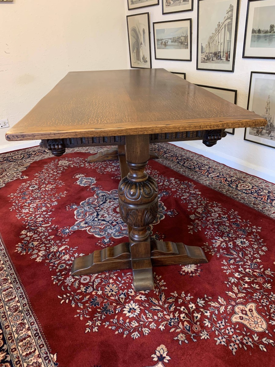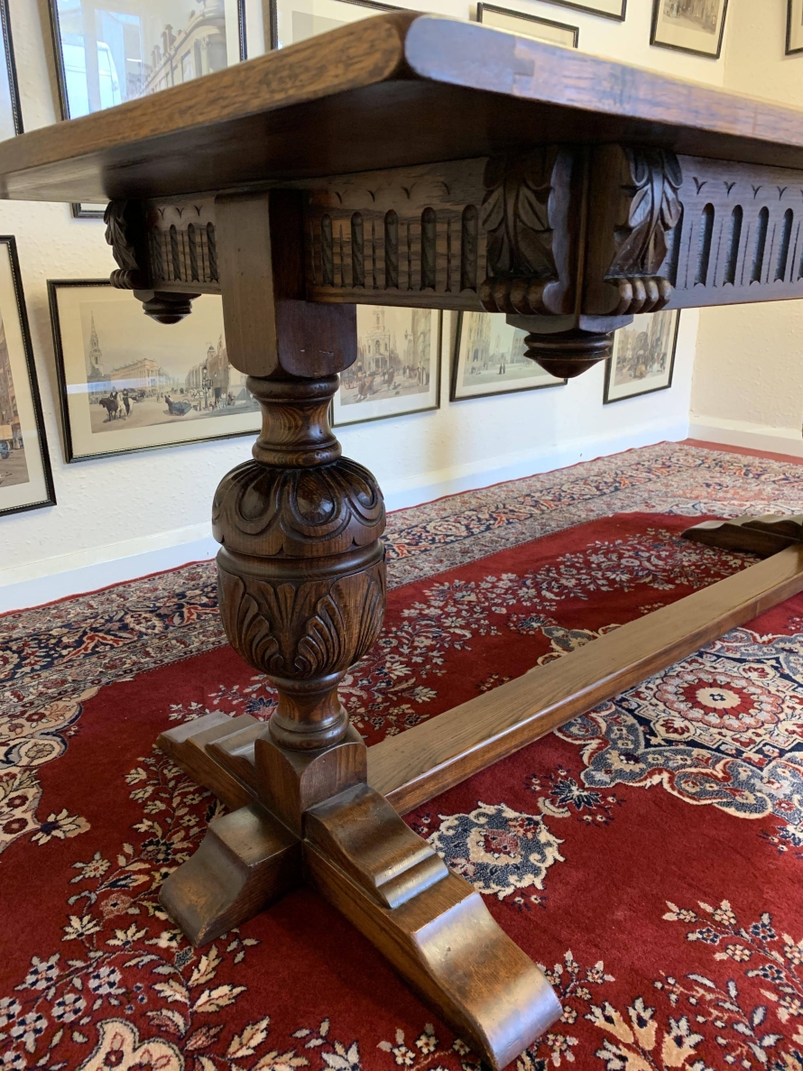 A super table made from glorious solid oak and produced by the renowned Bevan Funnell furniture makers. The oversailing inch thick top sits on a beautiful carved base. The four sides are each carved, below are two supremely carved bulbous legs with three shaped plinth feet supported by impressive stretcher. This heavy quality table is in excellent condition. Please note also listing a matching set of six oak ladderback chairs.