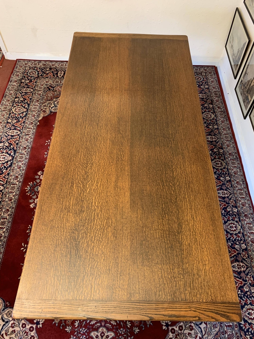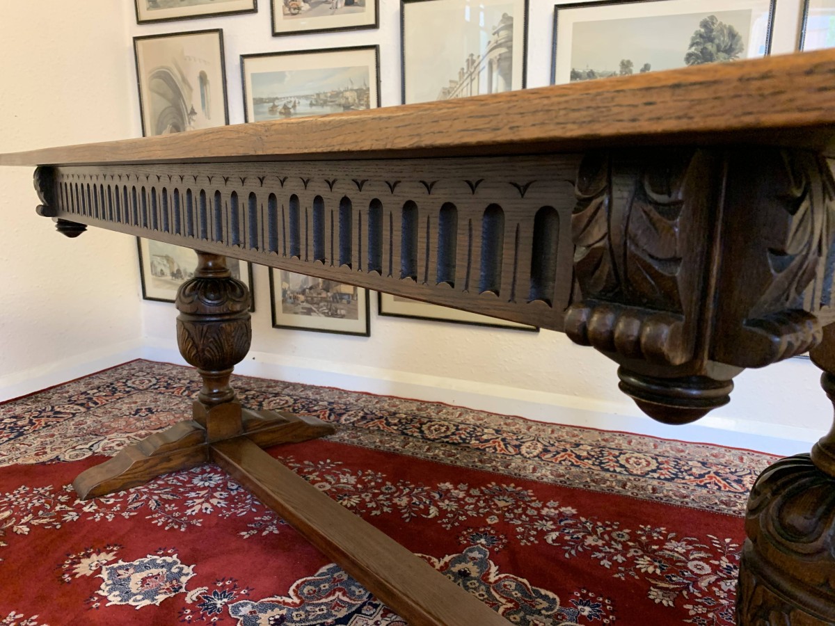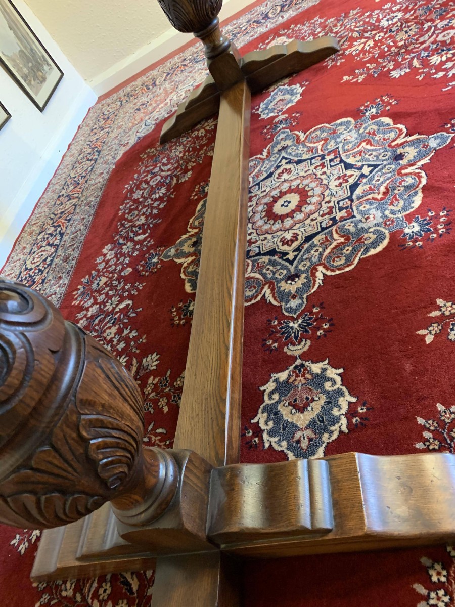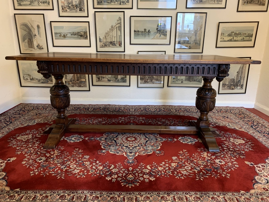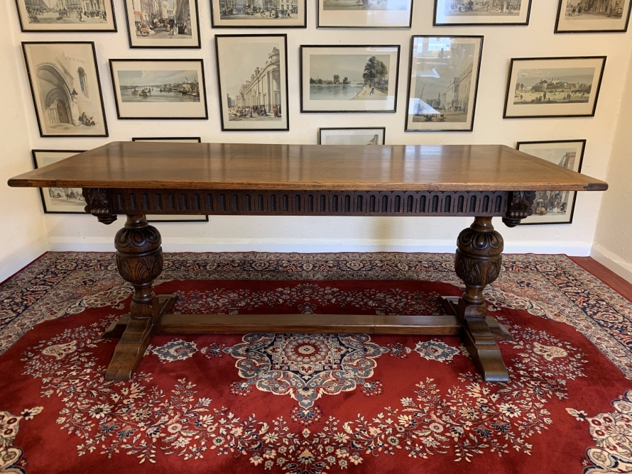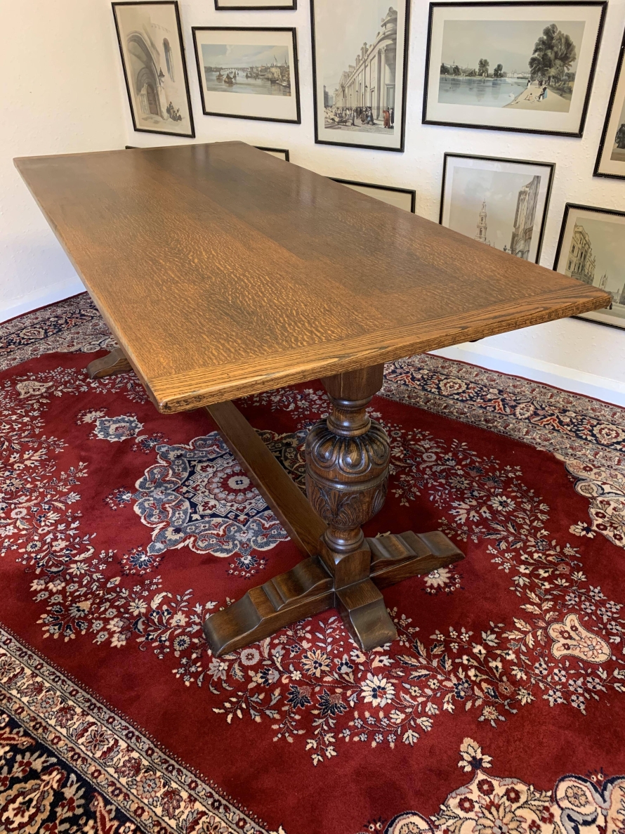 A super table made from glorious solid oak and produced by the renowned Bevan Funnell furniture makers. The oversailing inch thick top sits on a beautiful carved base. The four sides are each carved, below are two supremely carved bulbous legs with three shaped plinth feet supported by impressive stretcher. This heavy quality table is in excellent condition. Please note also listing a matching set of six oak ladderback chairs.