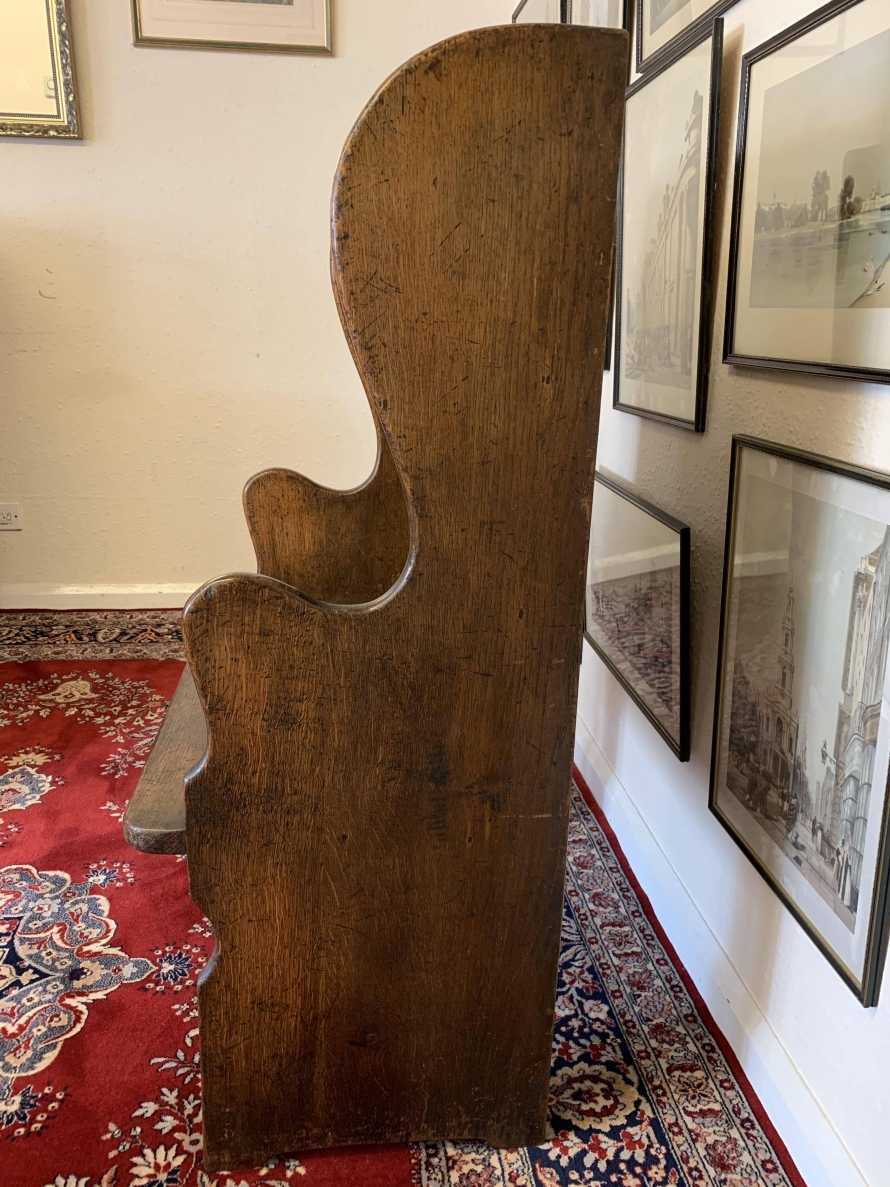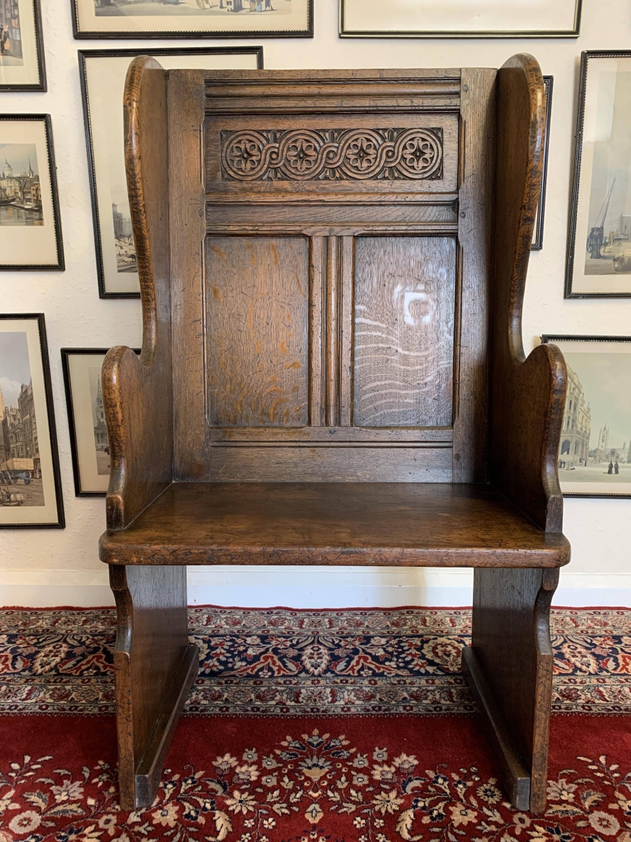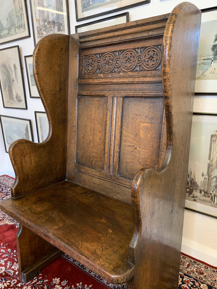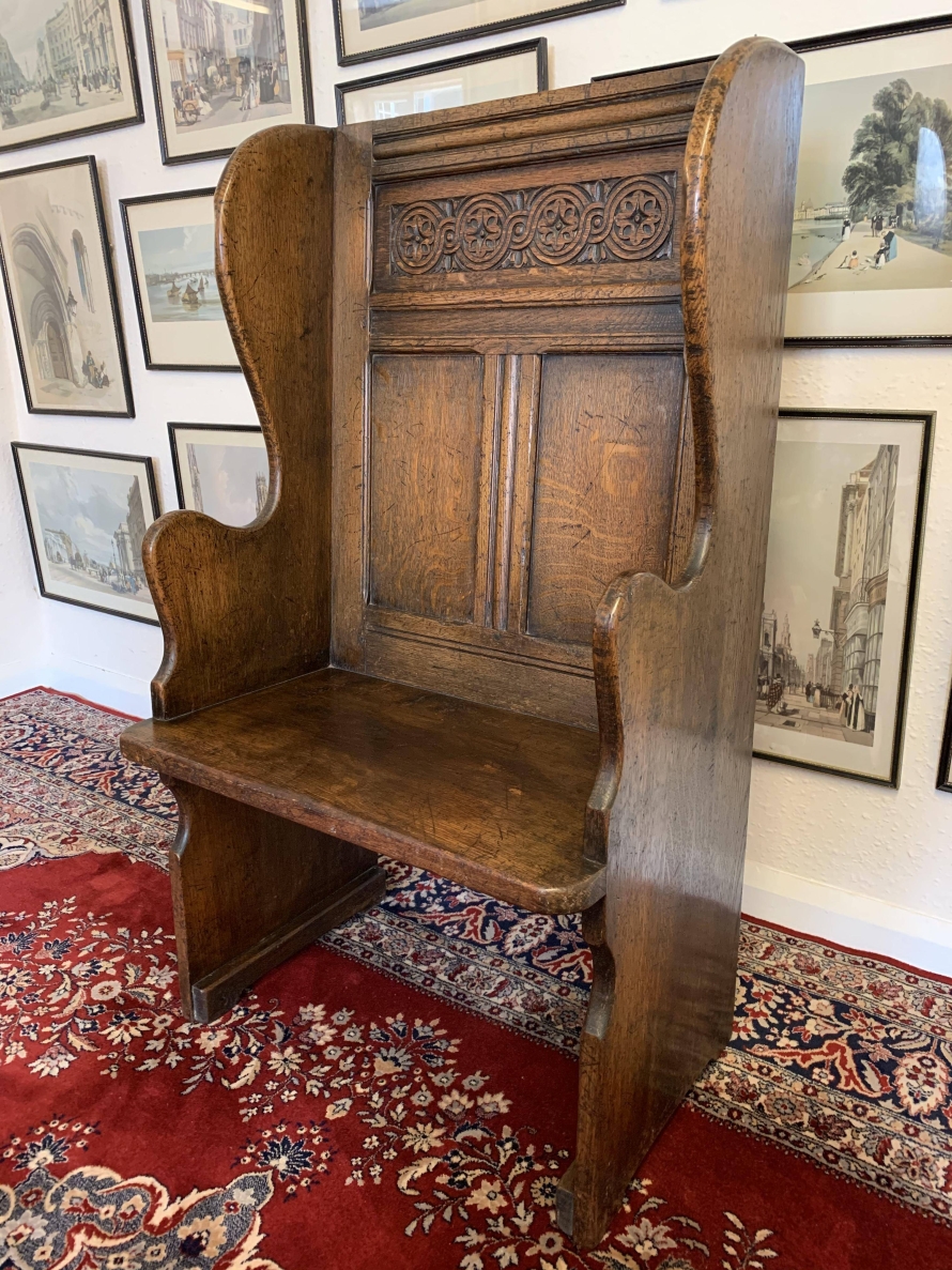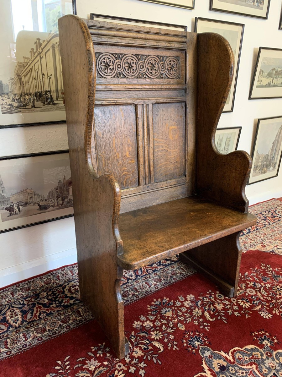 A desirable item of furniture made entirely from solid oak, this seat would grace any home. The settle has a carved back above two recessed panels, shaped arms and oak seat.