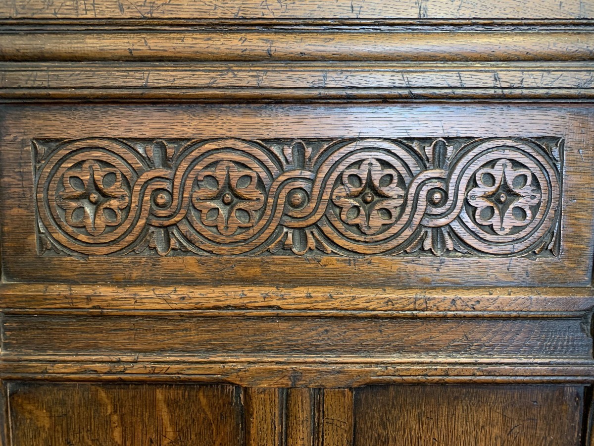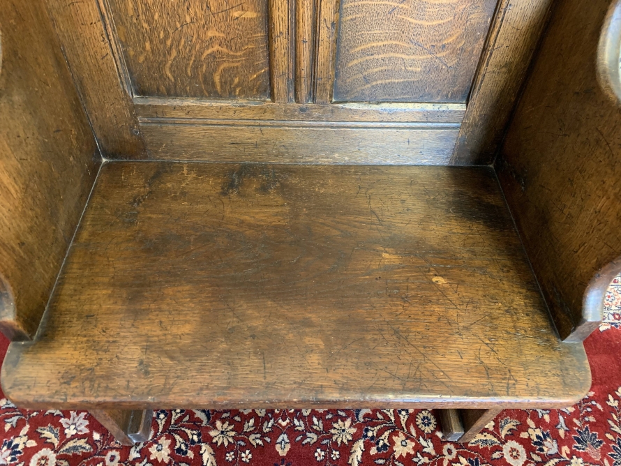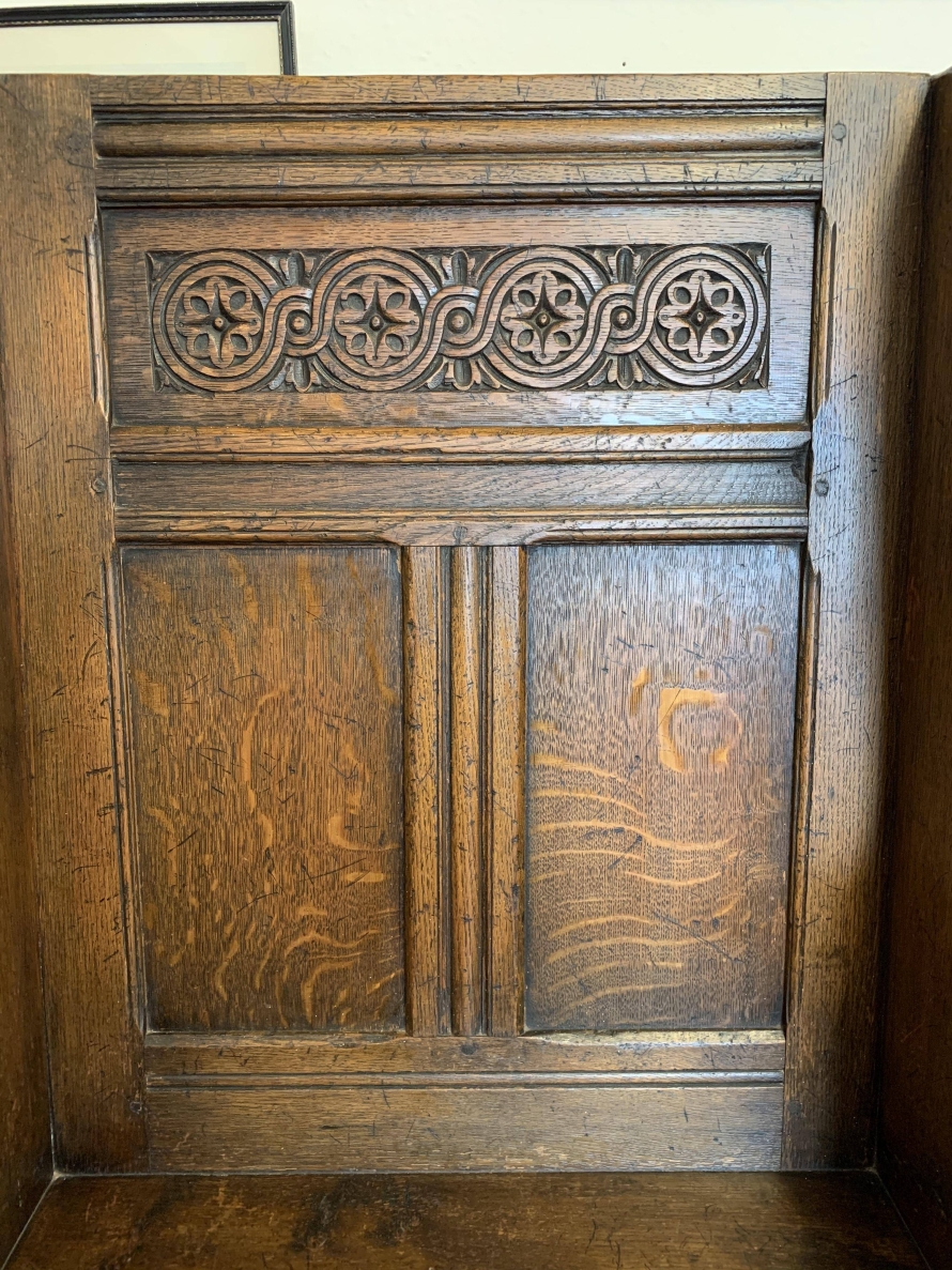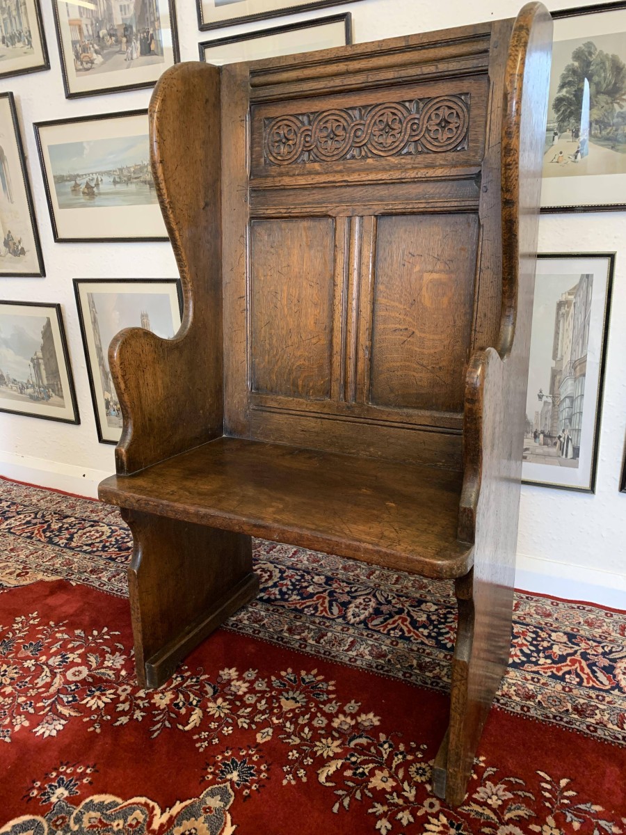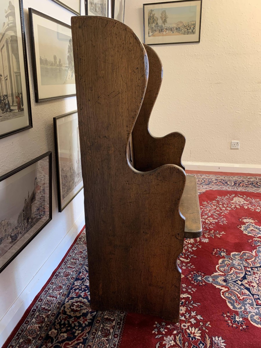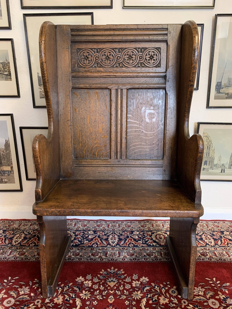 A desirable item of furniture made entirely from solid oak, this seat would grace any home. The settle has a carved back above two recessed panels, shaped arms and oak seat.