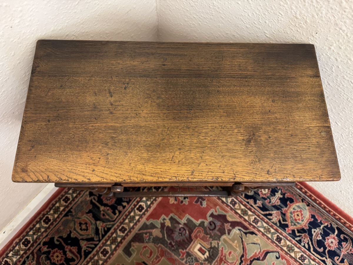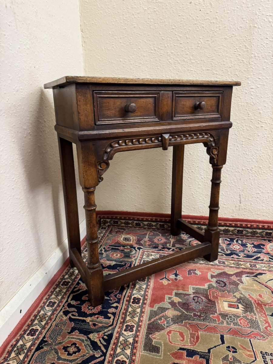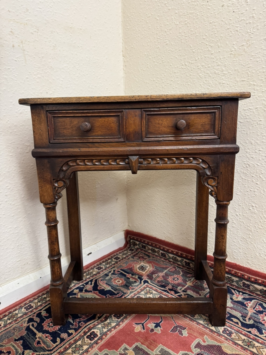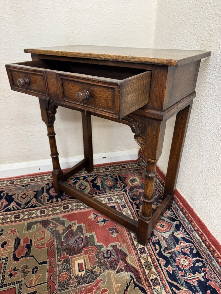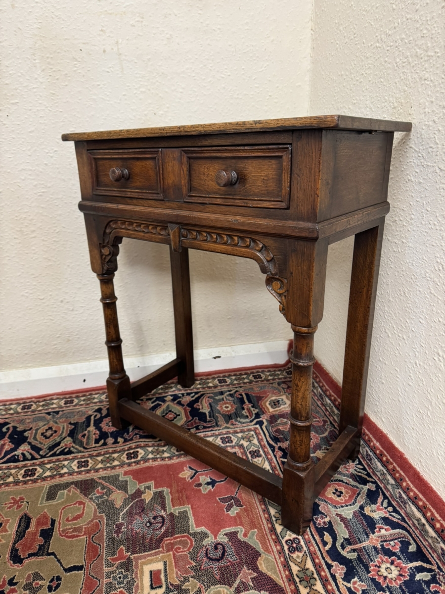 This is top quality solid oak side table was made by the renowned Titchmarsh and Goodwin furniture makers. Grained oak through out and in excellent condition. The over sailing top sits above a single drawer, the drawer having a pair of turned handles. Carved frieze below, turned legs to the front, stretcher supports and standing on traditional block feet.