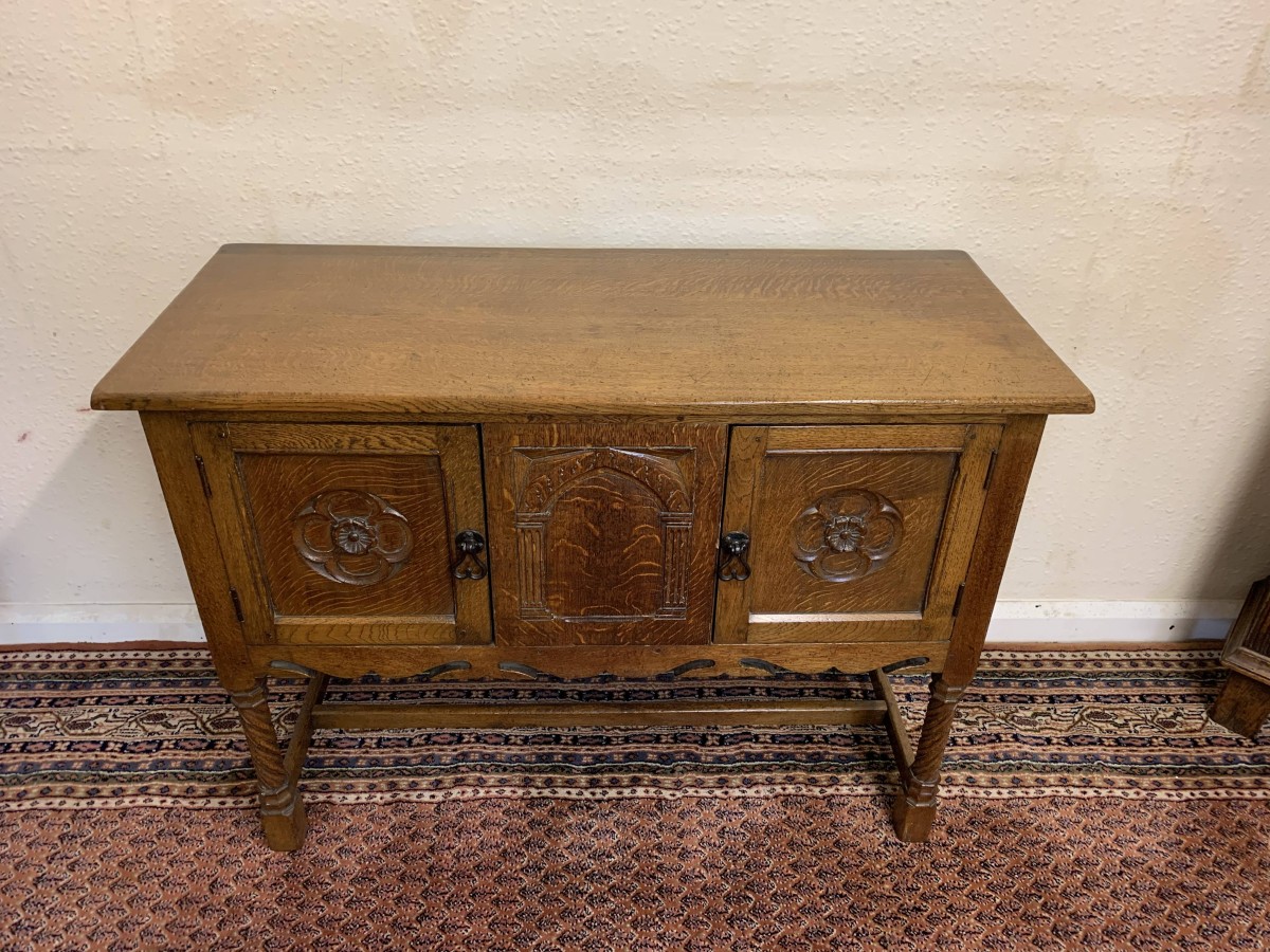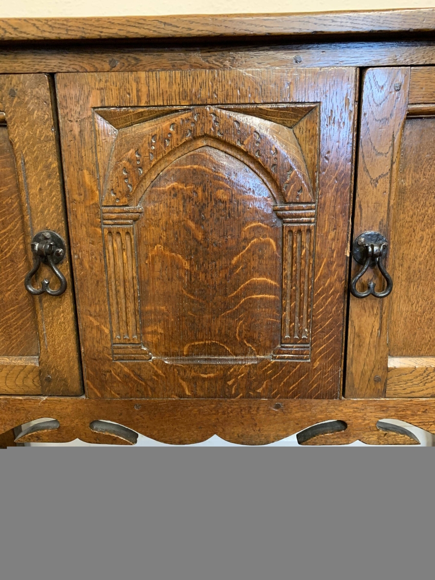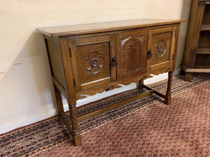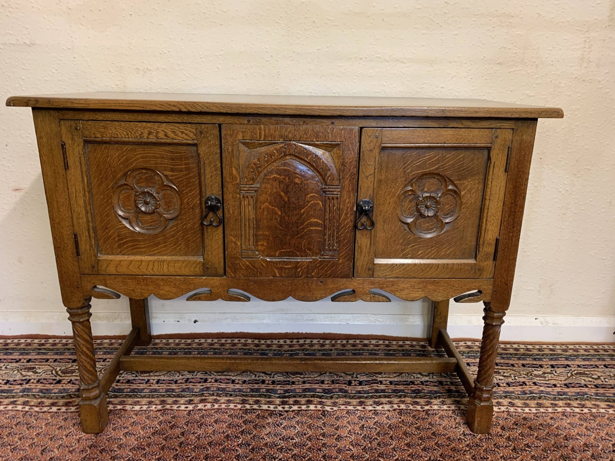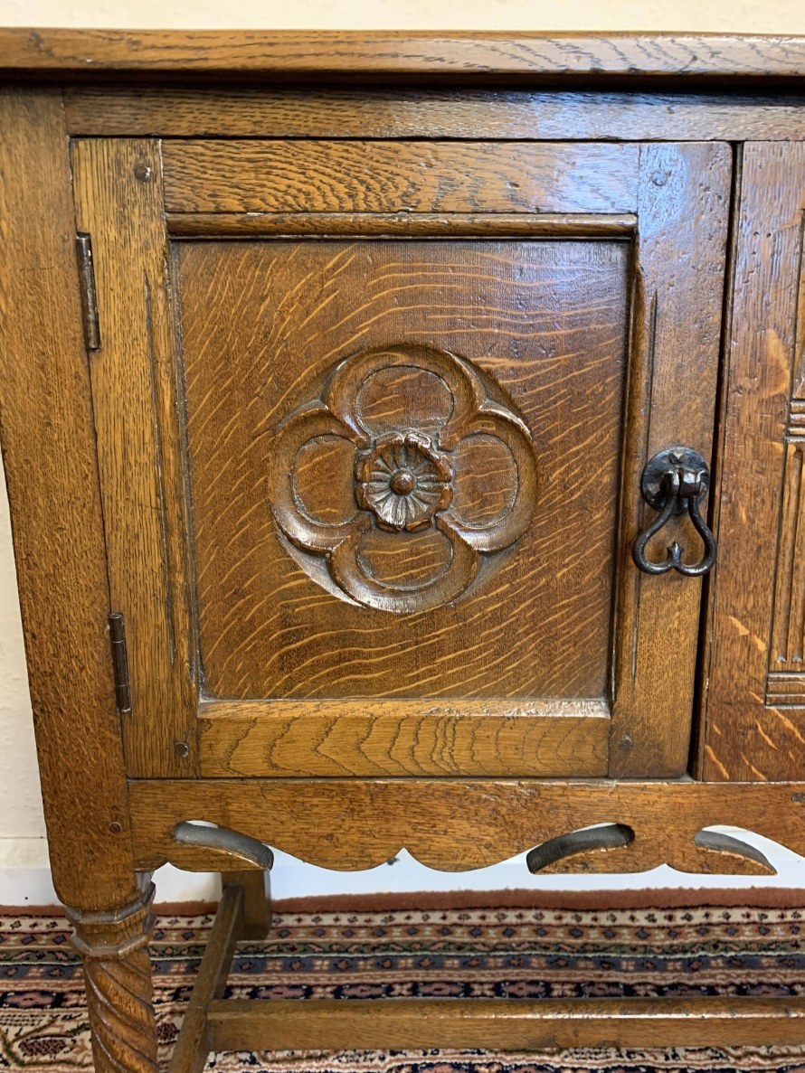 A super item of furniture which is made entirely of solid oak. The oversailing top sits above a fixed carved recessed centre panel. The centre panel is flanked by a pair of carved recessed panelled cupboard doors, each door having drop handle with locking latch. The doors open to reveal ample storage space. The base and back have oak panels. Recessed panelled sides, shaped freeze to the front This fantastic quality item of furniture stands on carved twist legs to the front supported with stretches. Please note this item is in excellent condition.