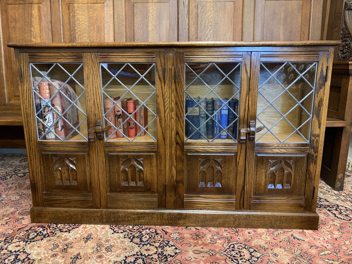Made entirely in solid oak this bookcase is in excellent condition and was made by the renowned Webber furniture company. The oversailing top sits above four lockable doors each door having a leaded glass panel which sits above a carved panel. The doors have an oak locking latch. The doors open to reveal an adjustable and removable shelf. This quality bookcase stands on a plinth base.