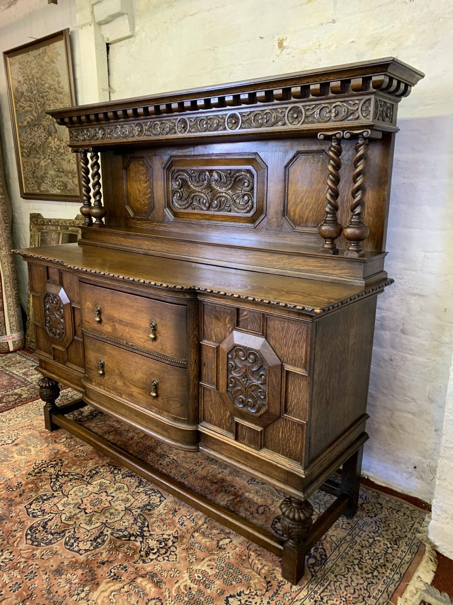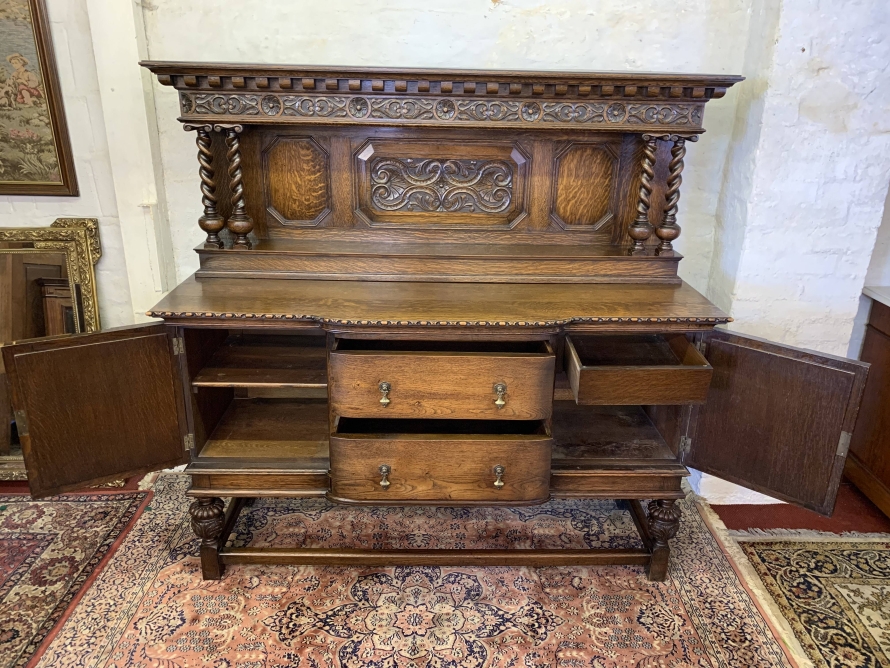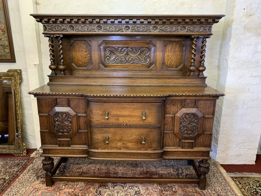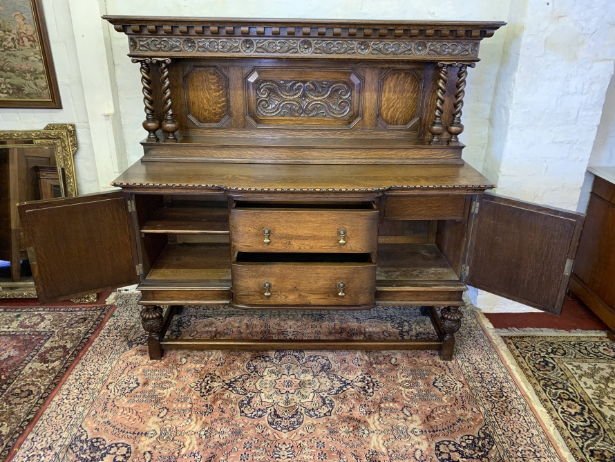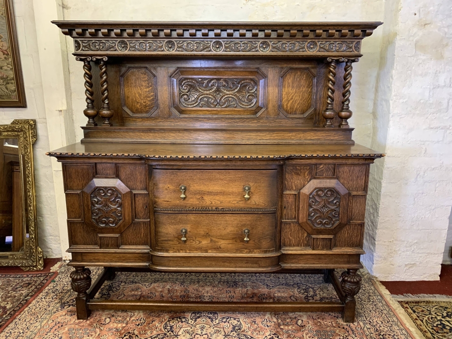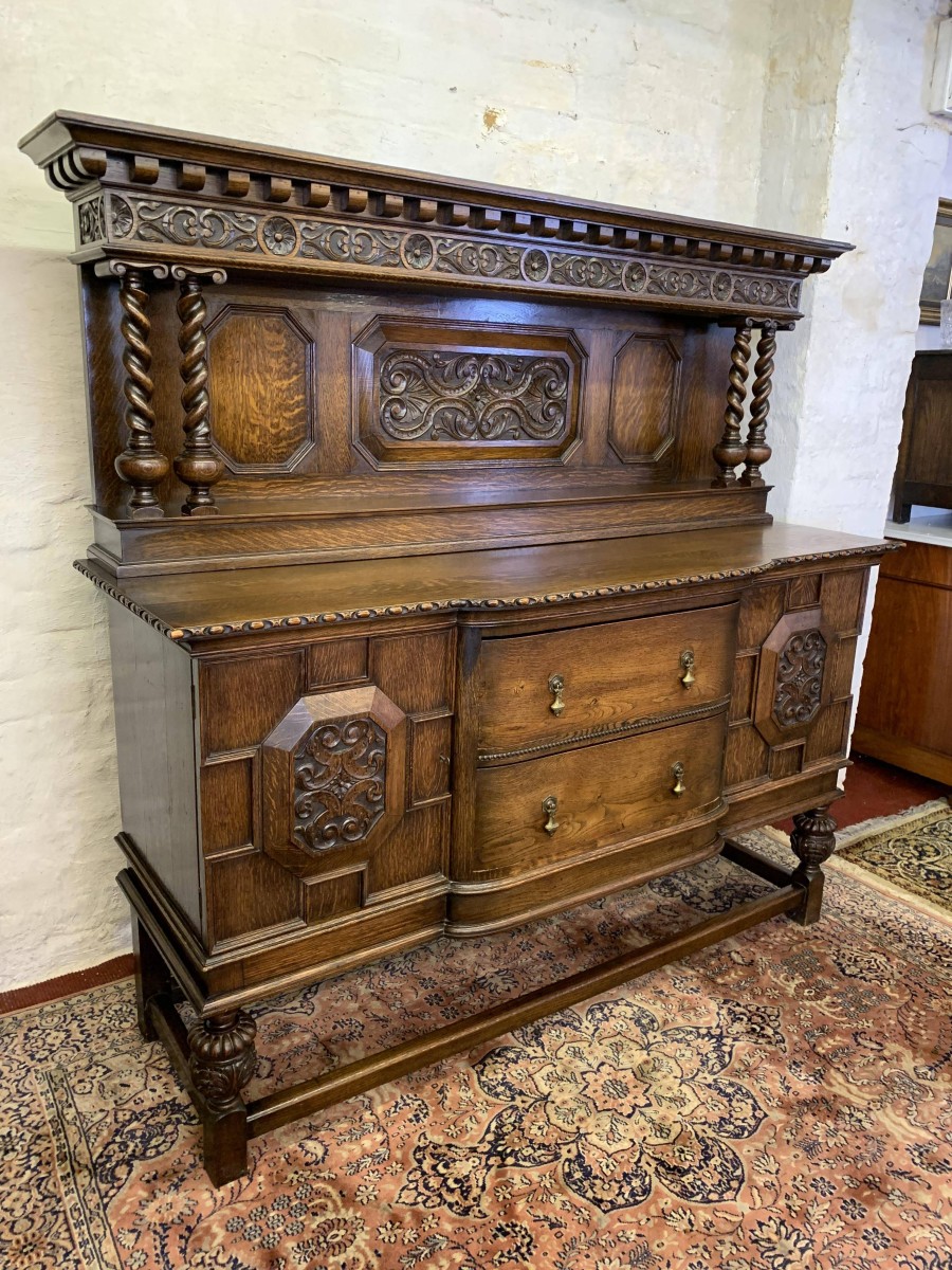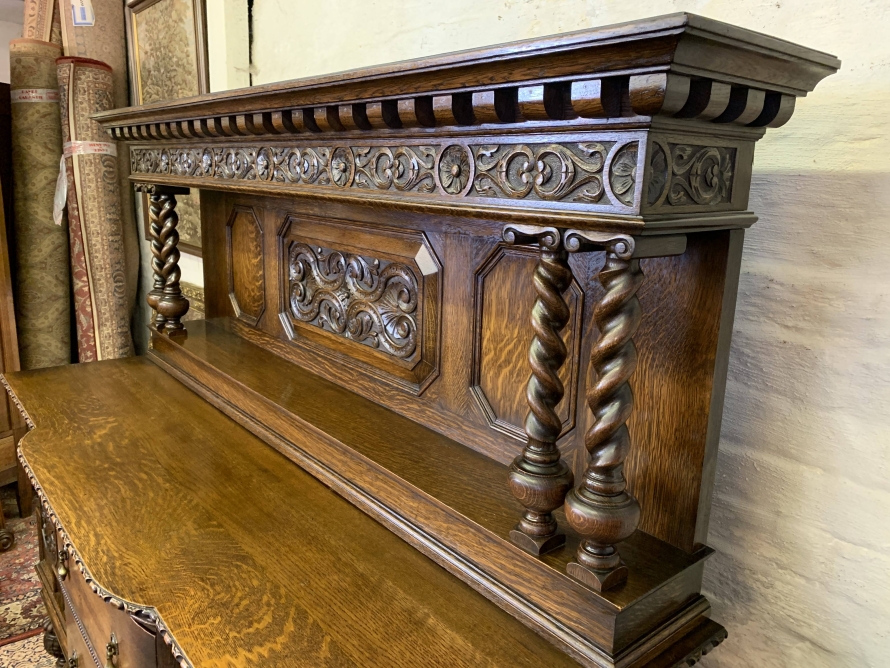 This fabulous dresser dating circa 1920 is in excellent condition. The back has an oversailing top with carved decoration below. Carved shaped central panel is flanked by a pair of shaped panels. The top has four impressive barley twist turned supports. The base section has carved edging. Below are two central shaped drawers, each drawer having a pair of brass droplet handles. The central drawers are flanked by a pair of carved recessed panelled lockable doors. The left-hand door opens to reveal a removable shelf, the right-hand door opens to reveal a drawer. The dresser stands on two carved turned legs to the front, stretcher supports and standing on traditional block feet.