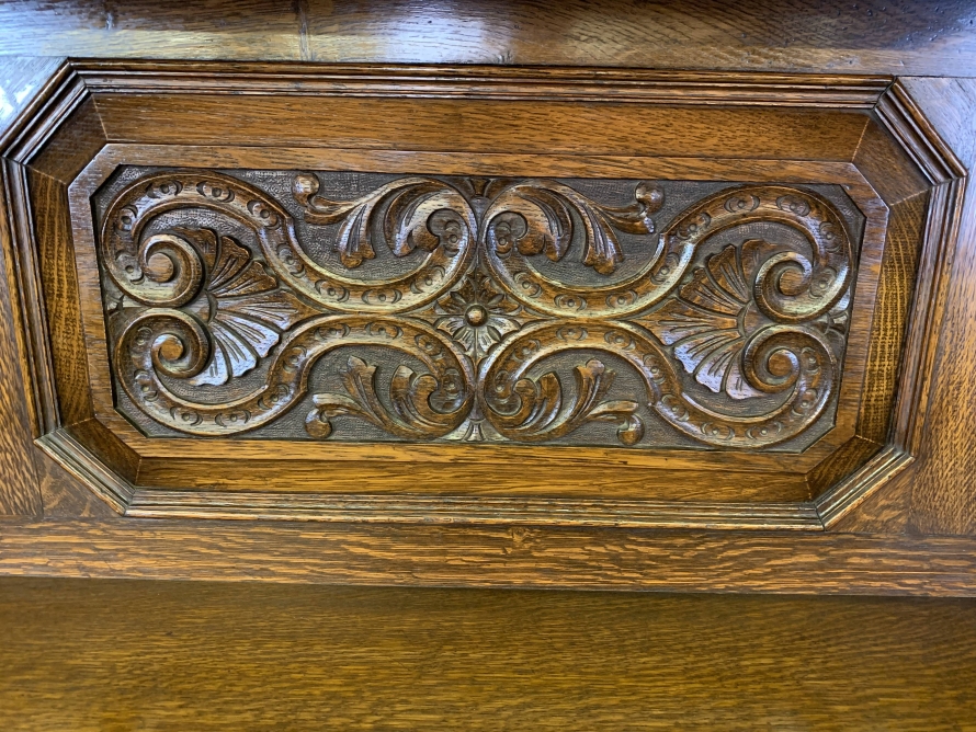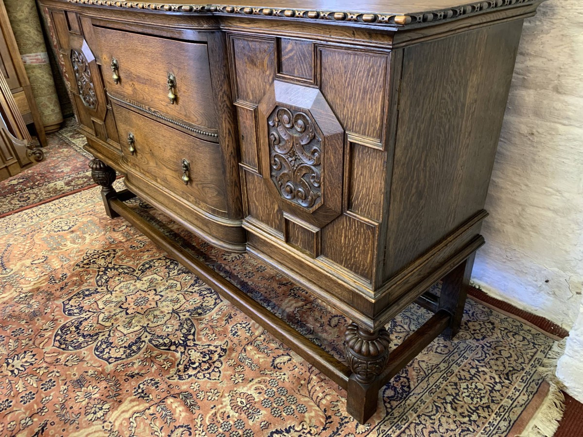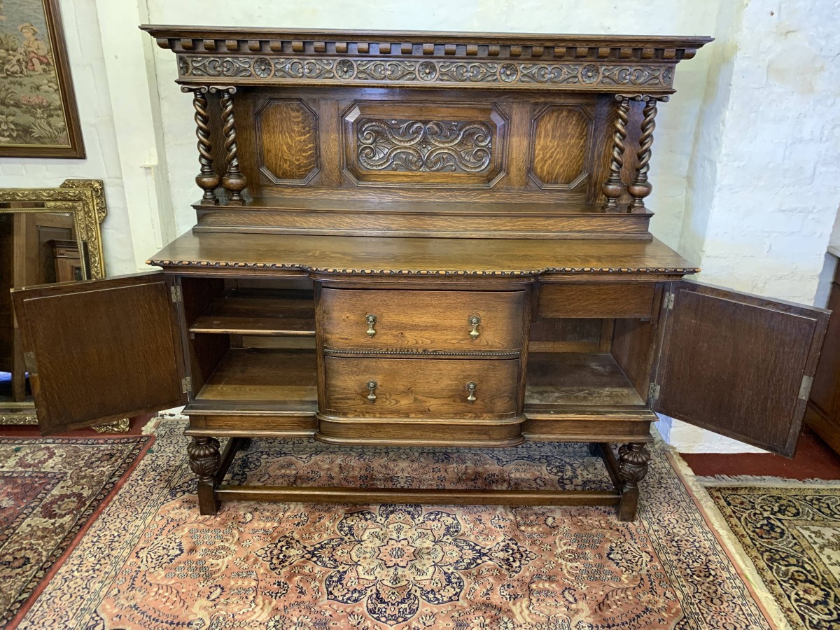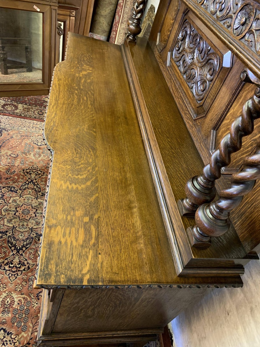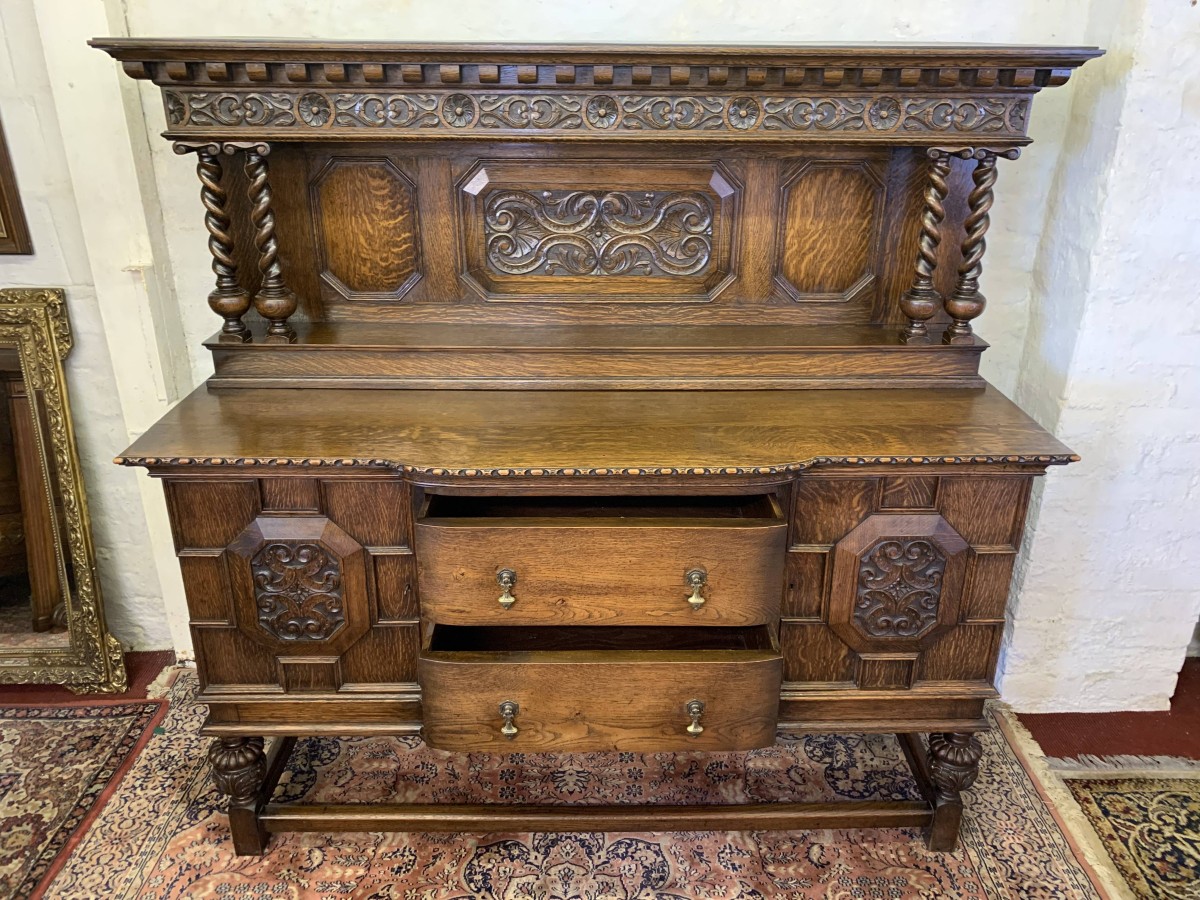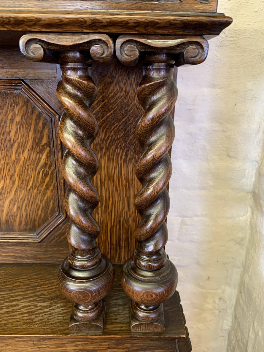 This fabulous dresser dating circa 1920 is in excellent condition. The back has an oversailing top with carved decoration below. Carved shaped central panel is flanked by a pair of shaped panels. The top has four impressive barley twist turned supports. The base section has carved edging. Below are two central shaped drawers, each drawer having a pair of brass droplet handles. The central drawers are flanked by a pair of carved recessed panelled lockable doors. The left-hand door opens to reveal a removable shelf, the right-hand door opens to reveal a drawer. The dresser stands on two carved turned legs to the front, stretcher supports and standing on traditional block feet.