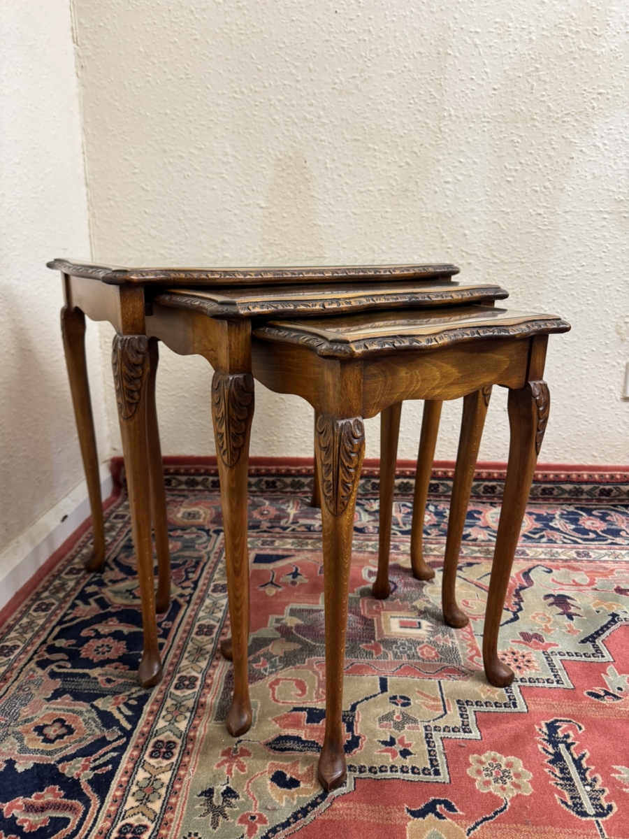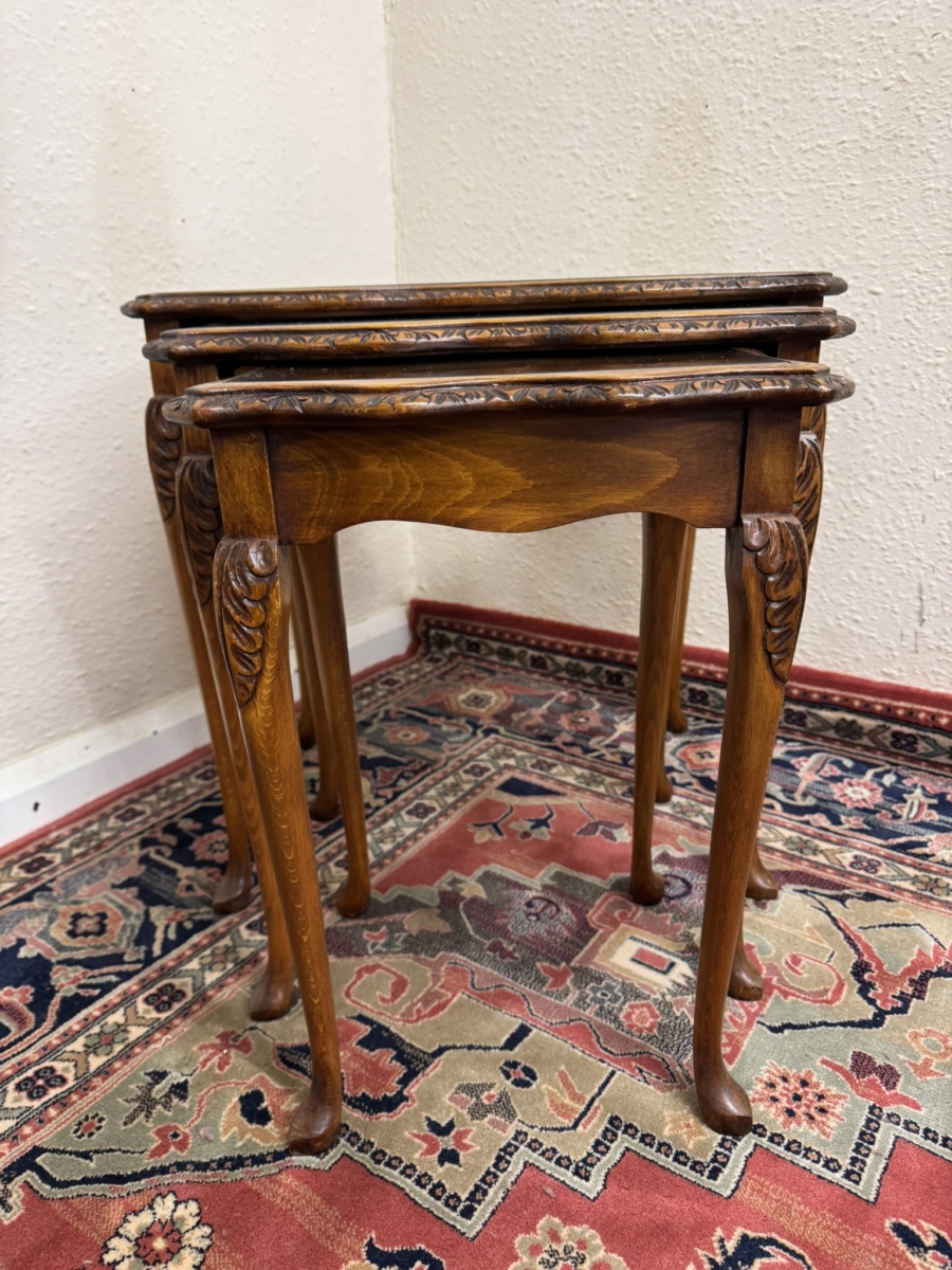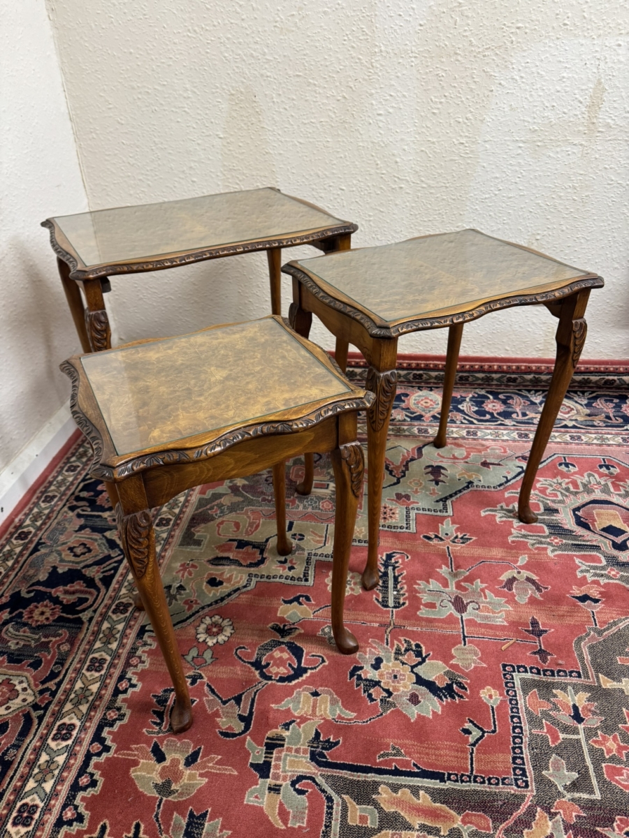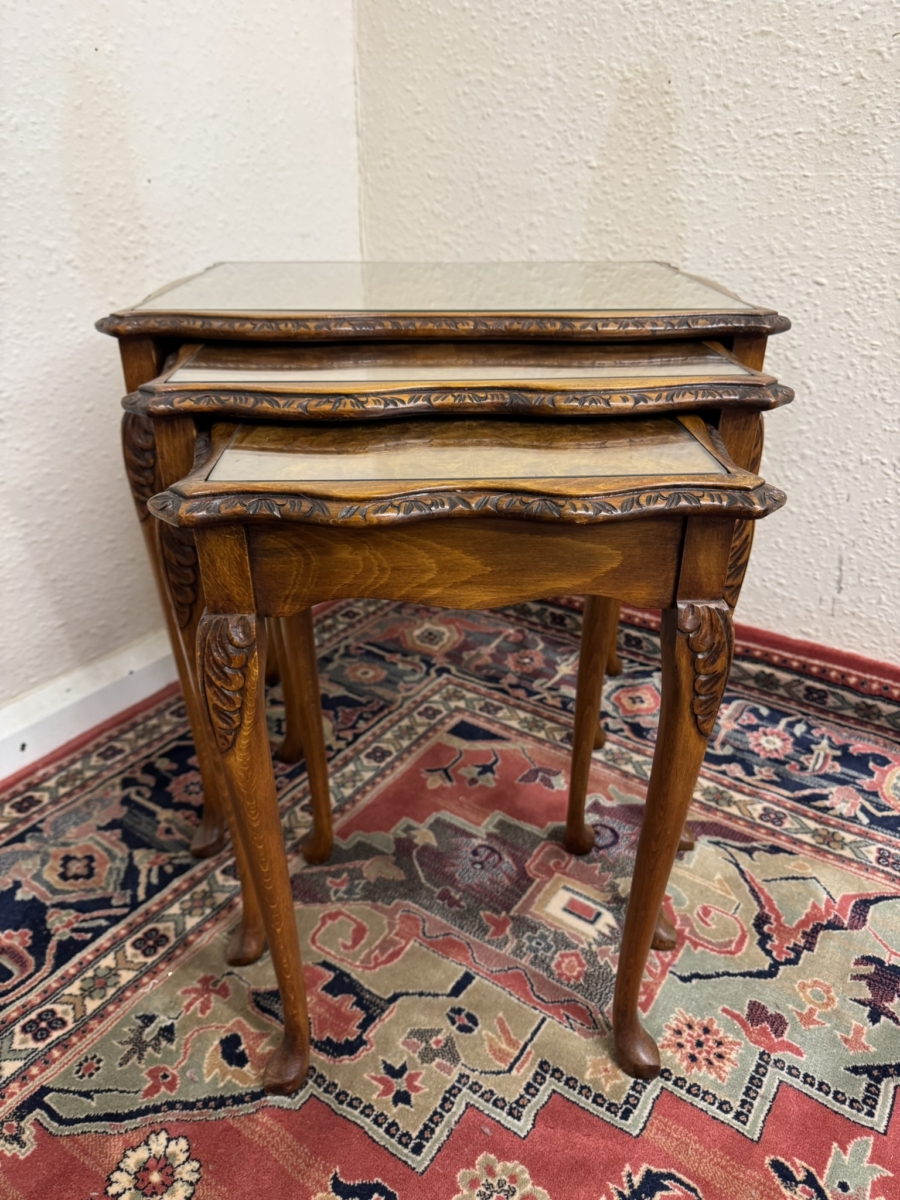 - OUTSTANDING QUALITY CARVED WALNUT NEST OF THREE GLASS TOPPED TABLES CIRCA 1950