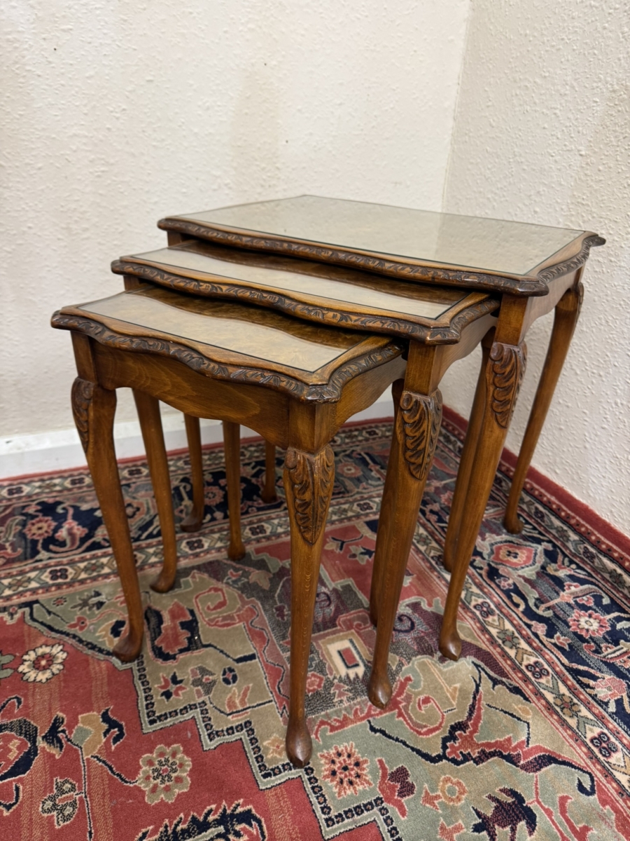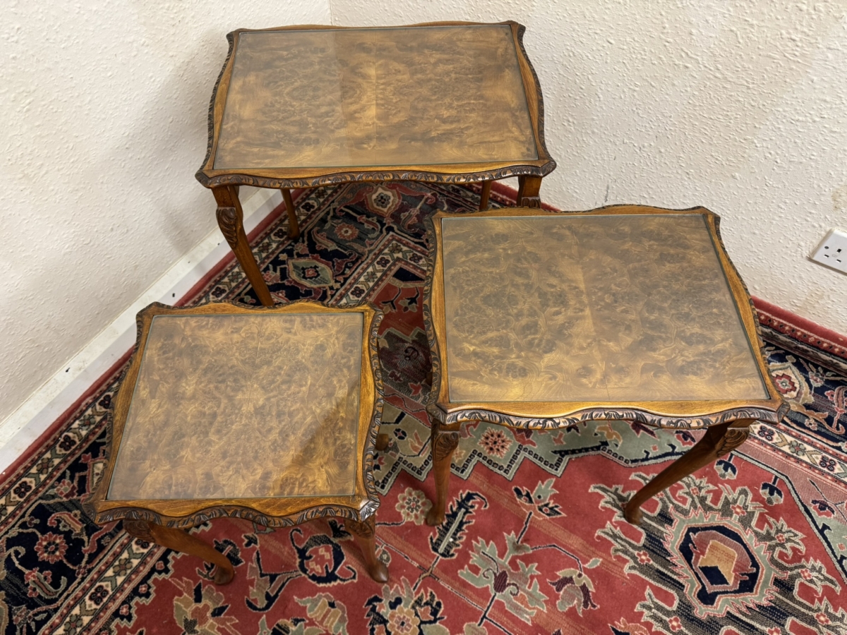 This fabulous set of three walnut tables are in excellent condition. Each table has a striking walnut top with a glass protector and shaped carved edging. Wavy apron and standing on carved cabriole shaped legs.
