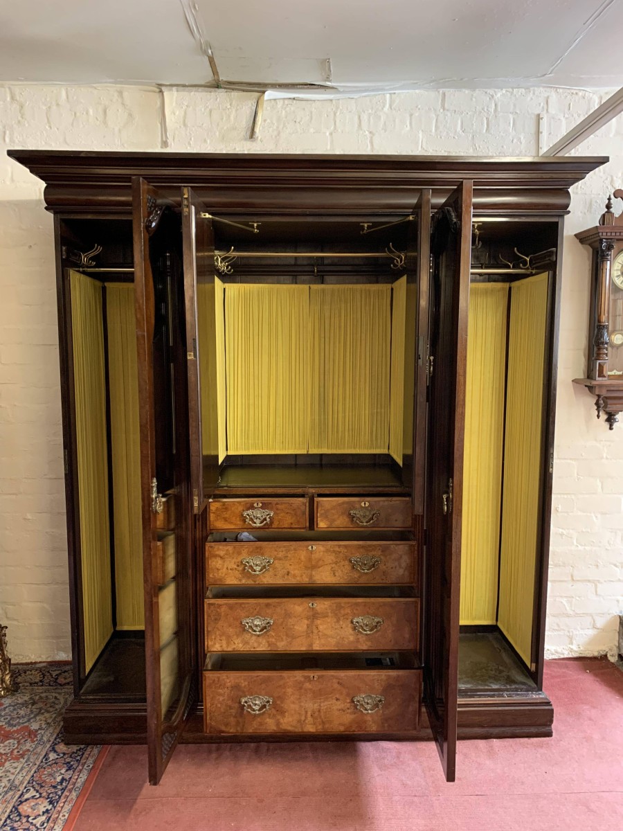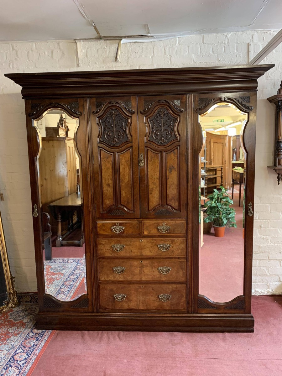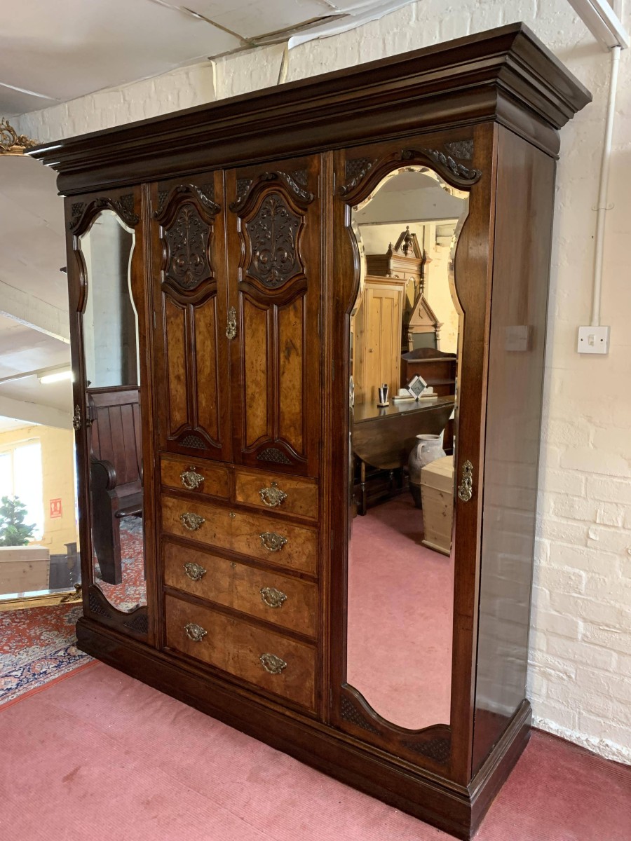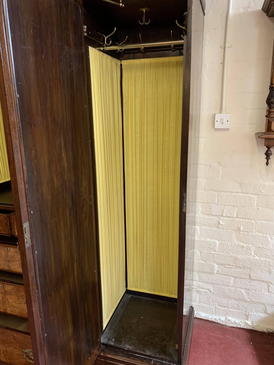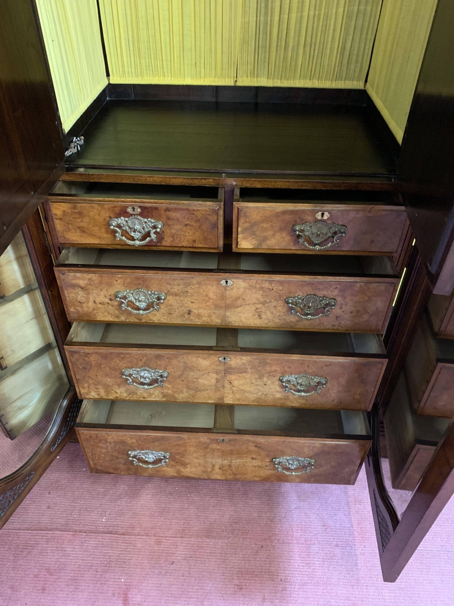 A superb wardrobe which is in excellent condition dating Circa 1890. The stepped cornice sits above a pair of central supremely carved doors, the doors open to reveal the original silk lining, brass hanging rail and brass hooks. Below are two short and three long drawers, the single drawer has one handle and the long drawers having a pair of handles. The brass handles are carved with central peacock figure, which is replicated in the carvings on each door. The central section is flanked by a pair of full length shaped and bevel edged mirrored doors, each door having carving to the top and the bottom. The doors open to reveal the original silk lining, brass hanging rail and brass hooks. This stunning wardrobe sits on a plinth base. Please note this wardrobe splits into five sections.