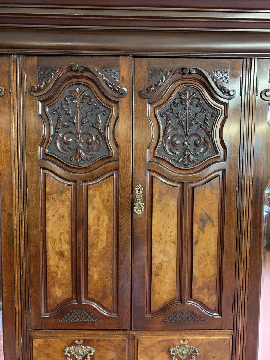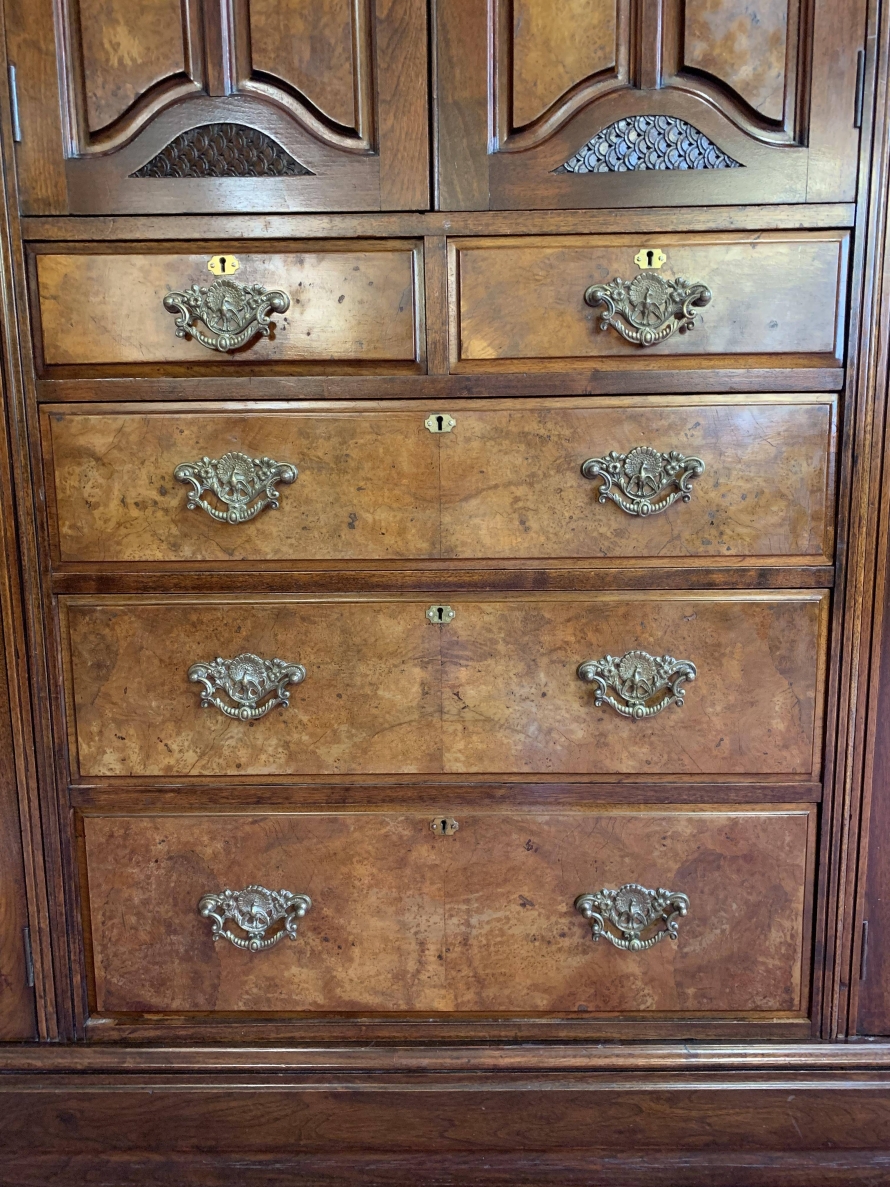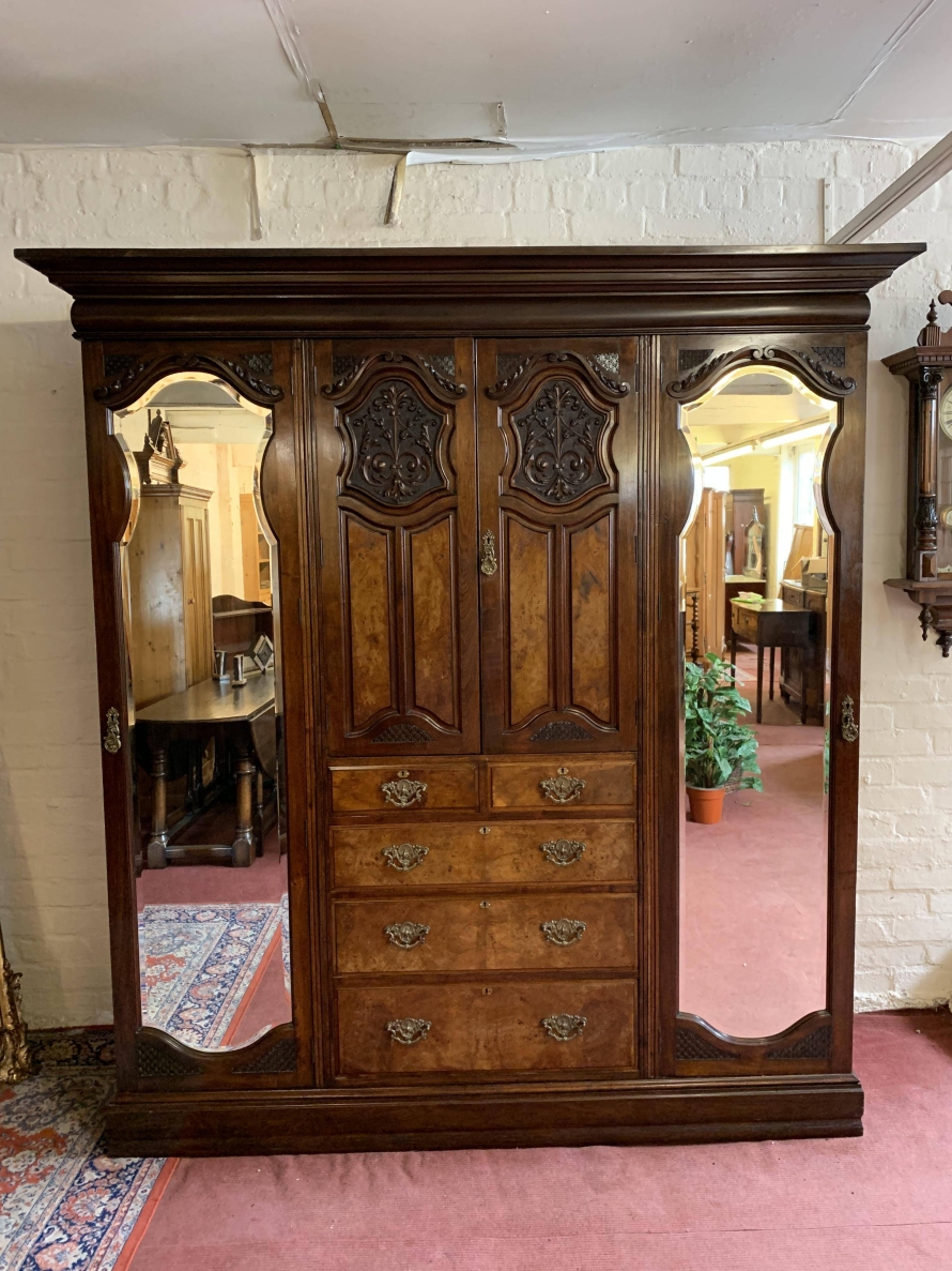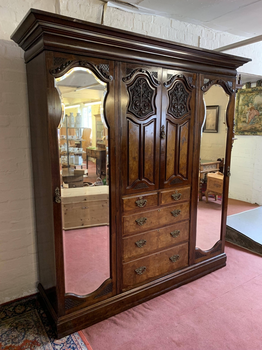 A superb wardrobe which is in excellent condition dating Circa 1890. The stepped cornice sits above a pair of central supremely carved doors, the doors open to reveal the original silk lining, brass hanging rail and brass hooks. Below are two short and three long drawers, the single drawer has one handle and the long drawers having a pair of handles. The brass handles are carved with central peacock figure, which is replicated in the carvings on each door. The central section is flanked by a pair of full length shaped and bevel edged mirrored doors, each door having carving to the top and the bottom. The doors open to reveal the original silk lining, brass hanging rail and brass hooks. This stunning wardrobe sits on a plinth base. Please note this wardrobe splits into five sections.