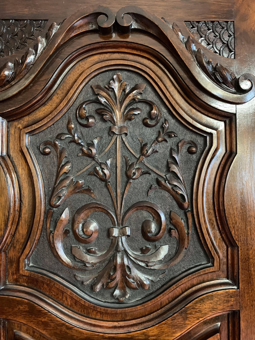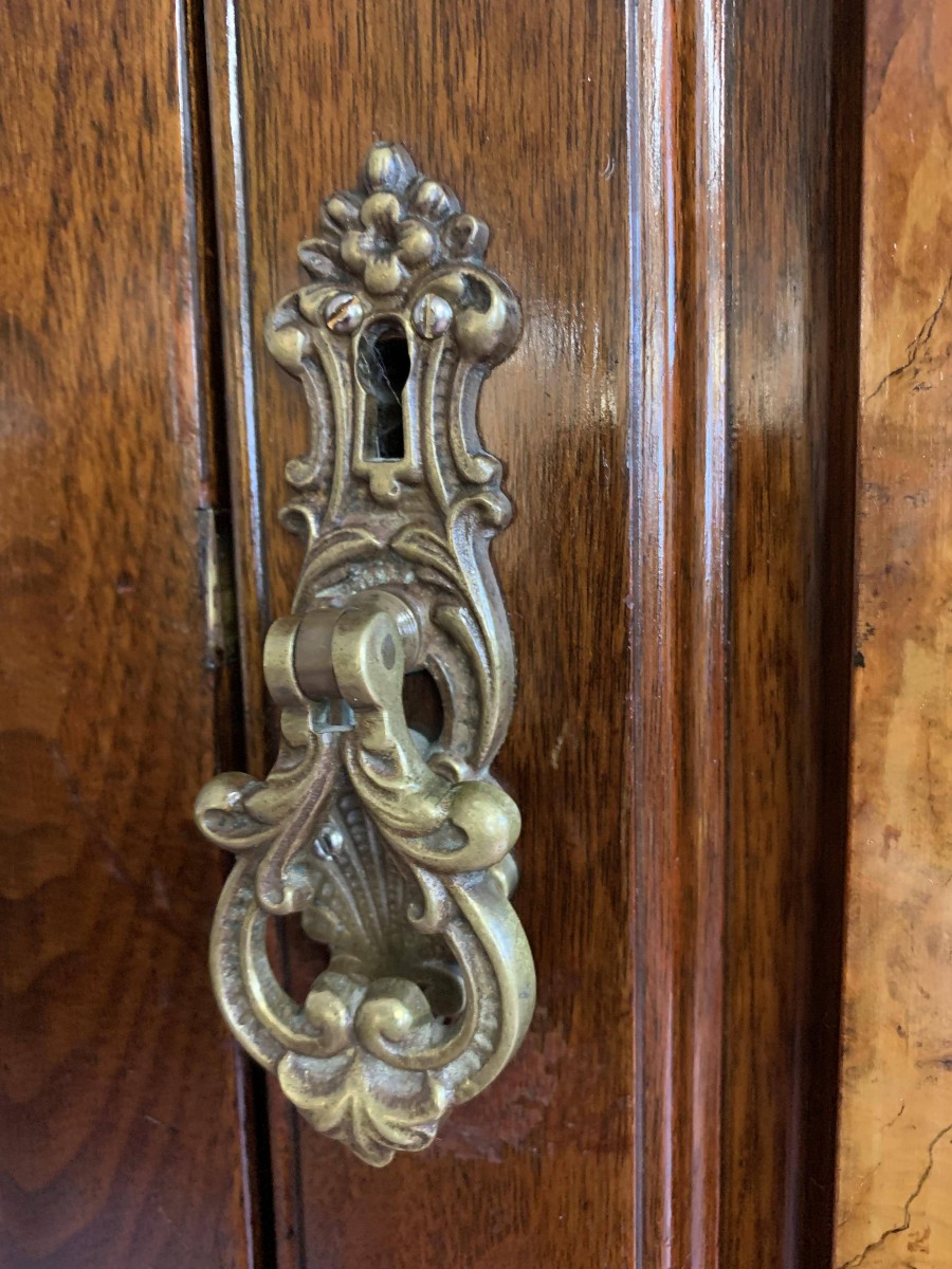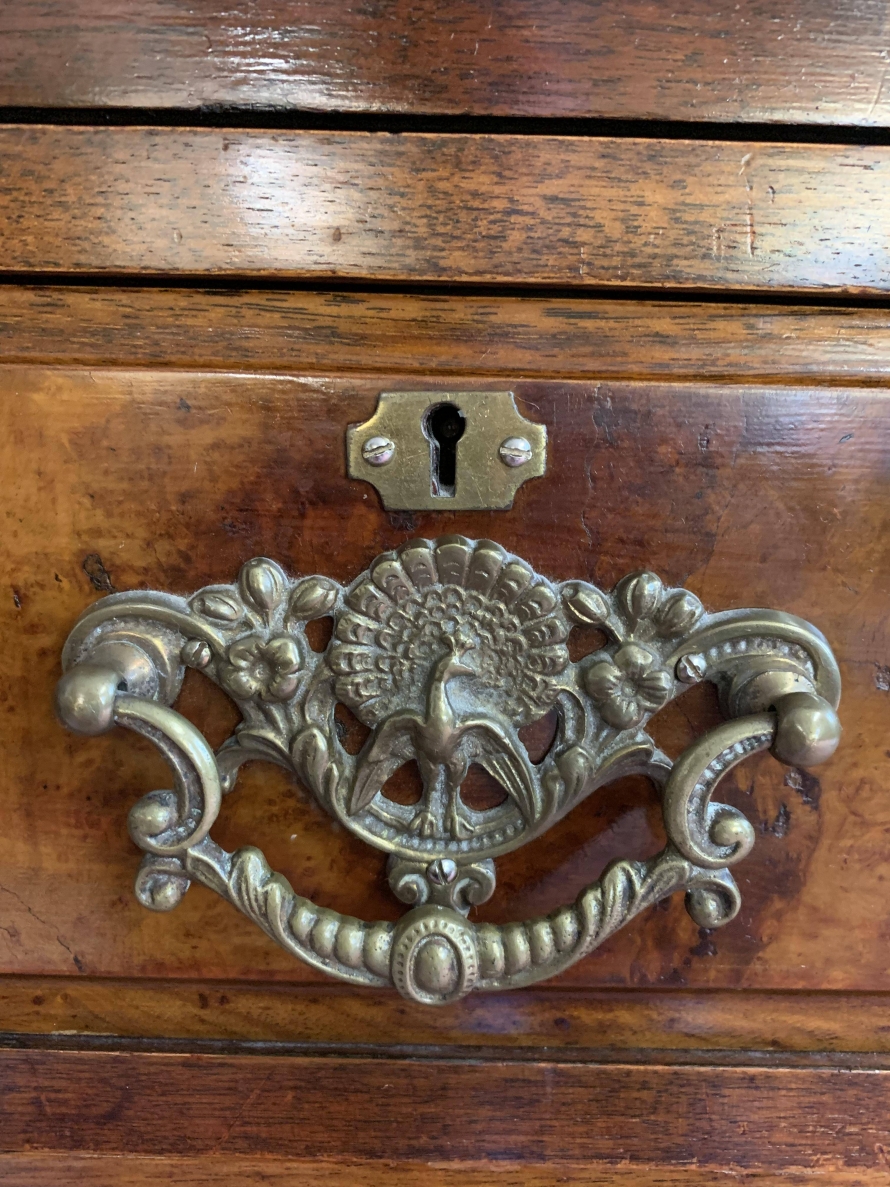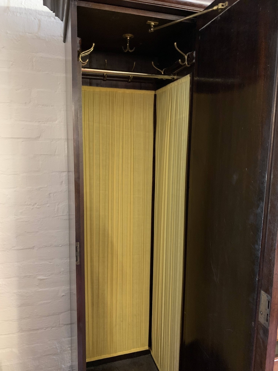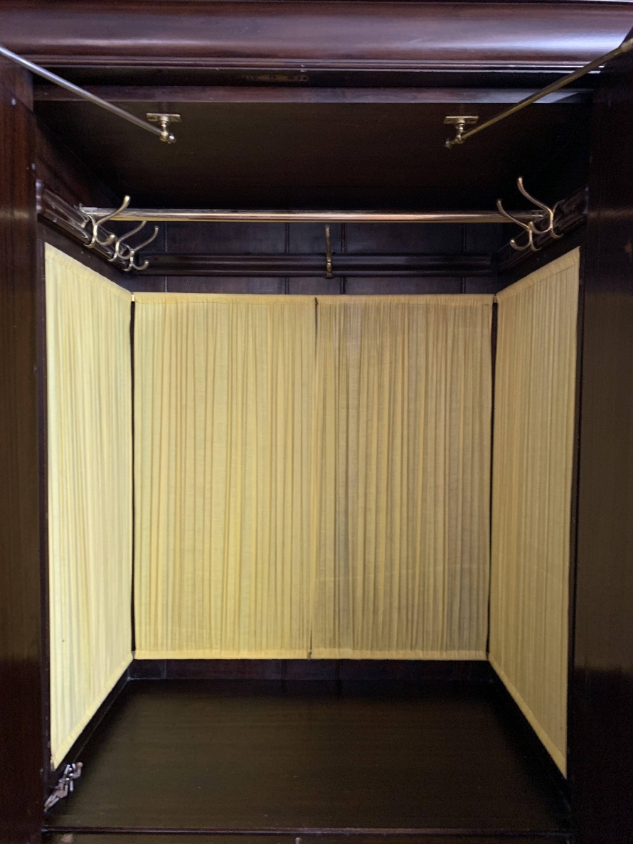 A superb wardrobe which is in excellent condition dating Circa 1890. The stepped cornice sits above a pair of central supremely carved doors, the doors open to reveal the original silk lining, brass hanging rail and brass hooks. Below are two short and three long drawers, the single drawer has one handle and the long drawers having a pair of handles. The brass handles are carved with central peacock figure, which is replicated in the carvings on each door. The central section is flanked by a pair of full length shaped and bevel edged mirrored doors, each door having carving to the top and the bottom. The doors open to reveal the original silk lining, brass hanging rail and brass hooks. This stunning wardrobe sits on a plinth base. Please note this wardrobe splits into five sections.