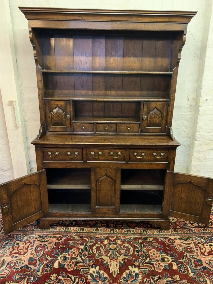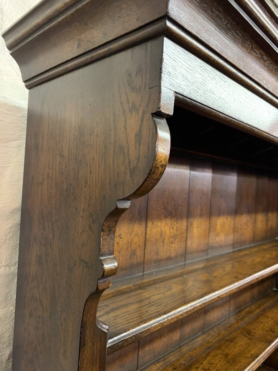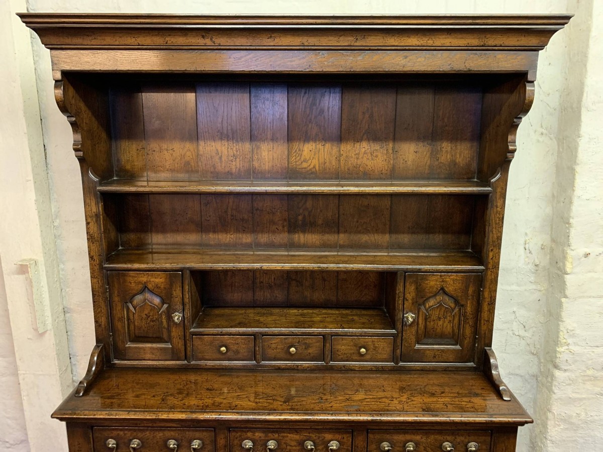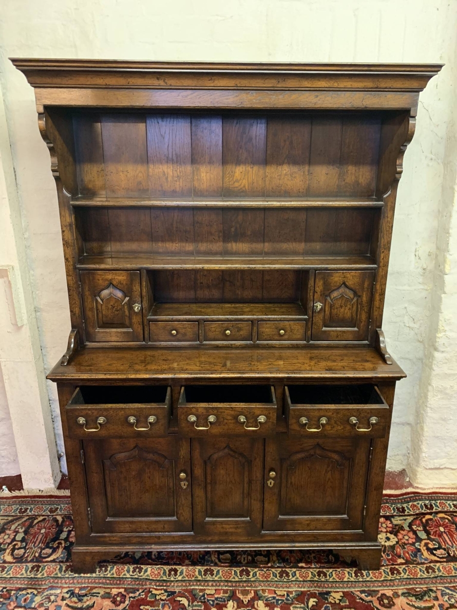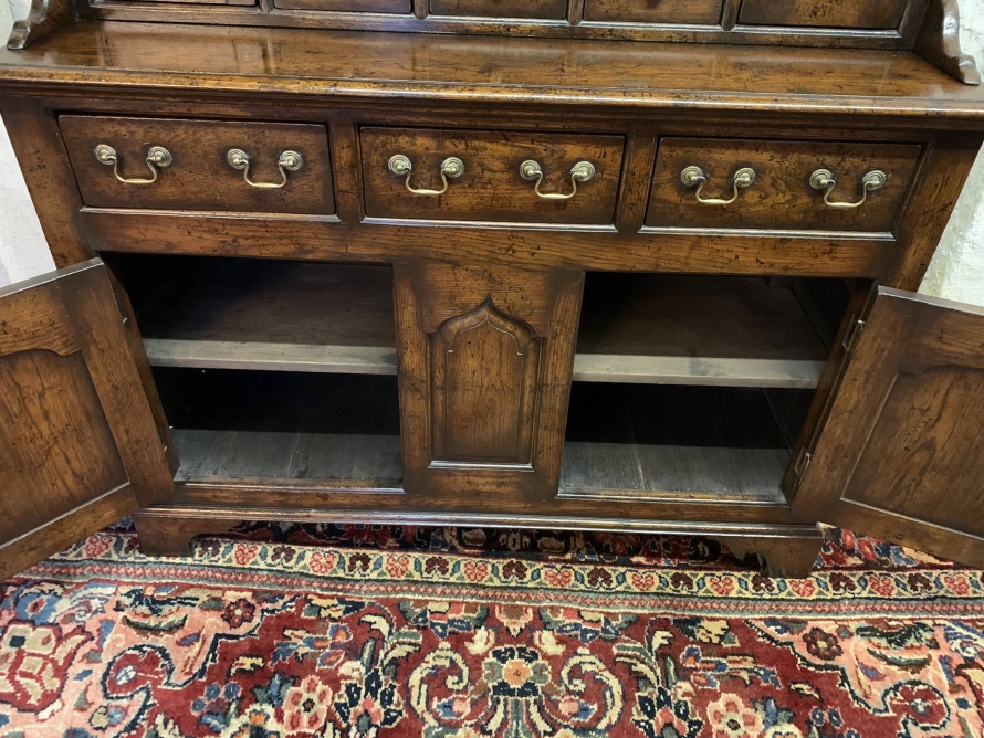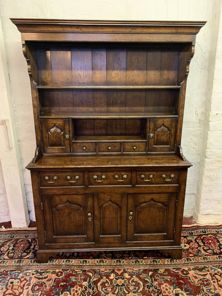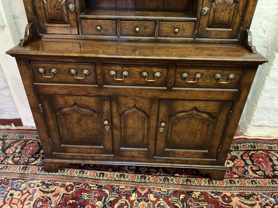 Made entirely from glorious solid oak this dresser is in excellent condition. The top rack section has an oversailing top, boarded back, three shelves, two fielded panelled lockable cupboard doors and three drawers, each with button brass handle. The base section has three drawers, each drawer having a pair of brass handles. Below are a pair of lockable fielded panelled doors, each door having a brass escutcheon and brass knob handle. Between the doors is a fixed shaped fielded panel. The doors open to reveal a removable shelf. This stunning dresser stands on four bracket feet.