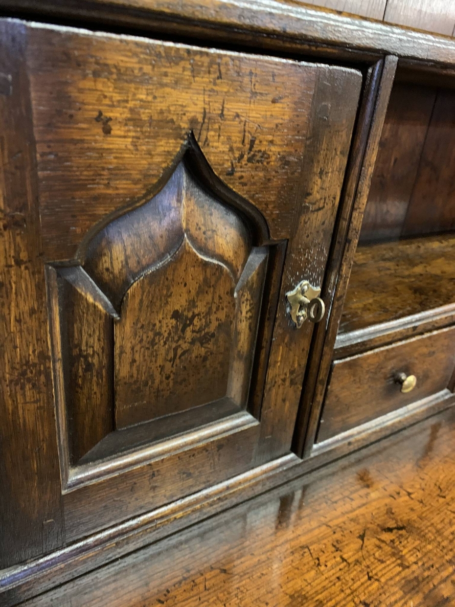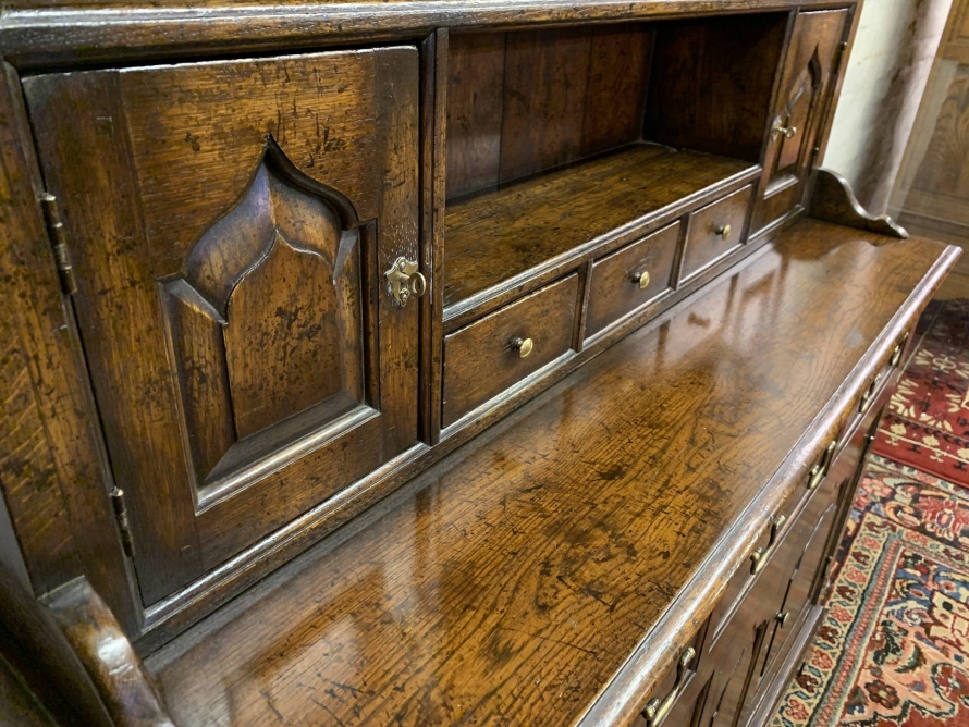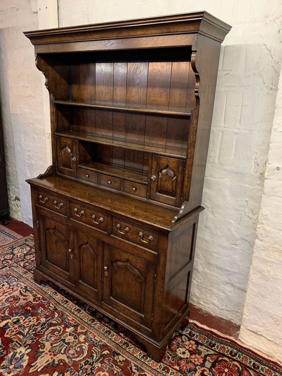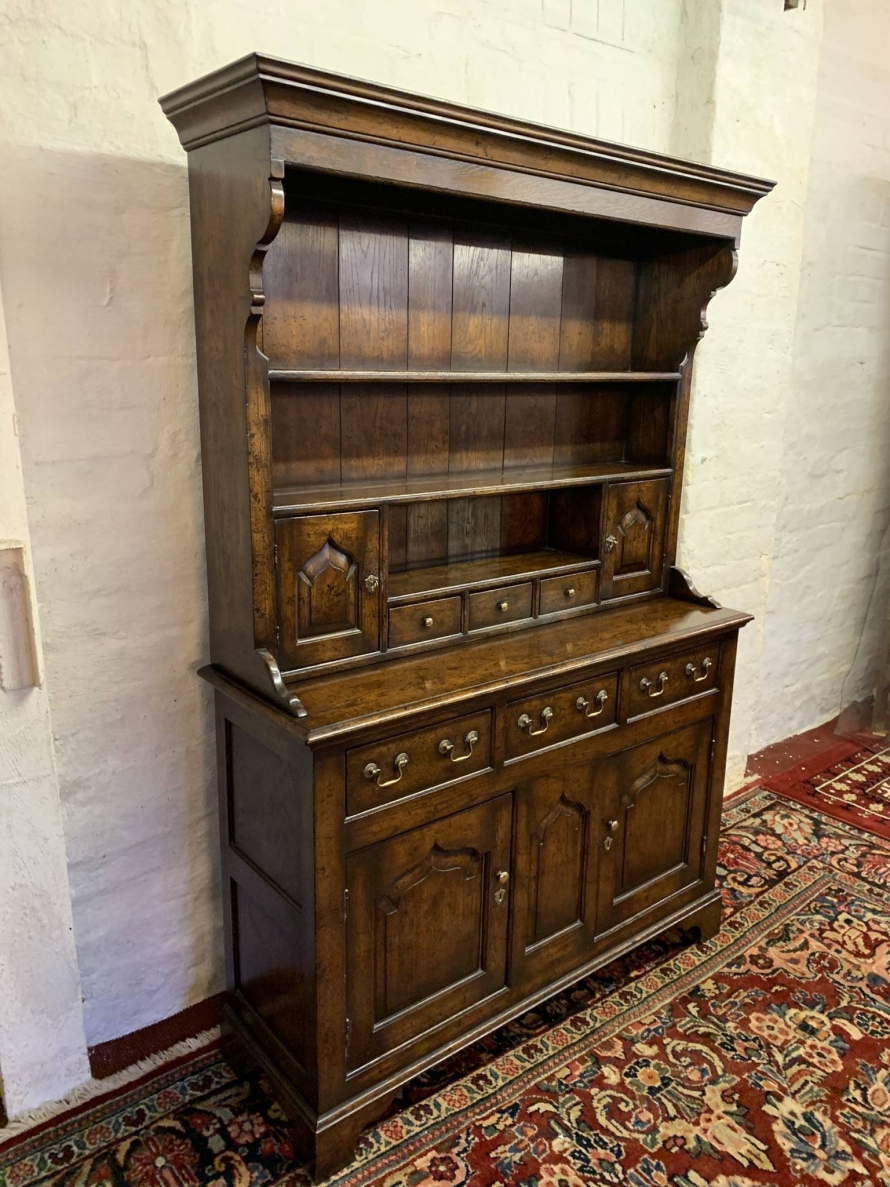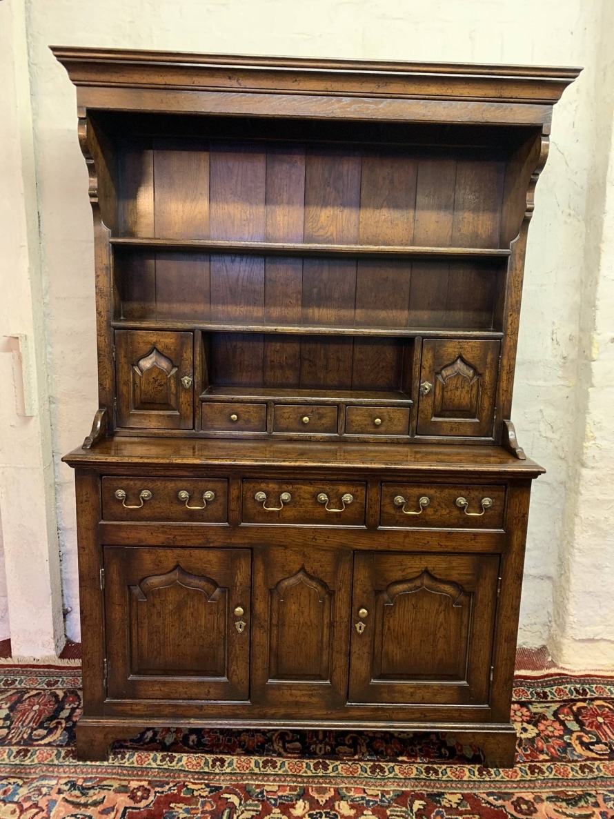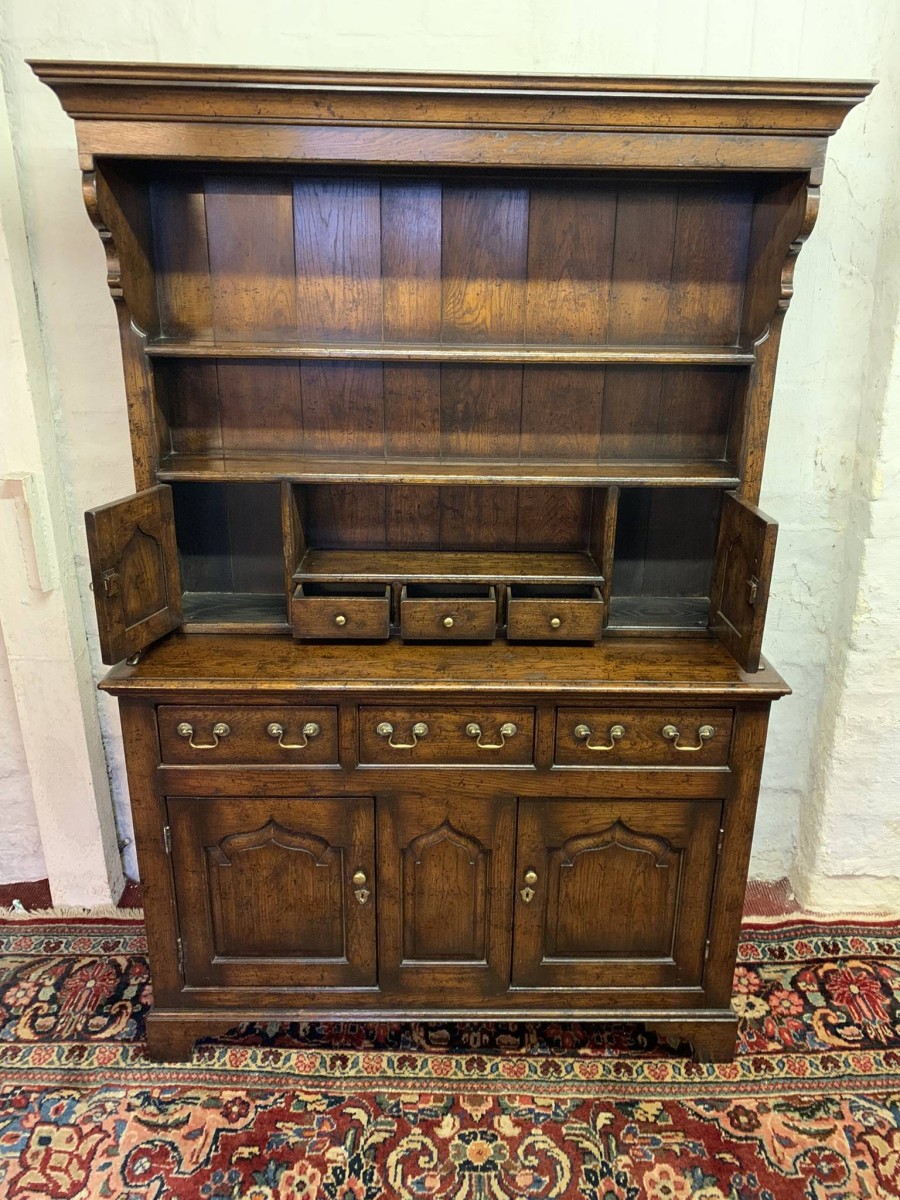 Made entirely from glorious solid oak this dresser is in excellent condition. The top rack section has an oversailing top, boarded back, three shelves, two fielded panelled lockable cupboard doors and three drawers, each with button brass handle. The base section has three drawers, each drawer having a pair of brass handles. Below are a pair of lockable fielded panelled doors, each door having a brass escutcheon and brass knob handle. Between the doors is a fixed shaped fielded panel. The doors open to reveal a removable shelf. This stunning dresser stands on four bracket feet.