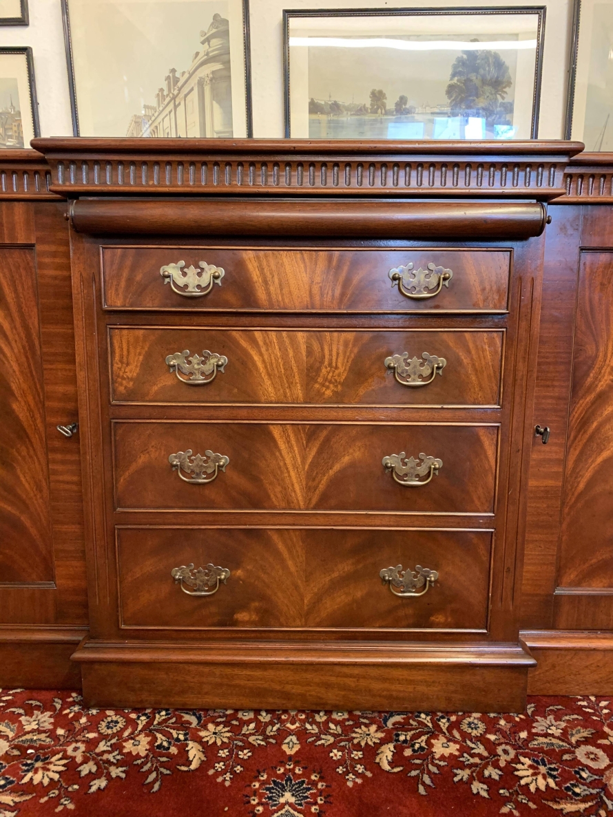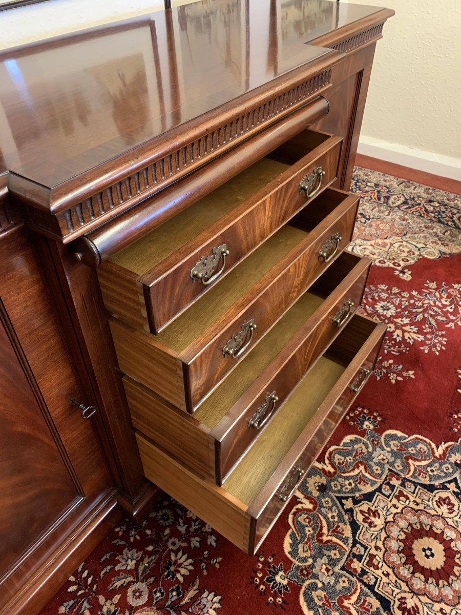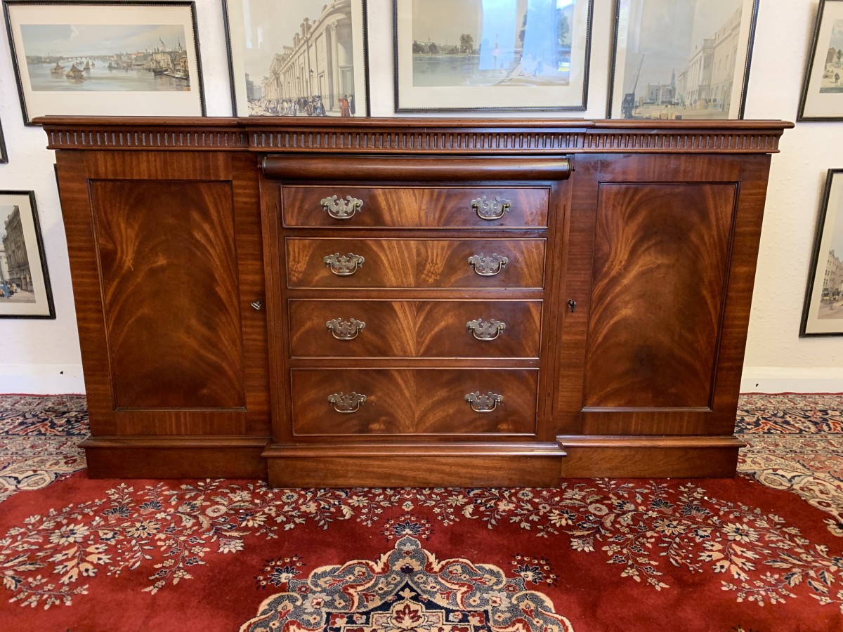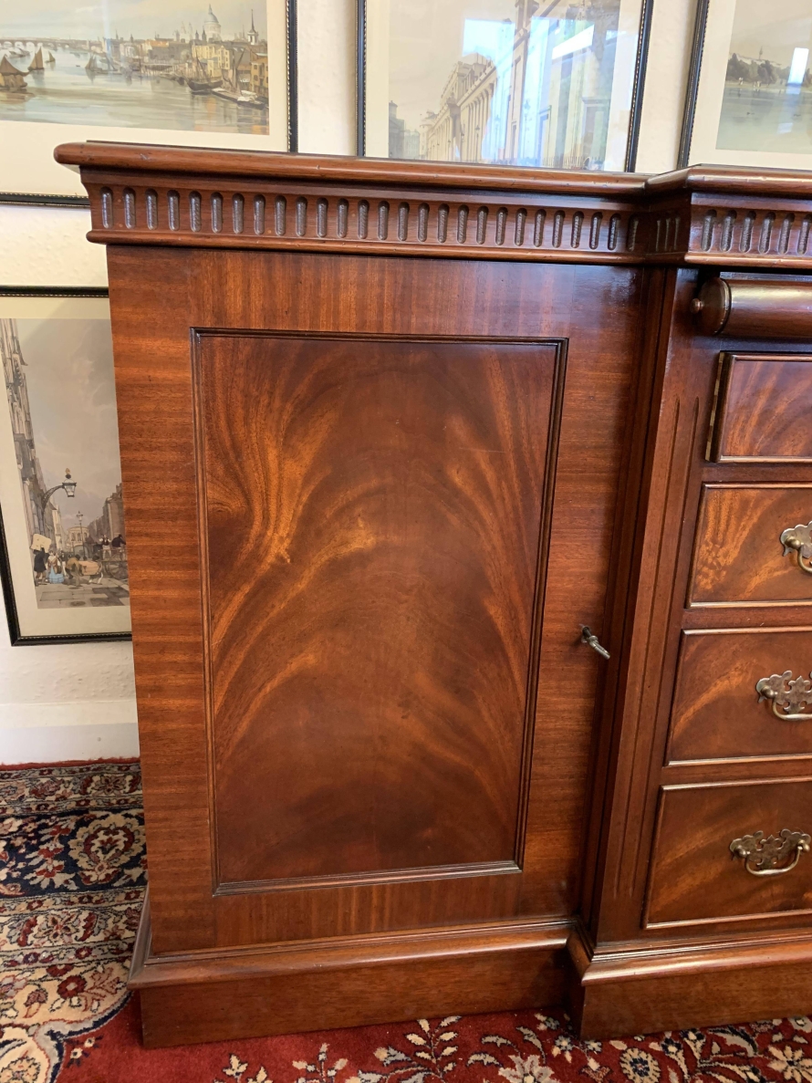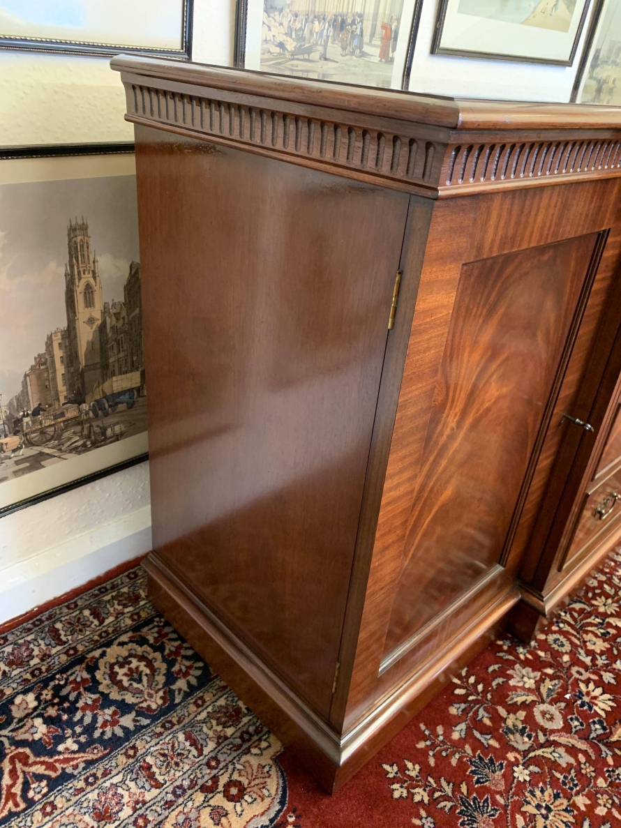 A top quality item of mahogany furniture which is in excellent condition. The inverted crossbanded top has a carved decoration to the front and sides. The mirror glass slide has an impressive scroll handle. Below the scroll are four graduated drawers, each drawer has a pair of brass drop handles. The drawers are flanked by a pair of recessed panelled lockable cupboard door. the doors open to reveal an adjustable and removable shelf. The dresser sits on a plinth base. Please note that the patina of the mahogany is striking.