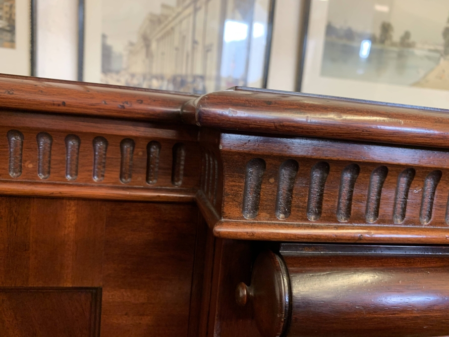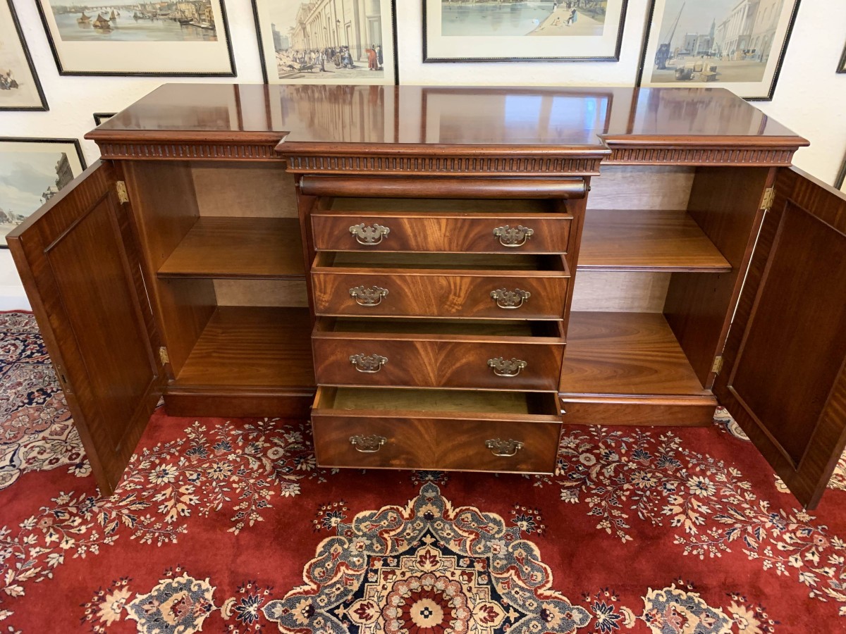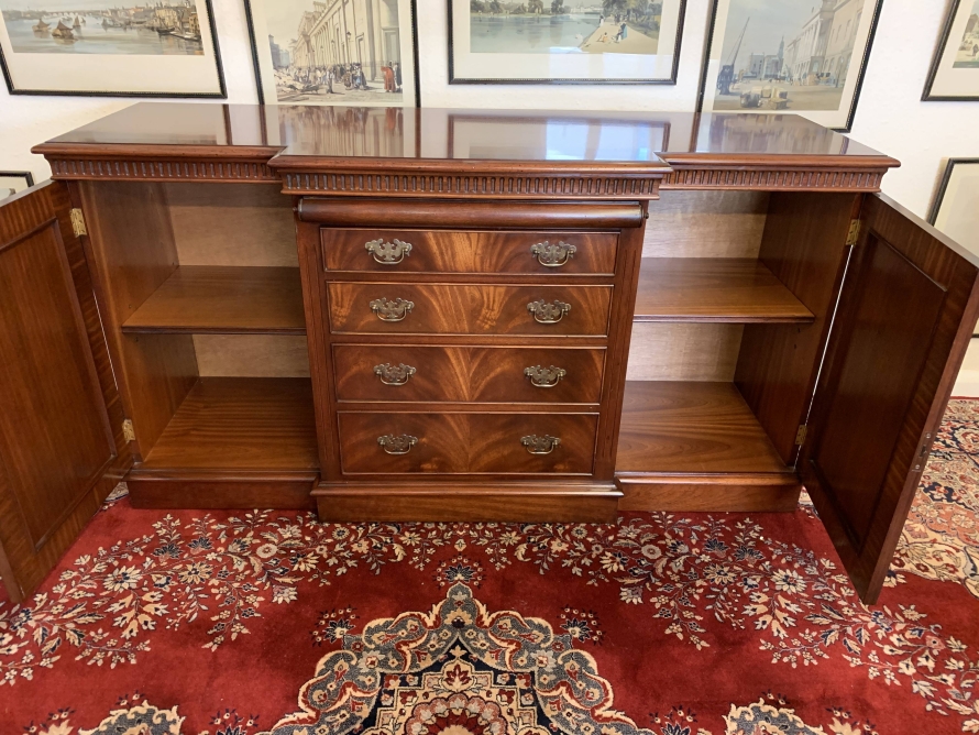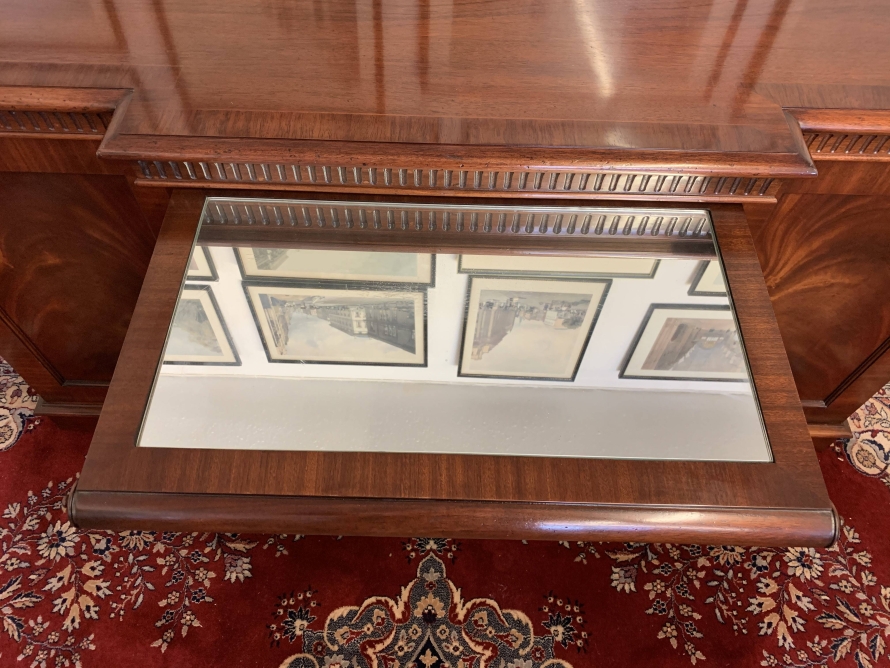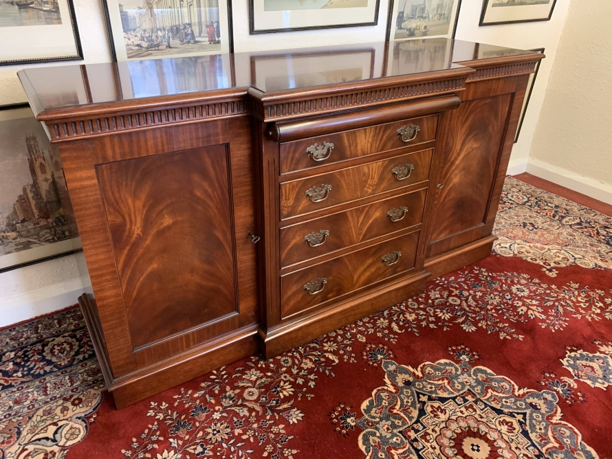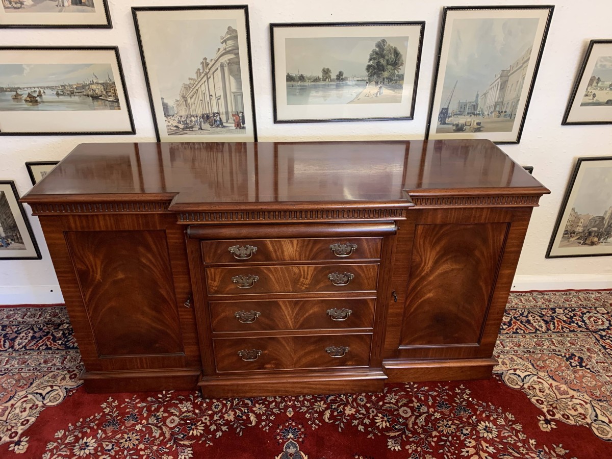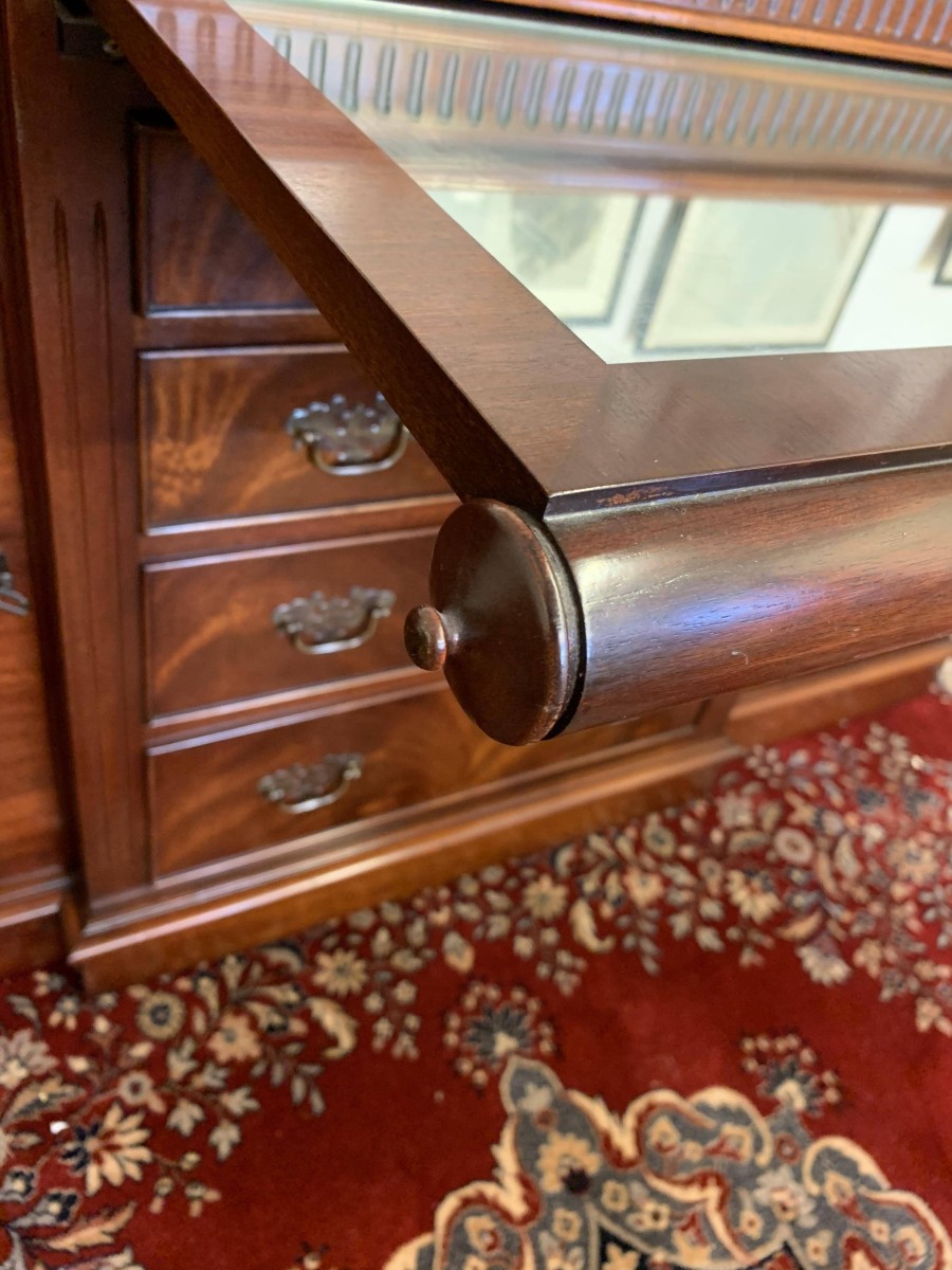 A top quality item of mahogany furniture which is in excellent condition. The inverted crossbanded top has a carved decoration to the front and sides. The mirror glass slide has an impressive scroll handle. Below the scroll are four graduated drawers, each drawer has a pair of brass drop handles. The drawers are flanked by a pair of recessed panelled lockable cupboard door. the doors open to reveal an adjustable and removable shelf. The dresser sits on a plinth base. Please note that the patina of the mahogany is striking.