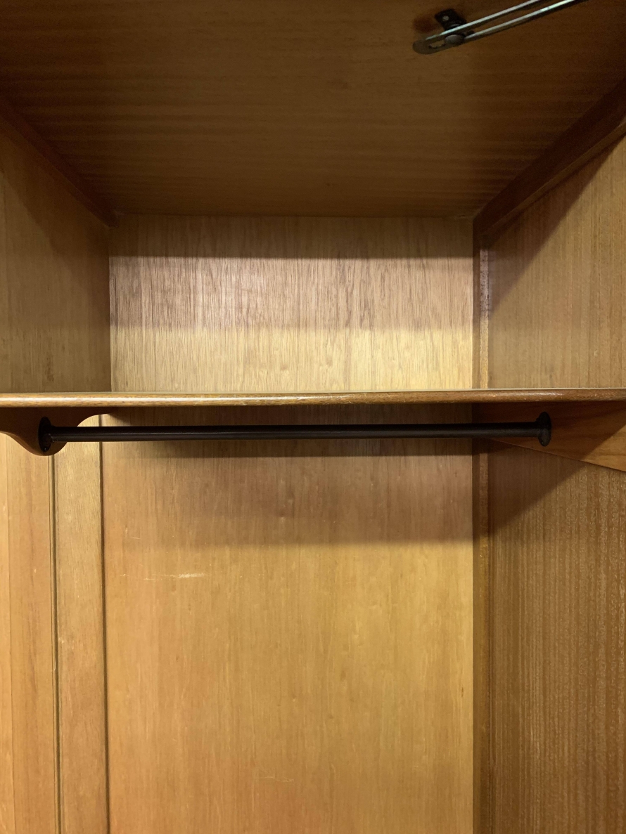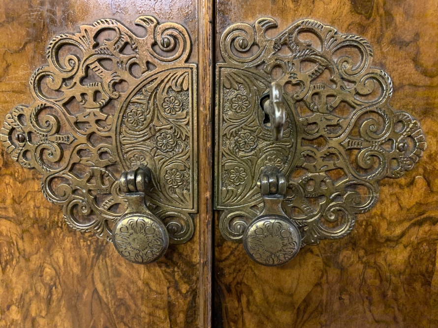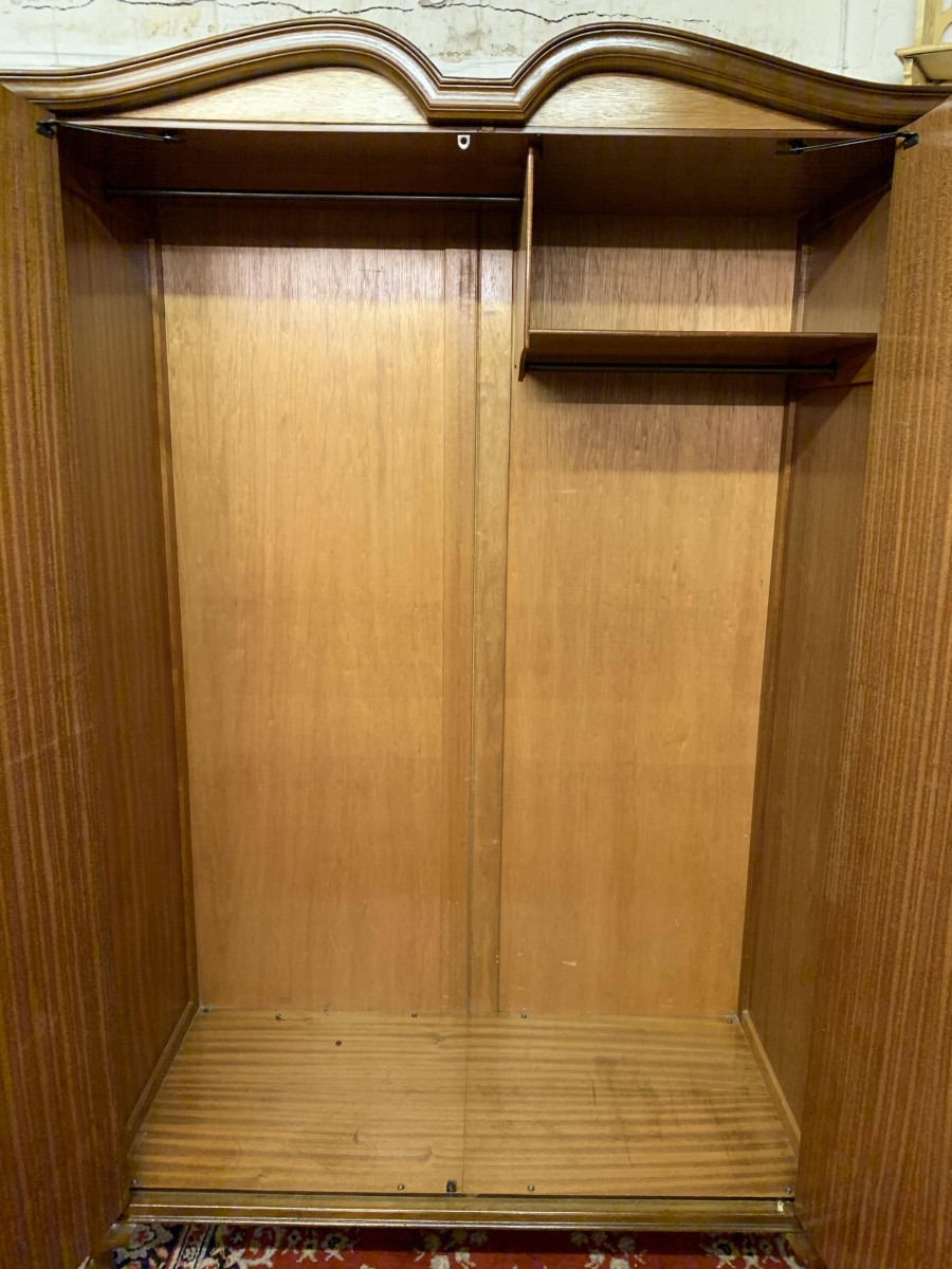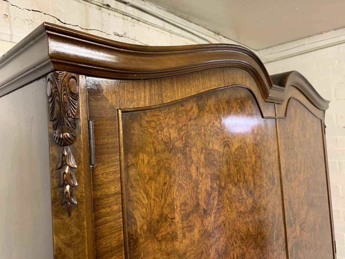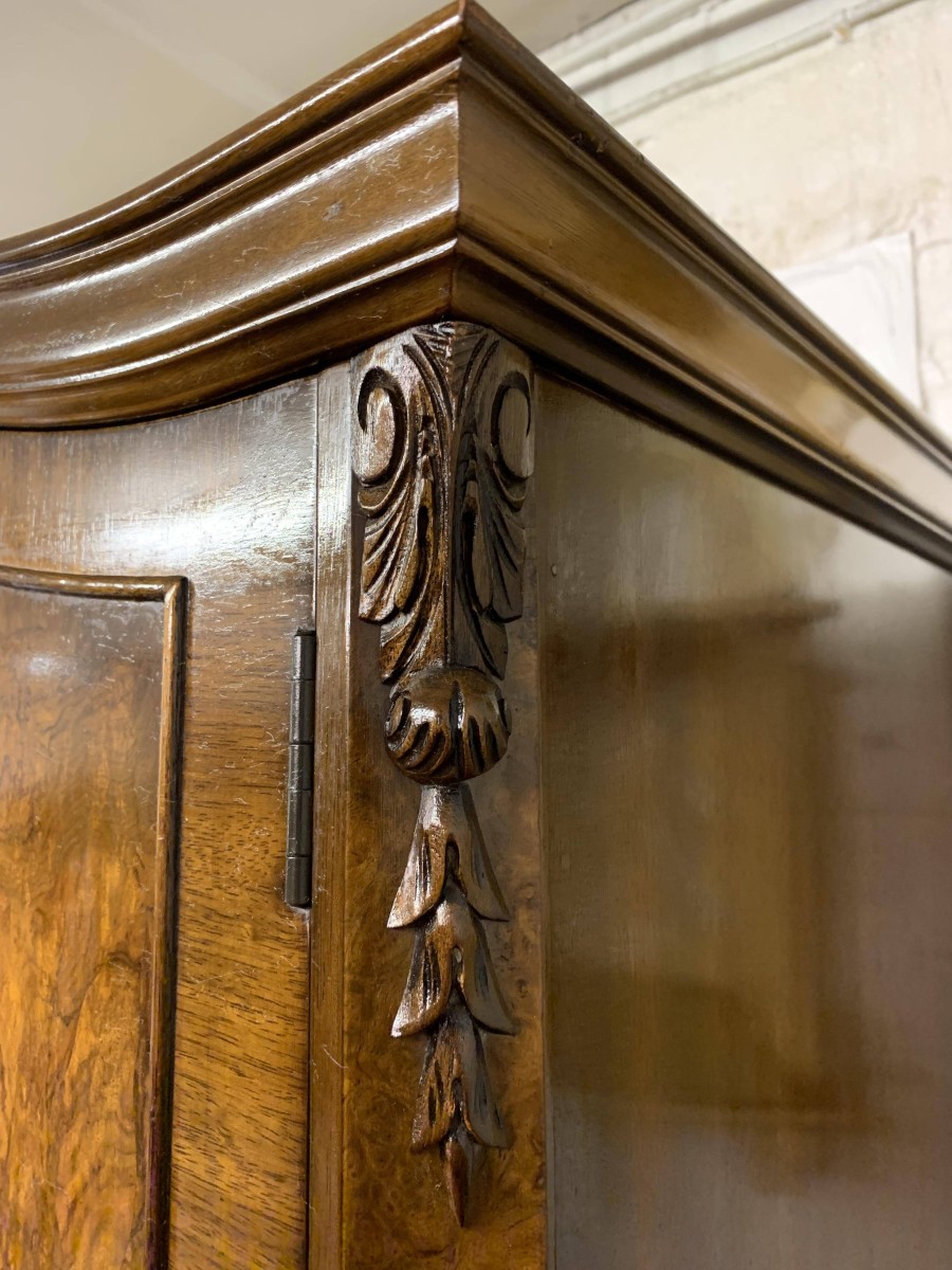 Elegant shaped top sits above a pair of lockable doors, the patina of the walnut is exquisite. The doors open to reveal a hanging rail, shelf with a hanging rail below, ample storage. Canted corners with carvings to the top this impressive wardrobe sits on four shaped cabriole legs.