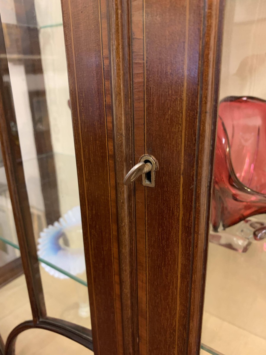 This cabinet is inlaid through out, is in excellent condition and dates circa 1910. The shaped top sits above a pair of lockable glazed doors, the doors having wood barring decoration. The doors open to reveal two glass shelves. Having glass to the sides, shaped shelf this beautiful cabinet stands on four tapered legs.