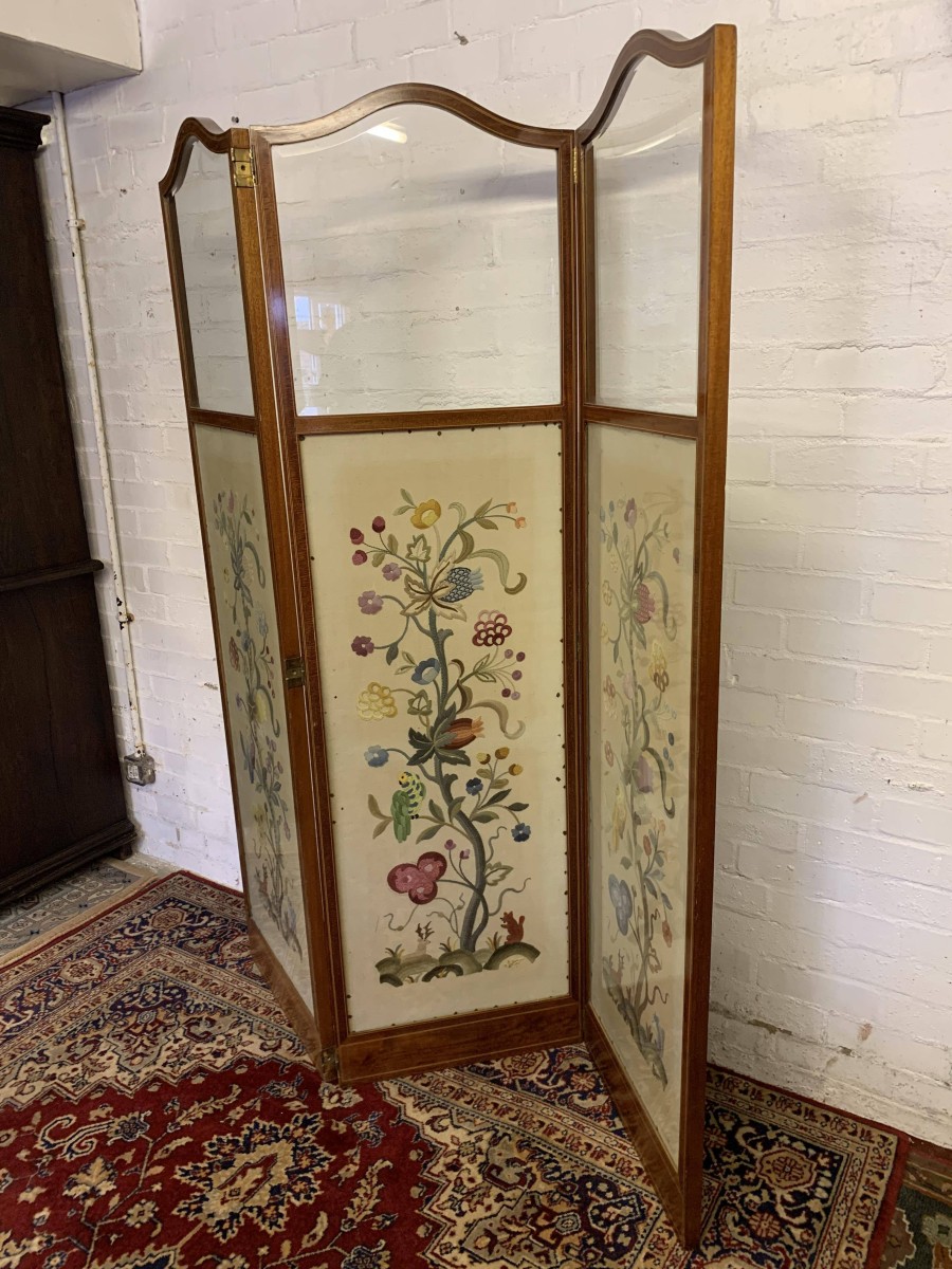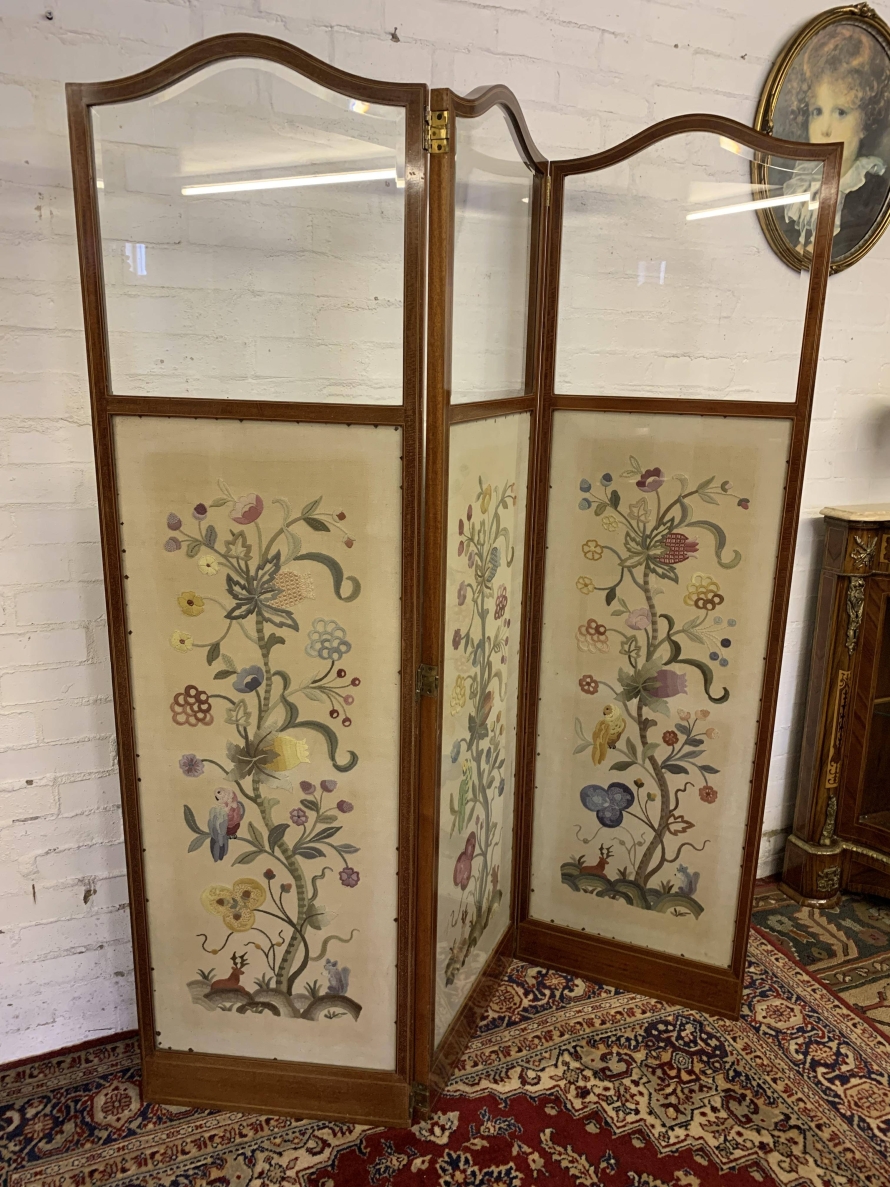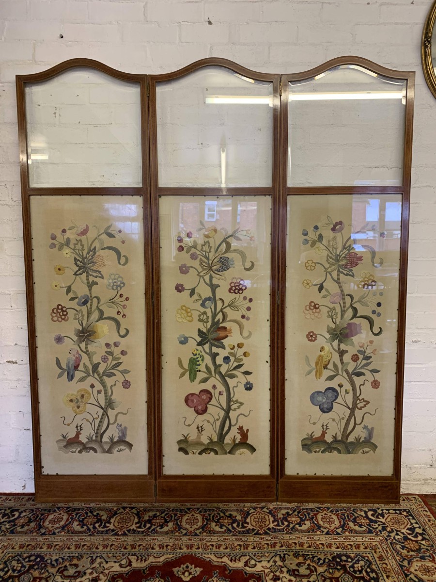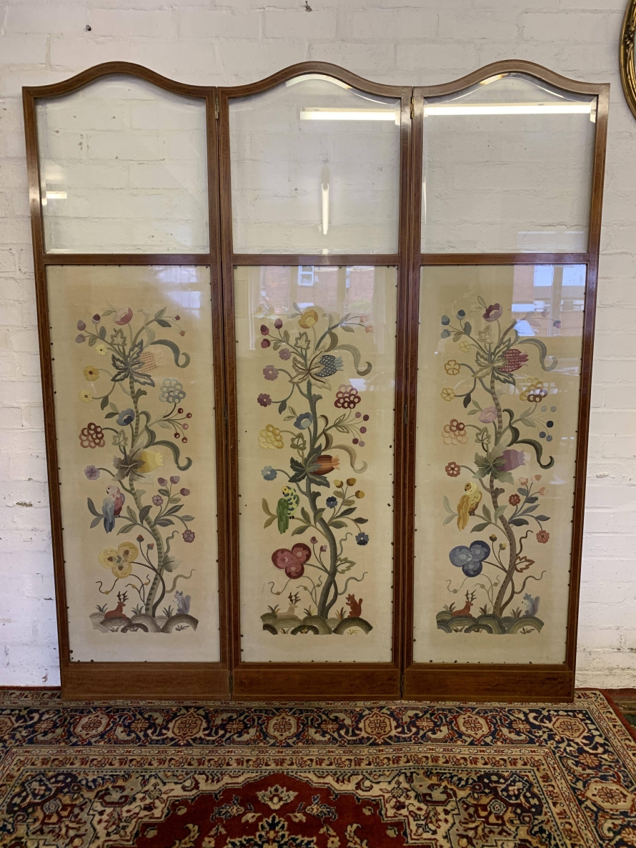Made in striking mahogany with string inlay decoration this screen dates circa 1910. The the three section screen has bevel edged glass panels to the top with hand embroidered flora and founa decoration on one side and damask fabric on the reverse.