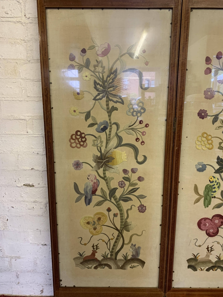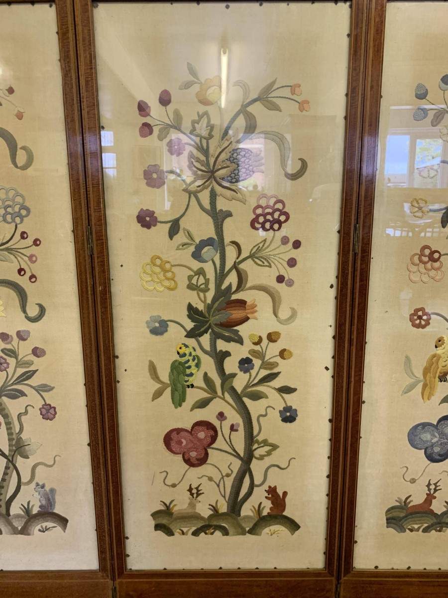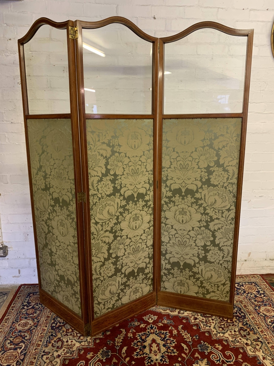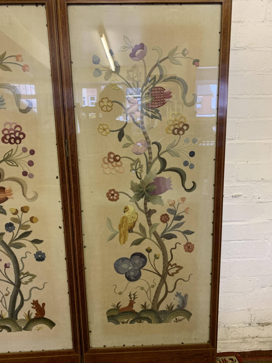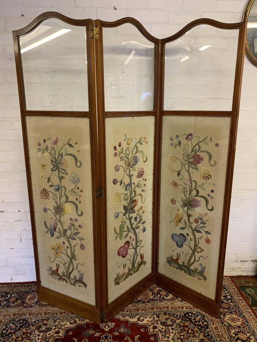 Made in striking mahogany with string inlay decoration this screen dates circa 1910. The the three section screen has bevel edged glass panels to the top with hand embroidered flora and founa decoration on one side and damask fabric on the reverse.