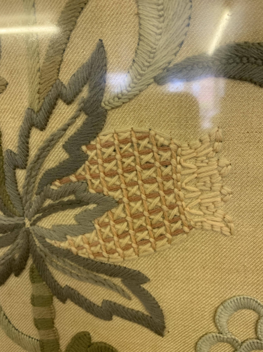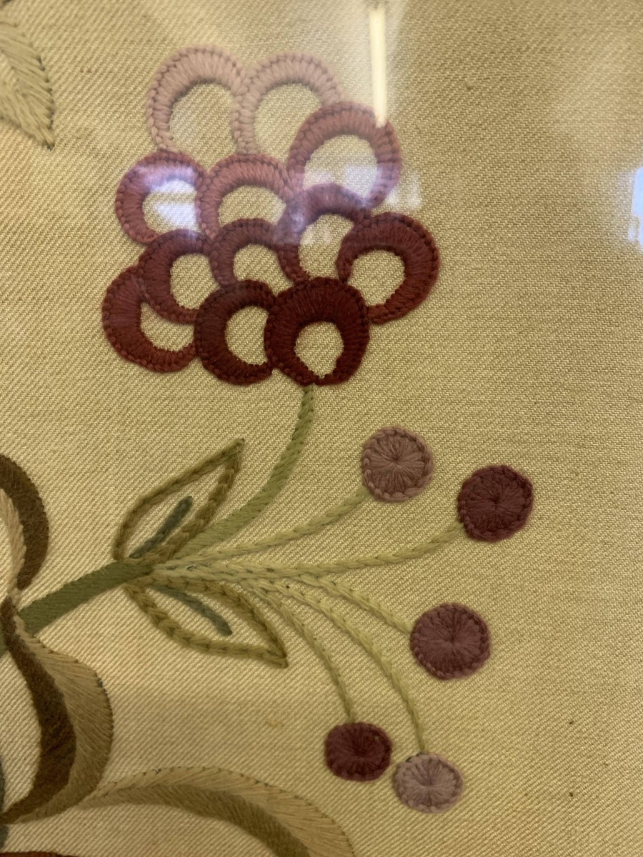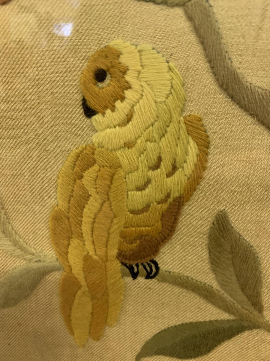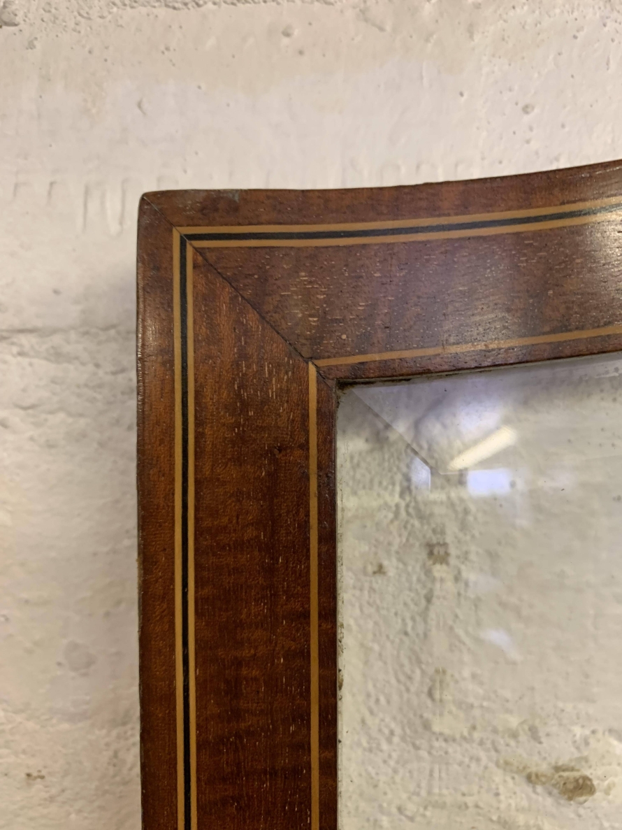 Made in striking mahogany with string inlay decoration this screen dates circa 1910. The the three section screen has bevel edged glass panels to the top with hand embroidered flora and founa decoration on one side and damask fabric on the reverse.