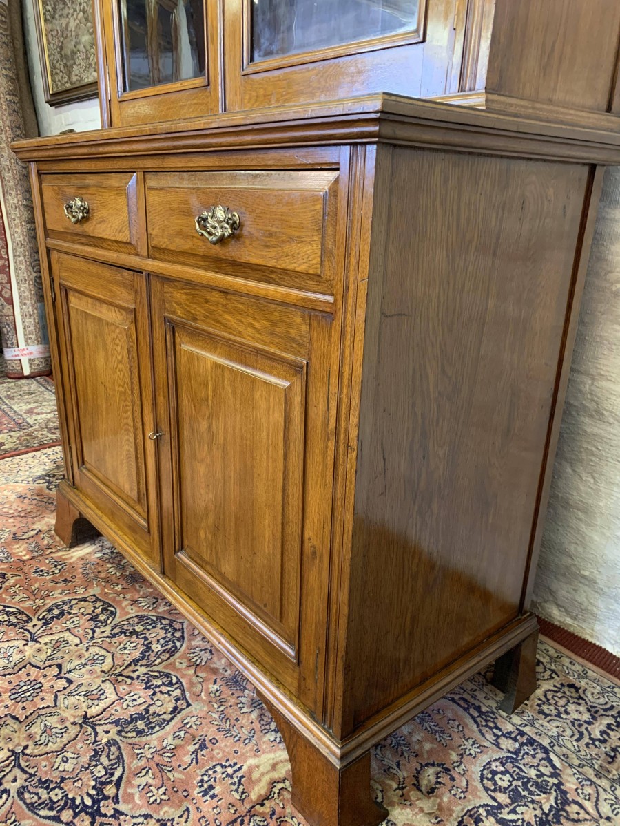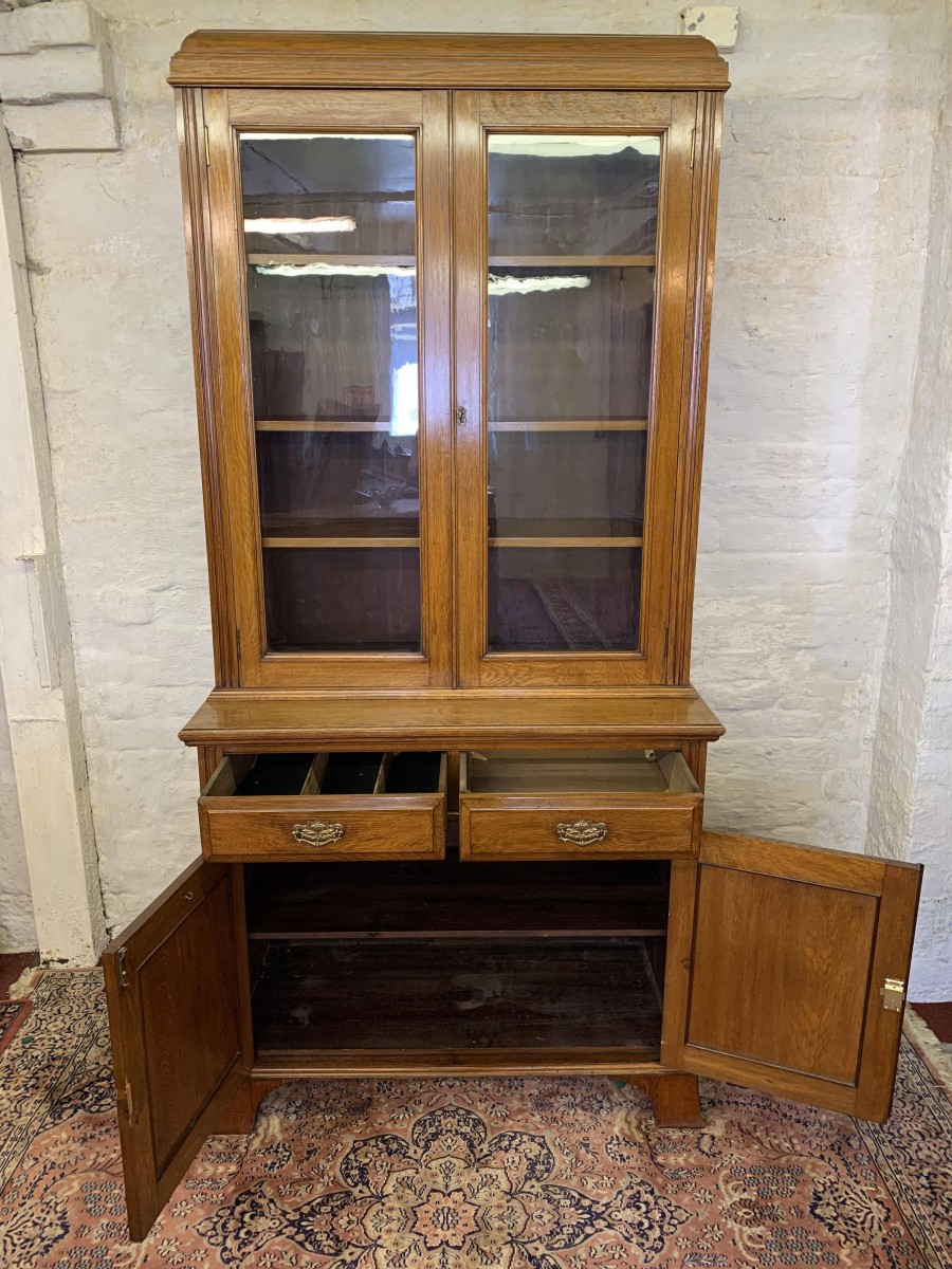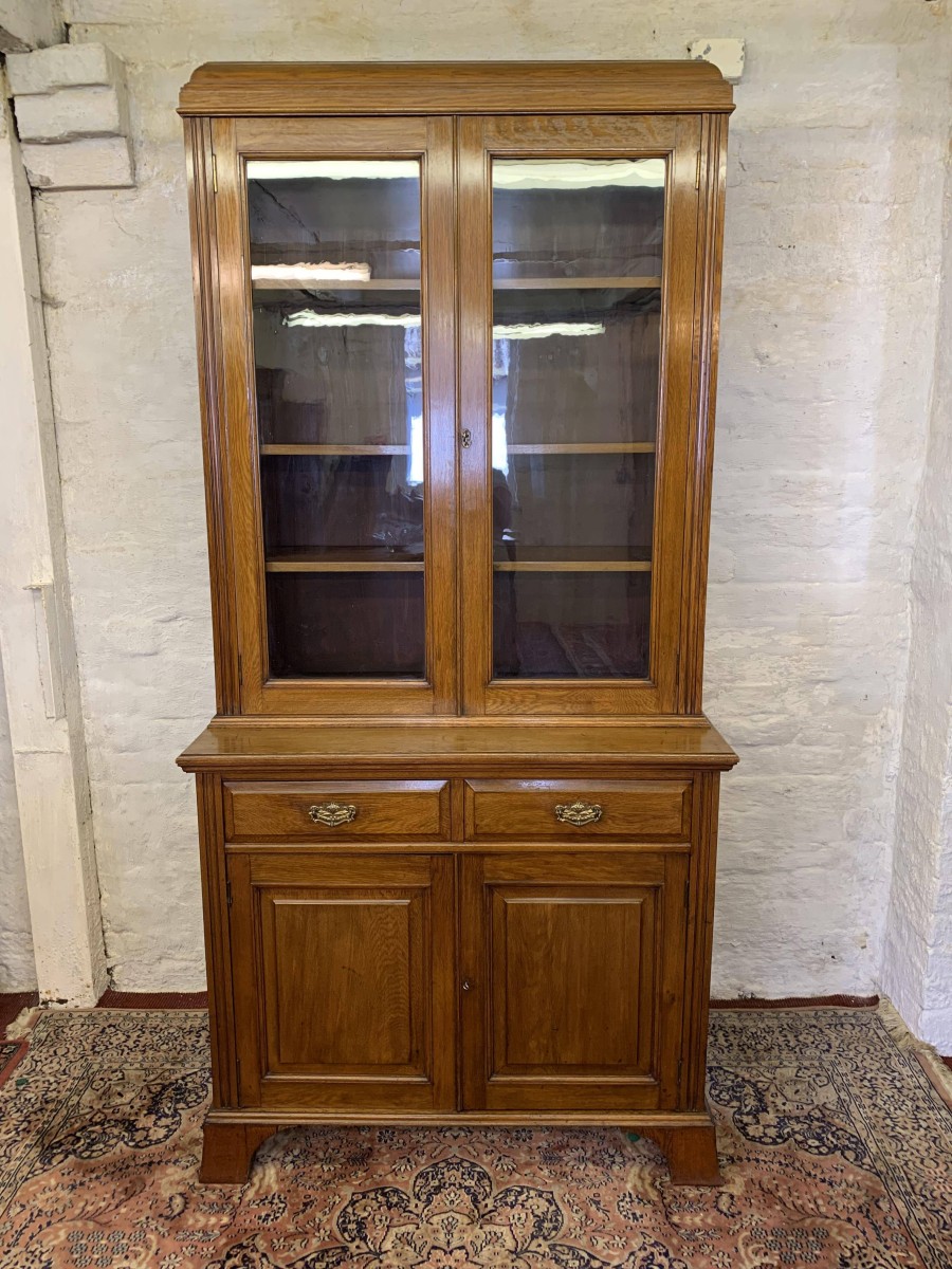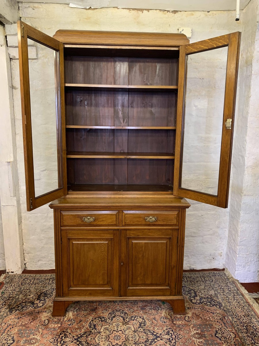 Made in glorious solid oak this bookcase dates Circa 1900. The stepped cornice sits above two glazed lockable doors, the doors opened to reveal three adjustable and removable shelves. The base section having two drawers which sit above two recessed panelled lockable cupboard doors, the cupboard doors open to reveal a removable shelf. This fabulous bookcase sits on four bracket feet.