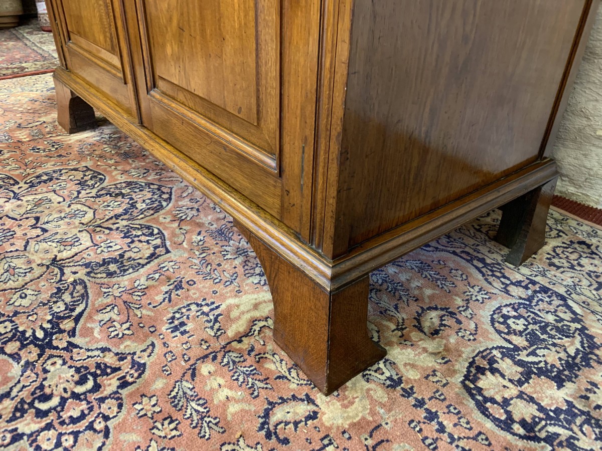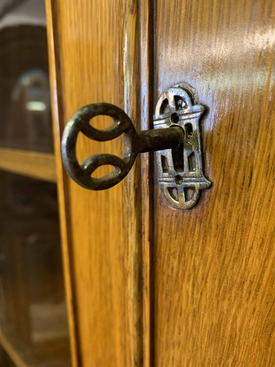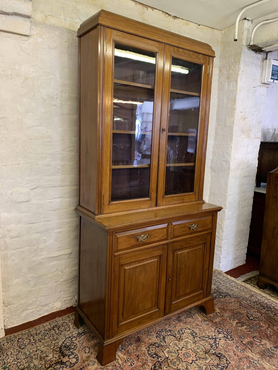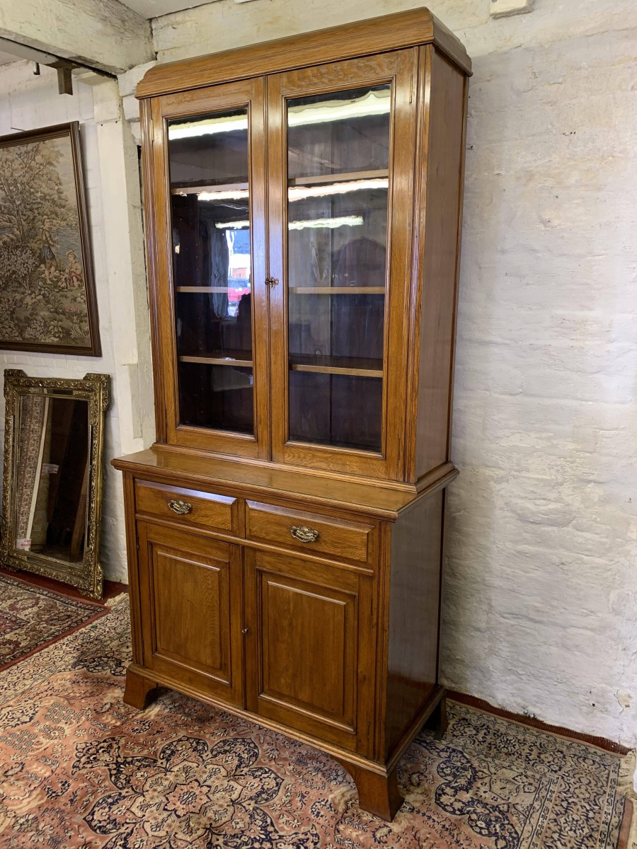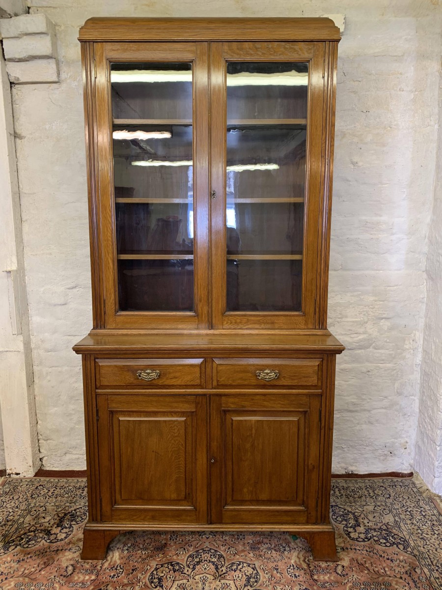 Made in glorious solid oak this bookcase dates Circa 1900. The stepped cornice sits above two glazed lockable doors, the doors opened to reveal three adjustable and removable shelves. The base section having two drawers which sit above two recessed panelled lockable cupboard doors, the cupboard doors open to reveal a removable shelf. This fabulous bookcase sits on four bracket feet.