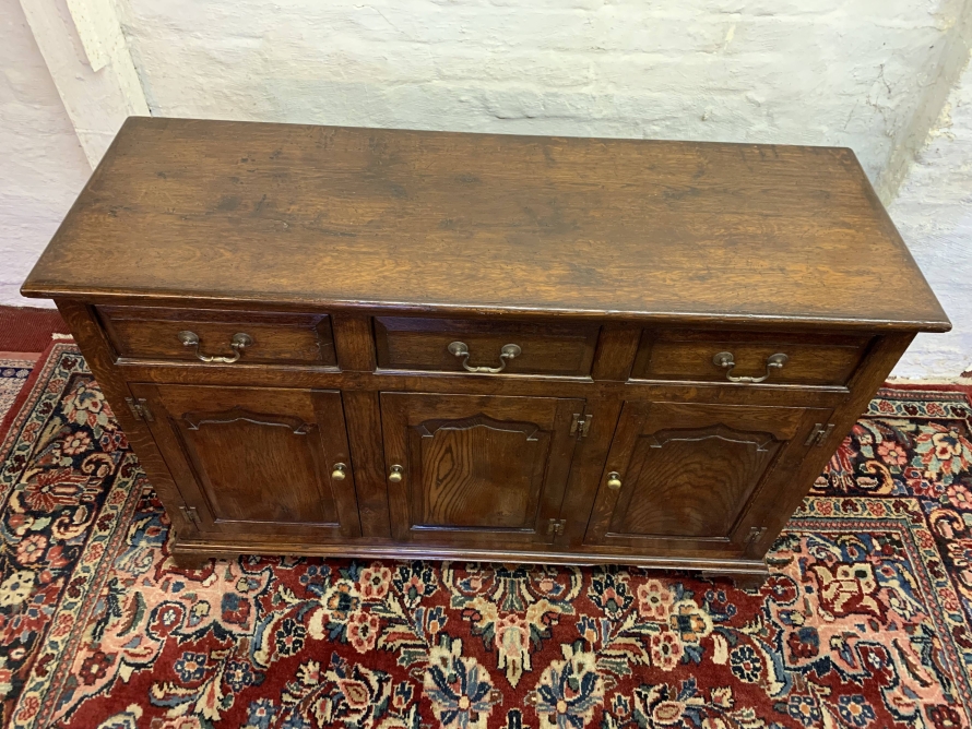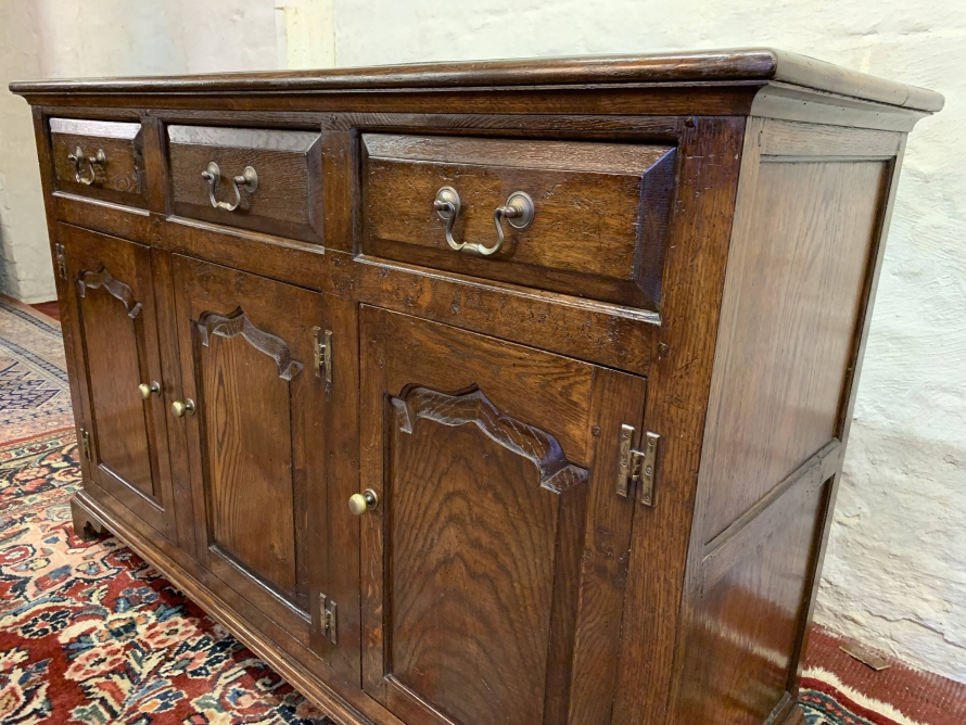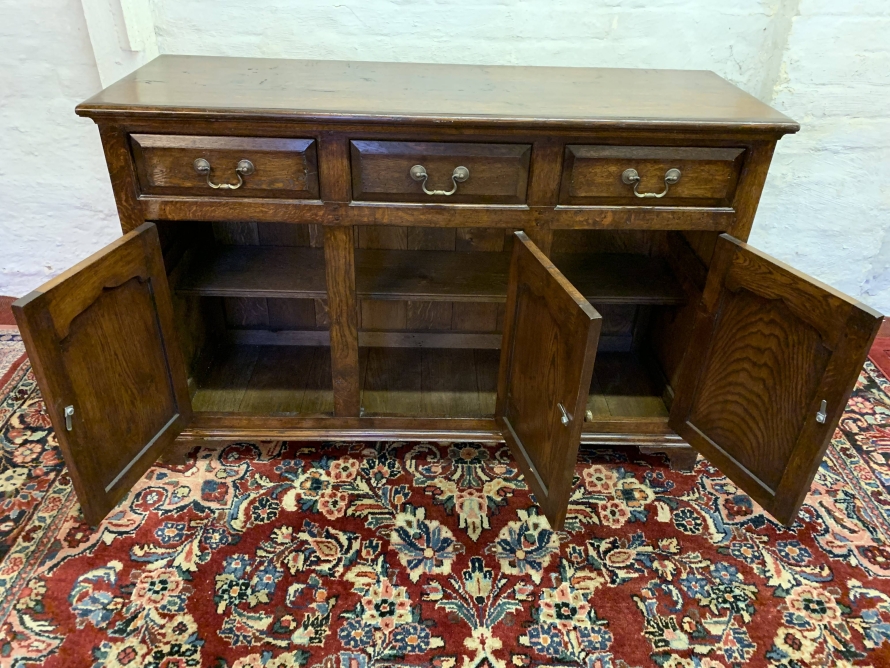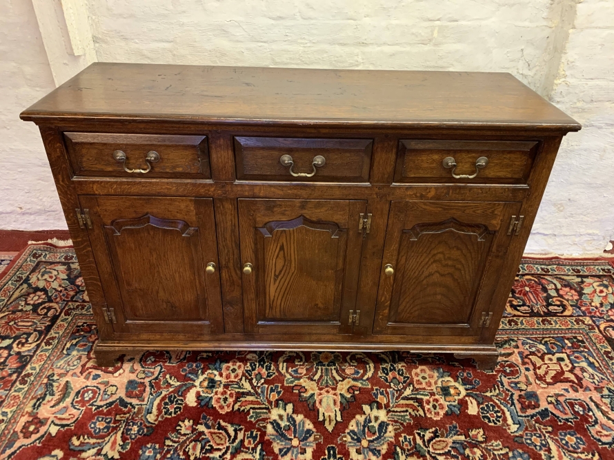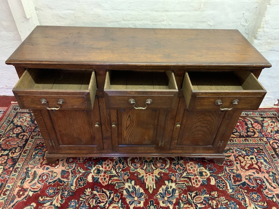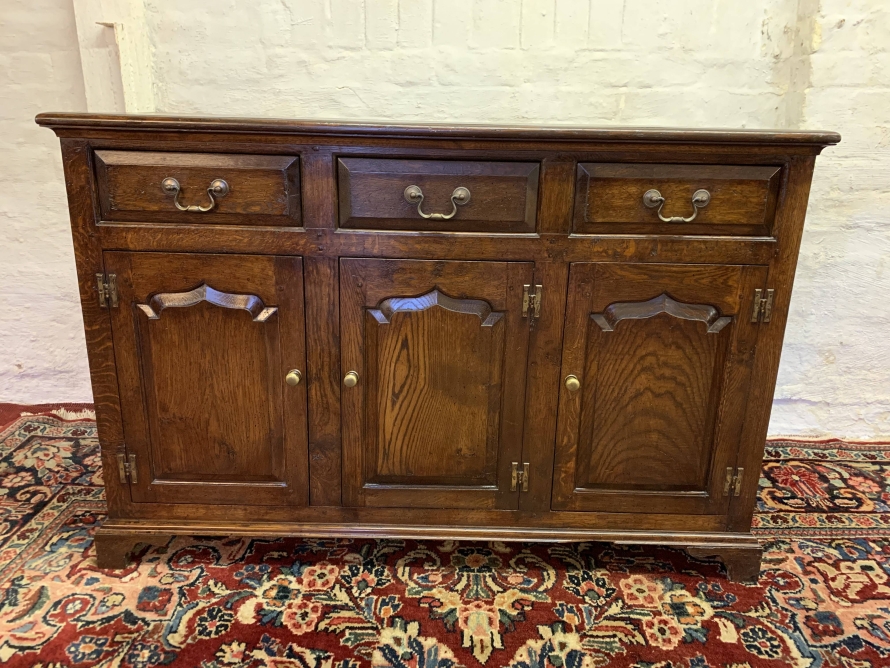 The dresser is made entirely in solid oak. The oversailing top sits above three drawers, each drawer having a brass drop handle. Below are three shaped fielded panelled doors, each door having traditional H hinges with a brass knob handle with brass internal locking latch. The doors open to reveal a shelf, boarded back and boarded base. The dresser stands on four bracket feet.