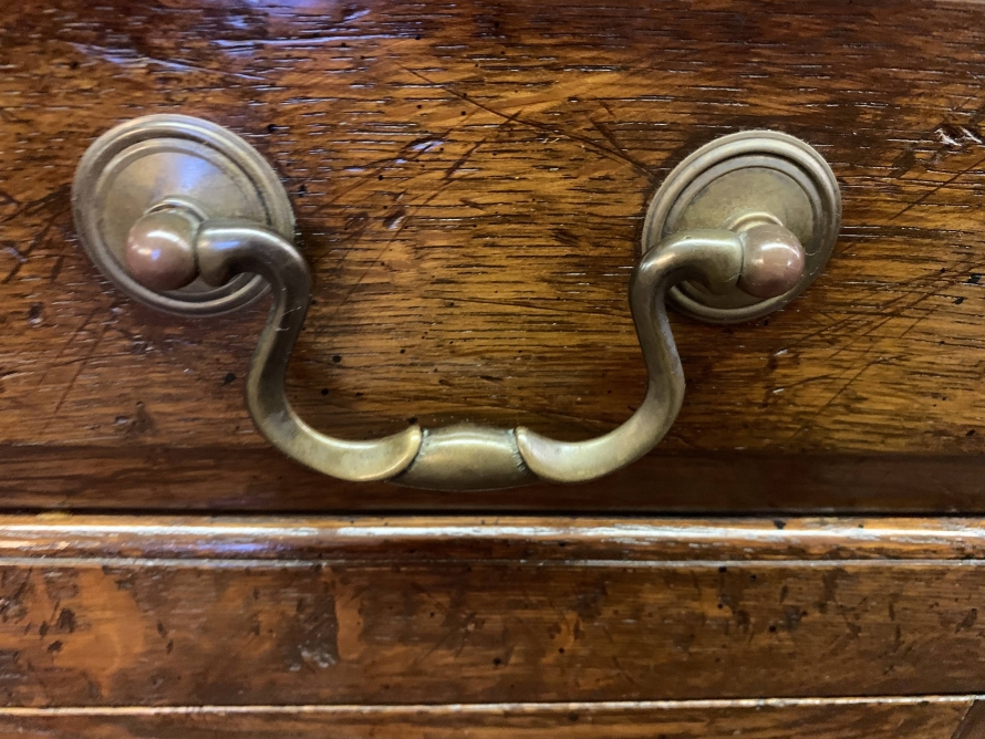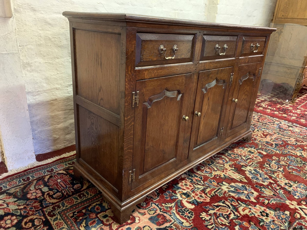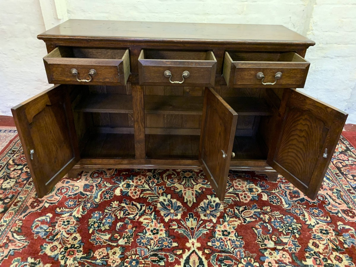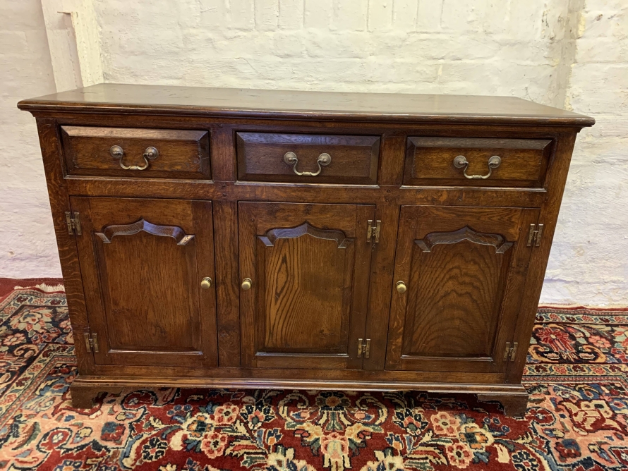 The dresser is made entirely in solid oak. The oversailing top sits above three drawers, each drawer having a brass drop handle. Below are three shaped fielded panelled doors, each door having traditional H hinges with a brass knob handle with brass internal locking latch. The doors open to reveal a shelf, boarded back and boarded base. The dresser stands on four bracket feet.