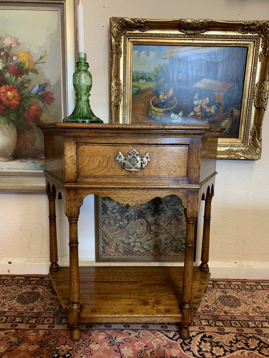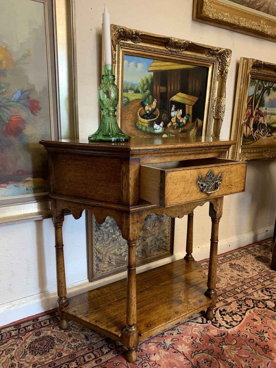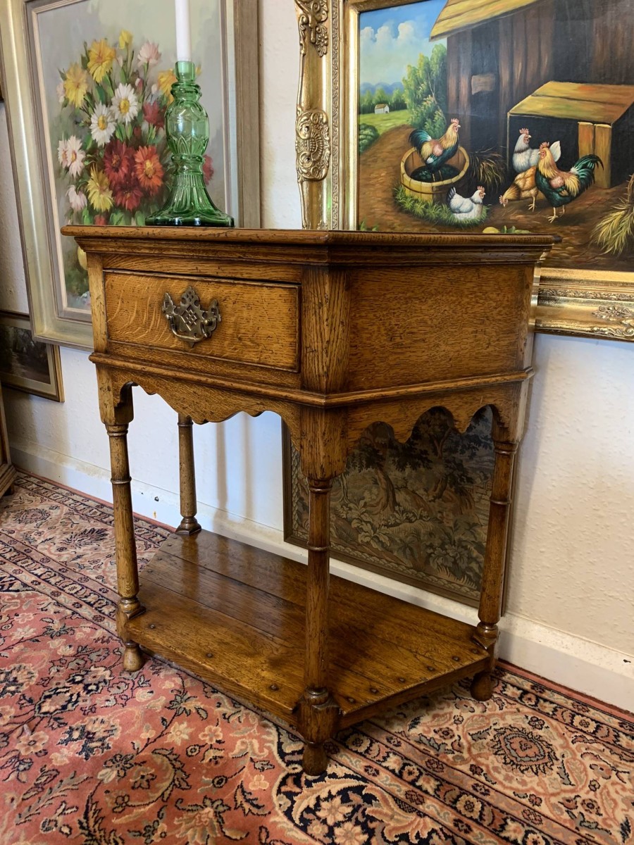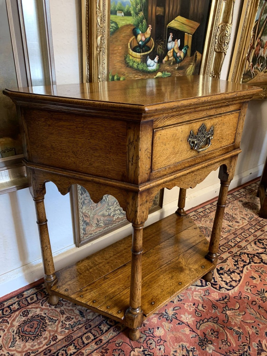 The table is made in glorious English medium oak and is in excellent condition. The canted oversailing top sits above a central drawer, the drawer having decorative brass handles. Wavy skirt, pegged boarded base this fantastic side/hall table stands on four elegant turned legs with turned feet. Please check our other listings for matching items.