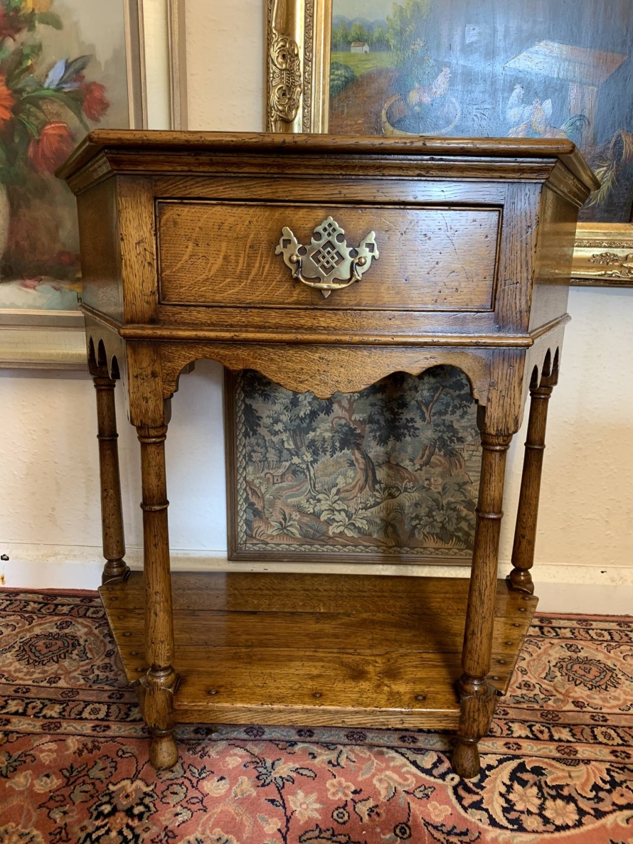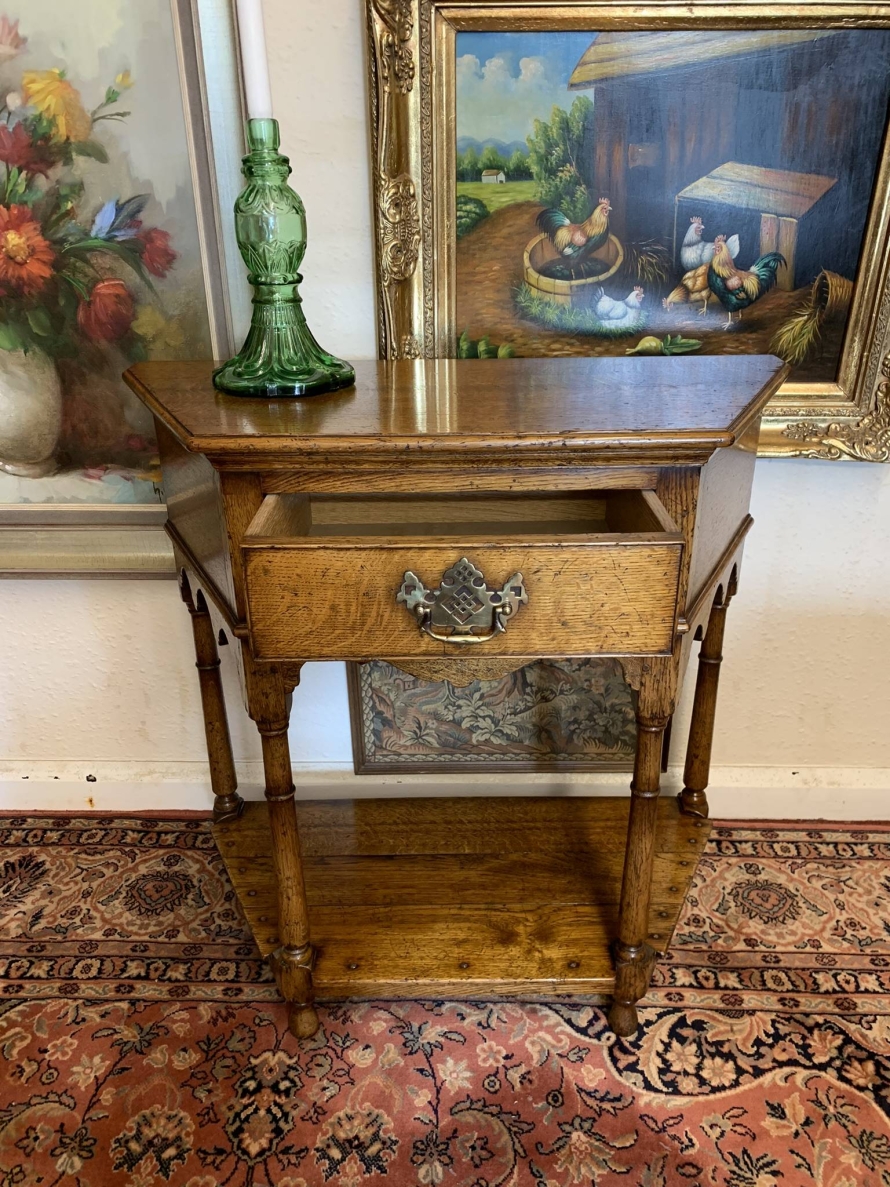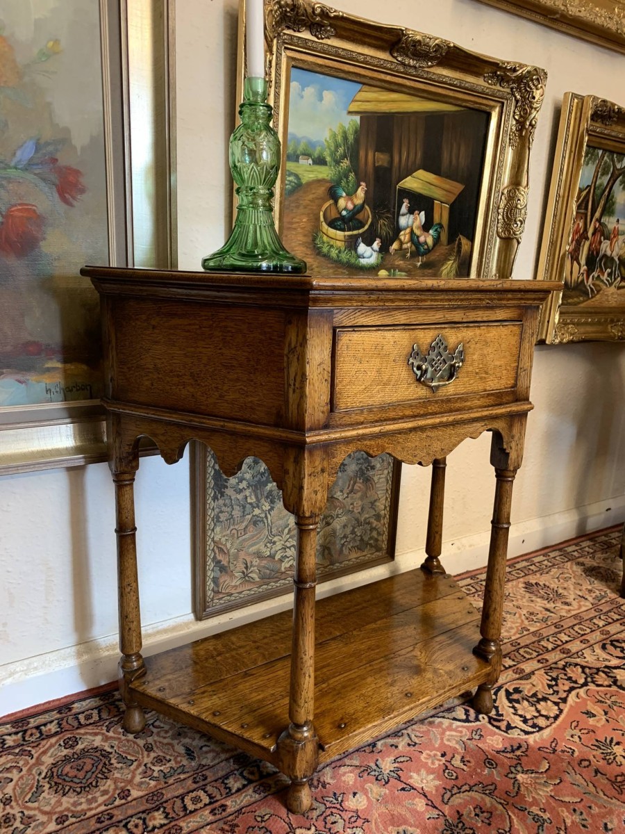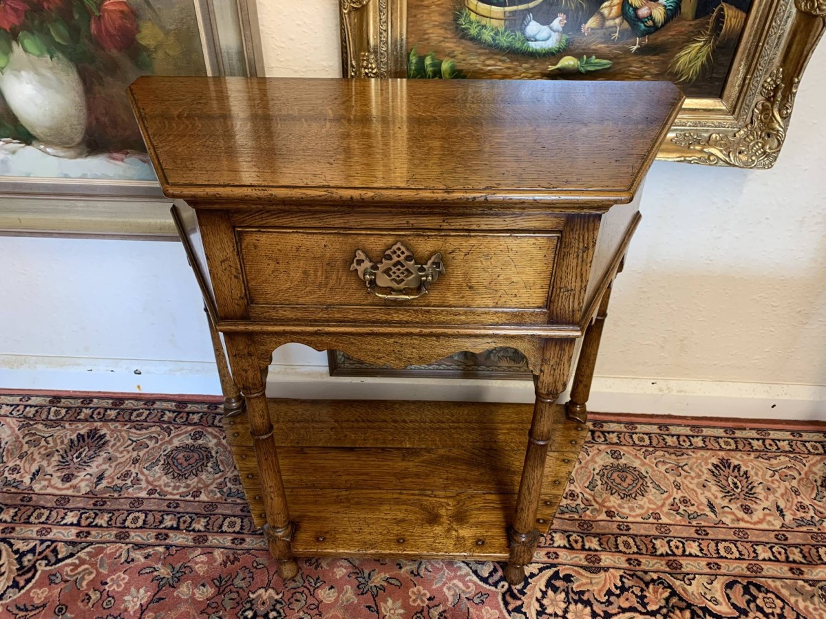The table is made in glorious English medium oak and is in excellent condition. The canted oversailing top sits above a central drawer, the drawer having decorative brass handles. Wavy skirt, pegged boarded base this fantastic side/hall table stands on four elegant turned legs with turned feet. Please check our other listings for matching items.