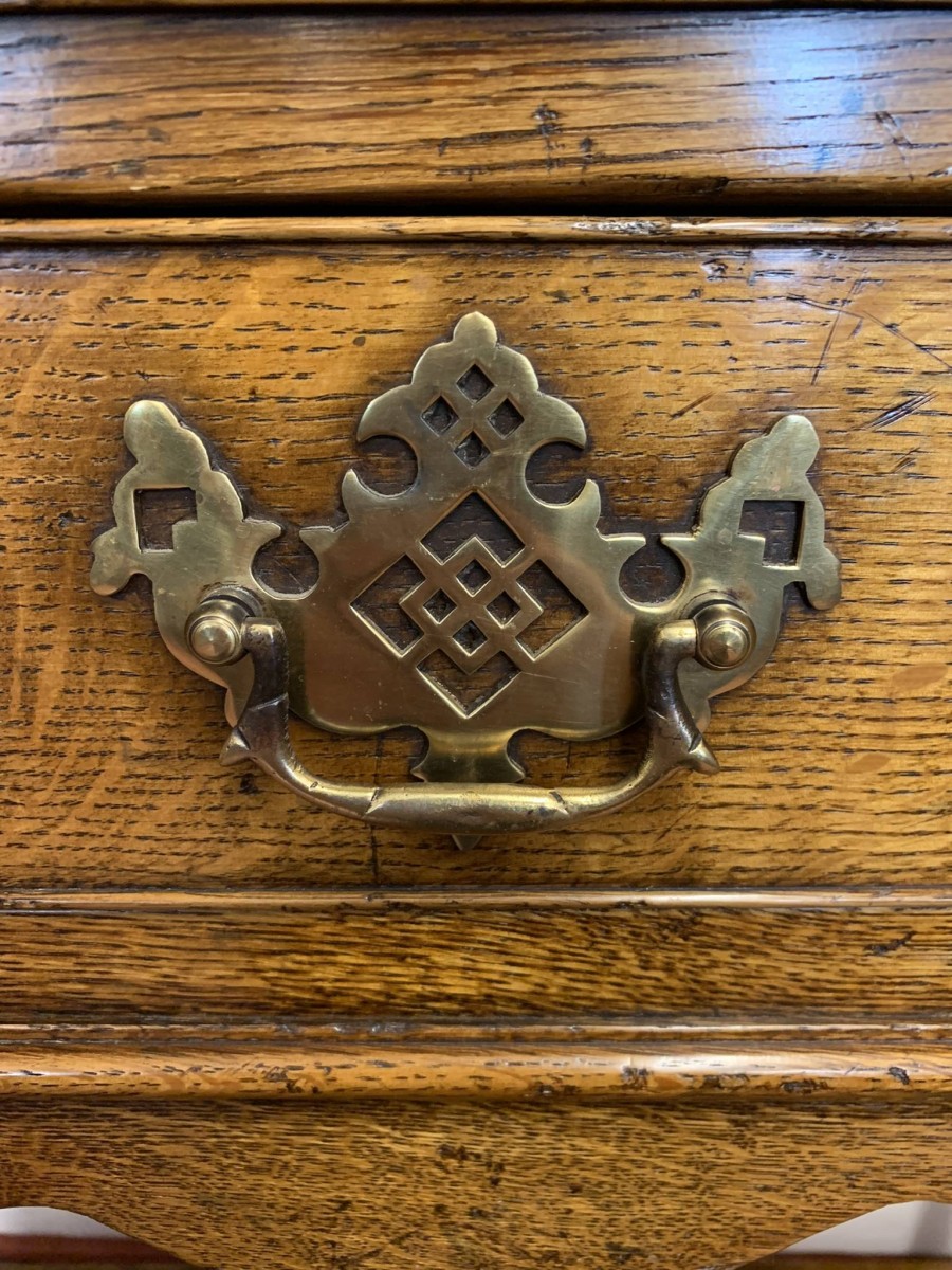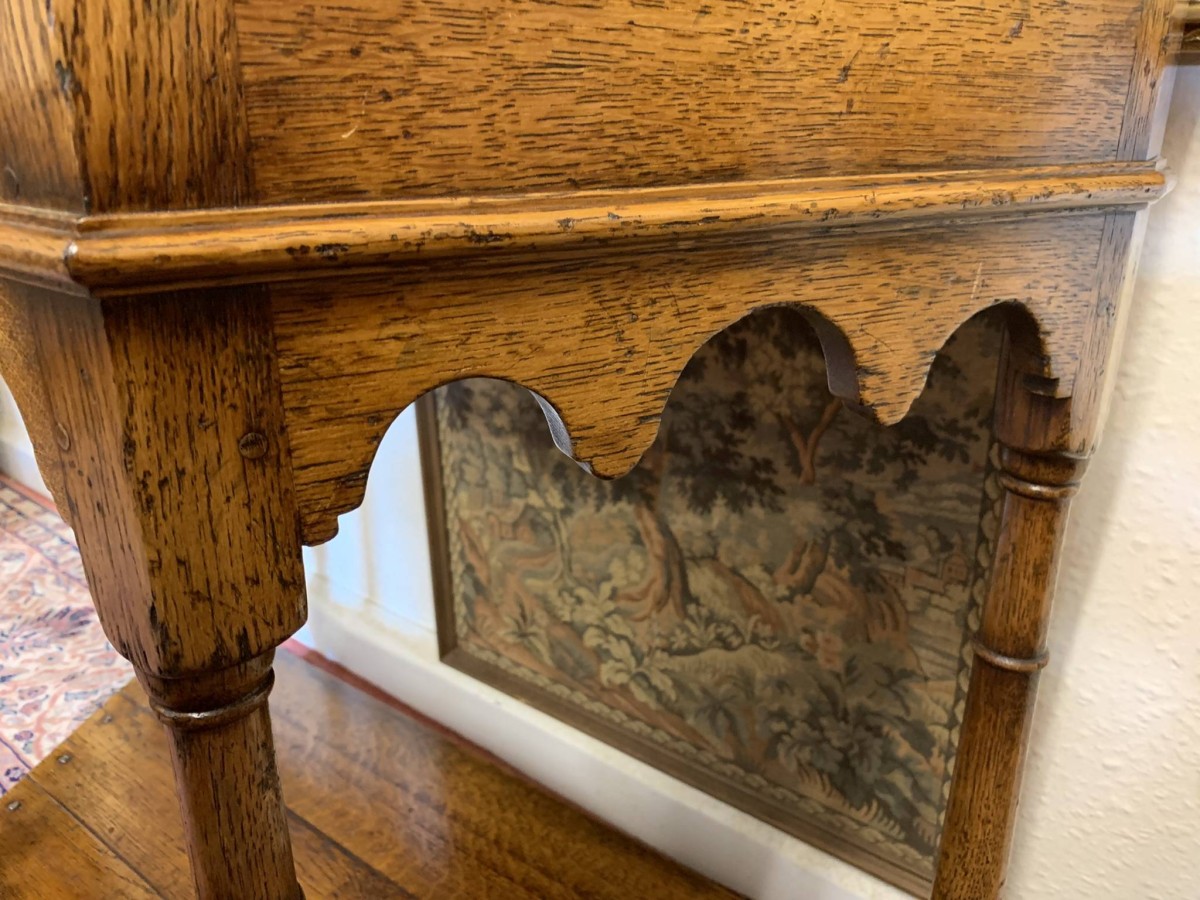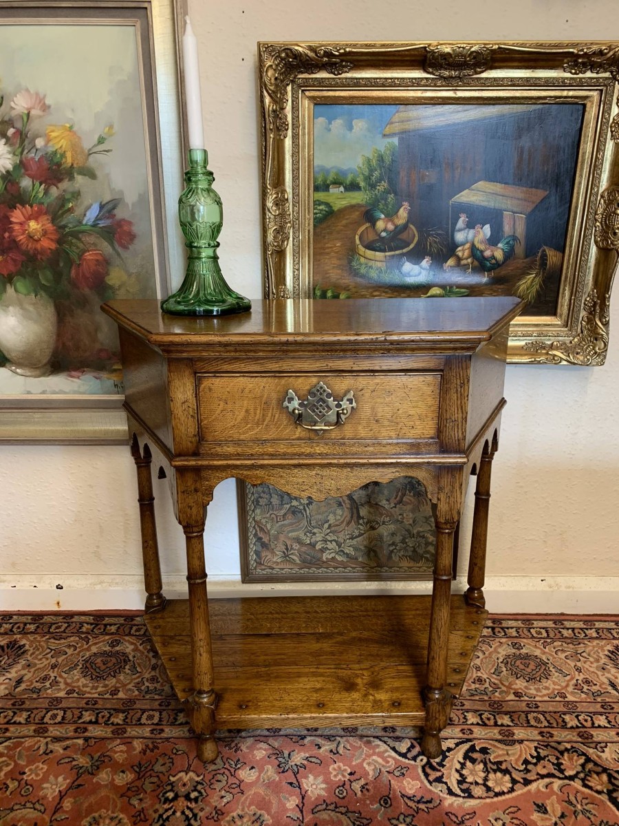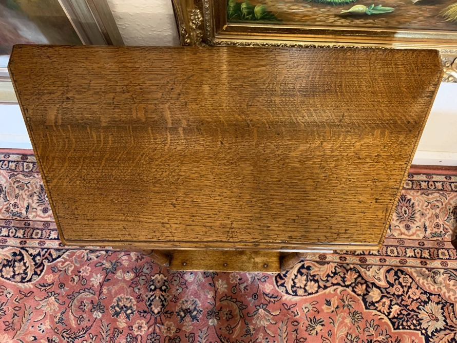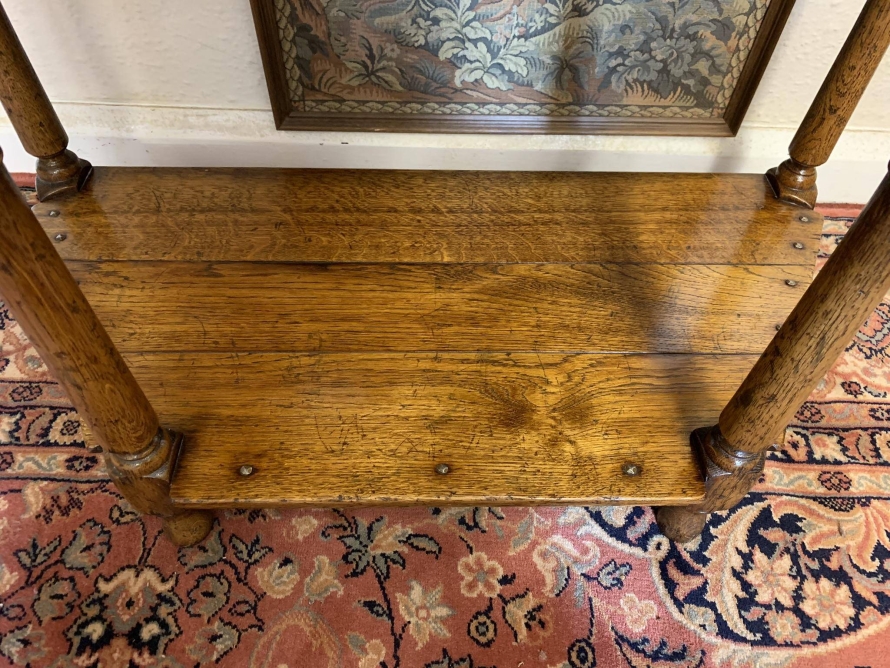 The table is made in glorious English medium oak and is in excellent condition. The canted oversailing top sits above a central drawer, the drawer having decorative brass handles. Wavy skirt, pegged boarded base this fantastic side/hall table stands on four elegant turned legs with turned feet. Please check our other listings for matching items.