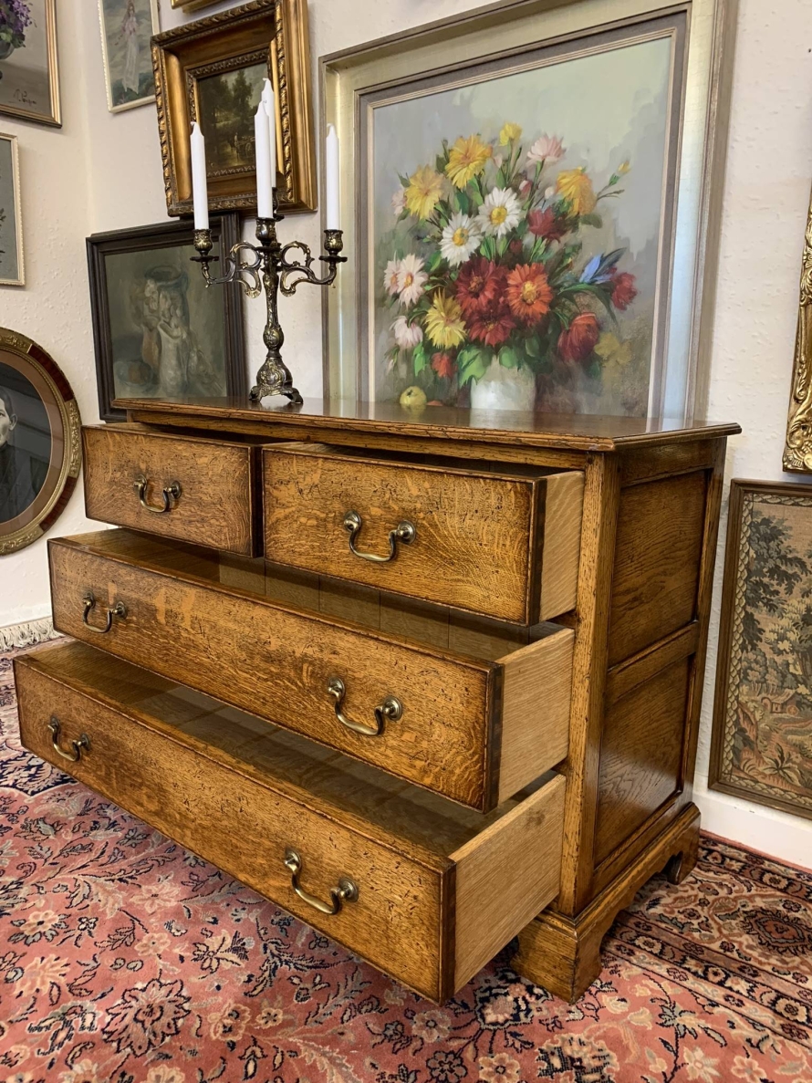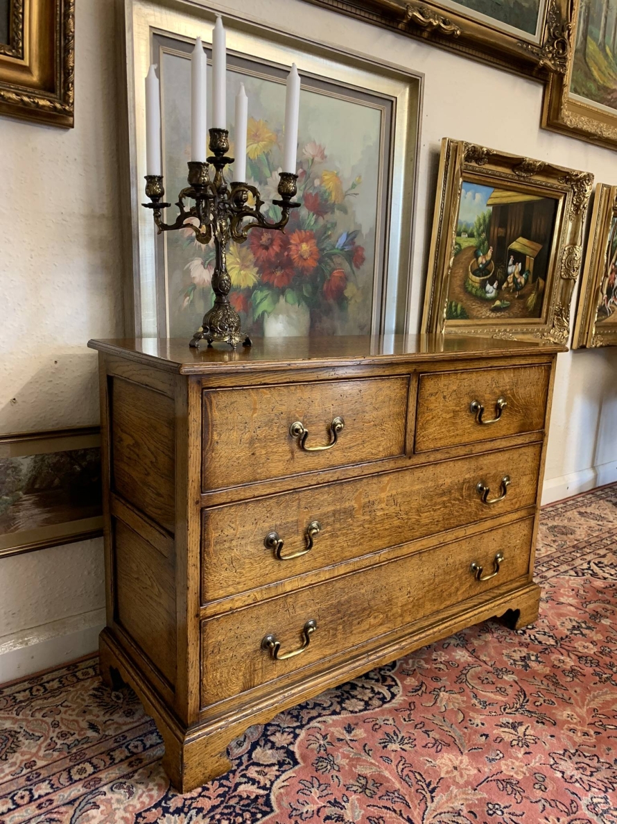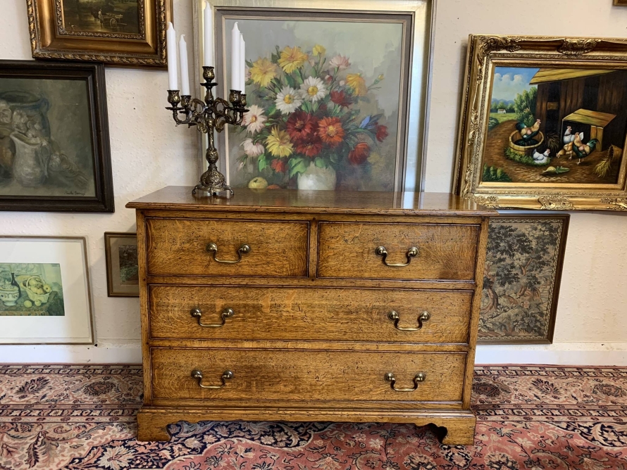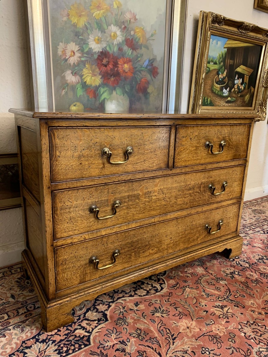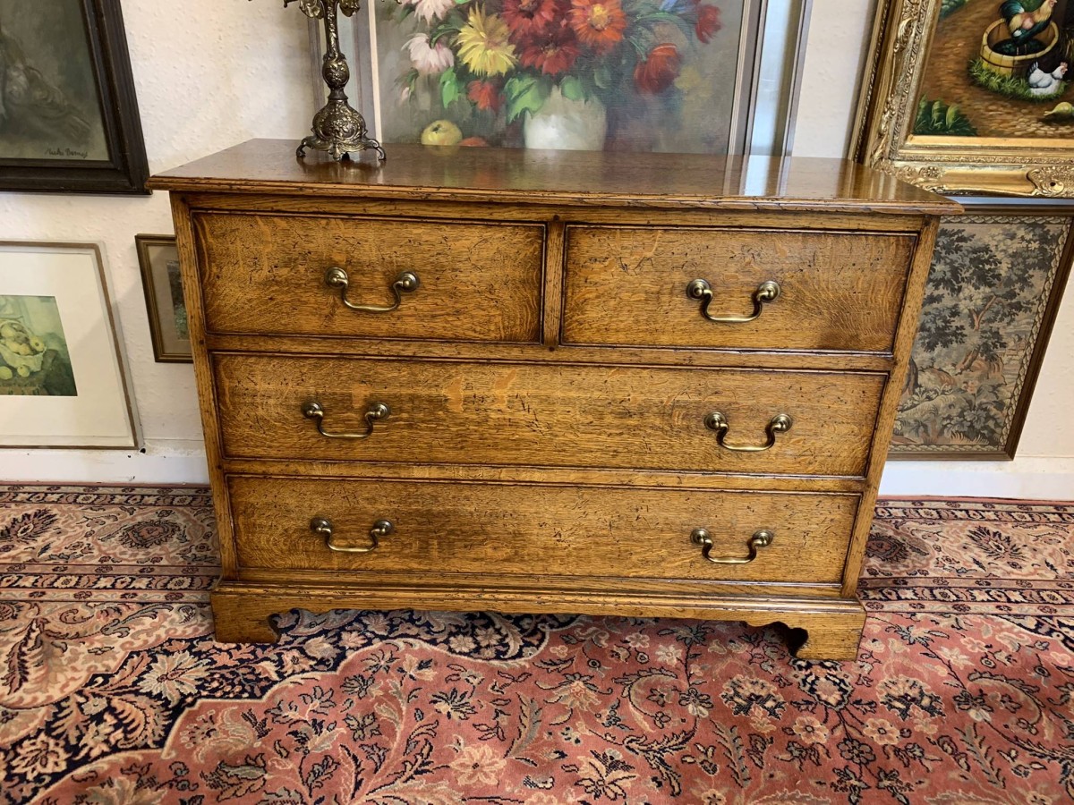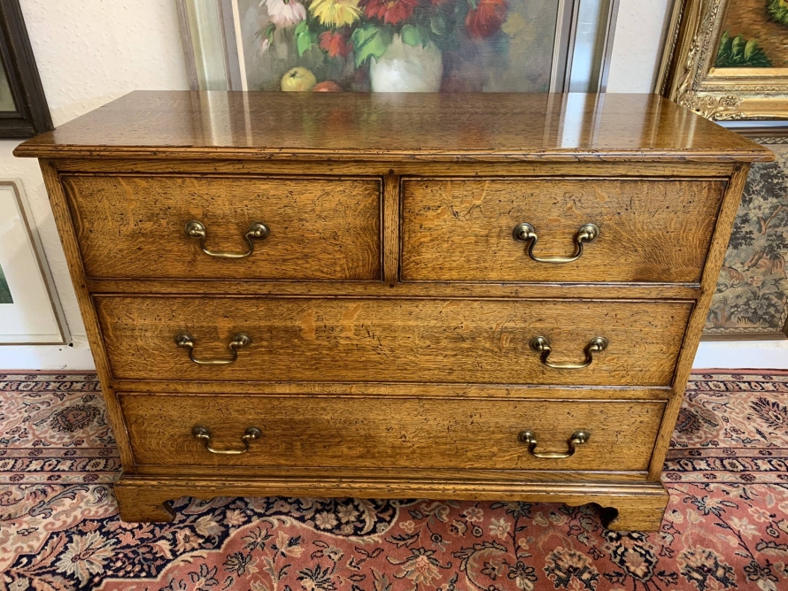 Made in glorious solid medium oak which gives a lovely warm feel to this quality chest of drawers which are in excellent condition. The oversailing top sits above two short and too long drawers, the short drawers each having a brass handle with the two long drawers having a pair of brass handles. Recessed panelled sides, this fabulous chest of drawer sits on four traditional bracket feet. Please see our other listings for matching items.