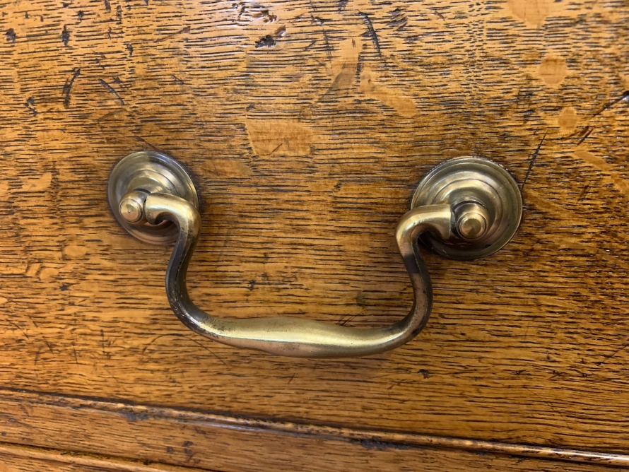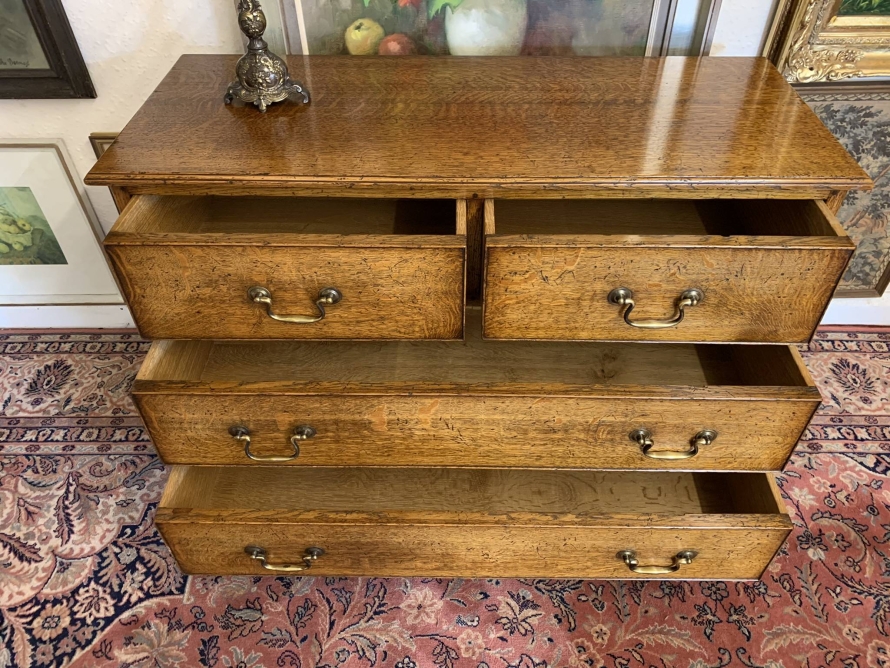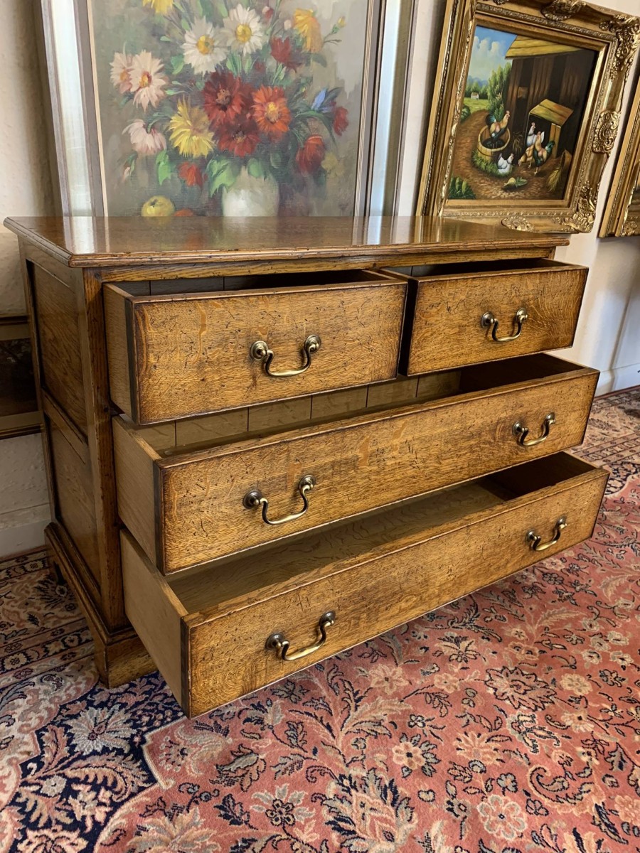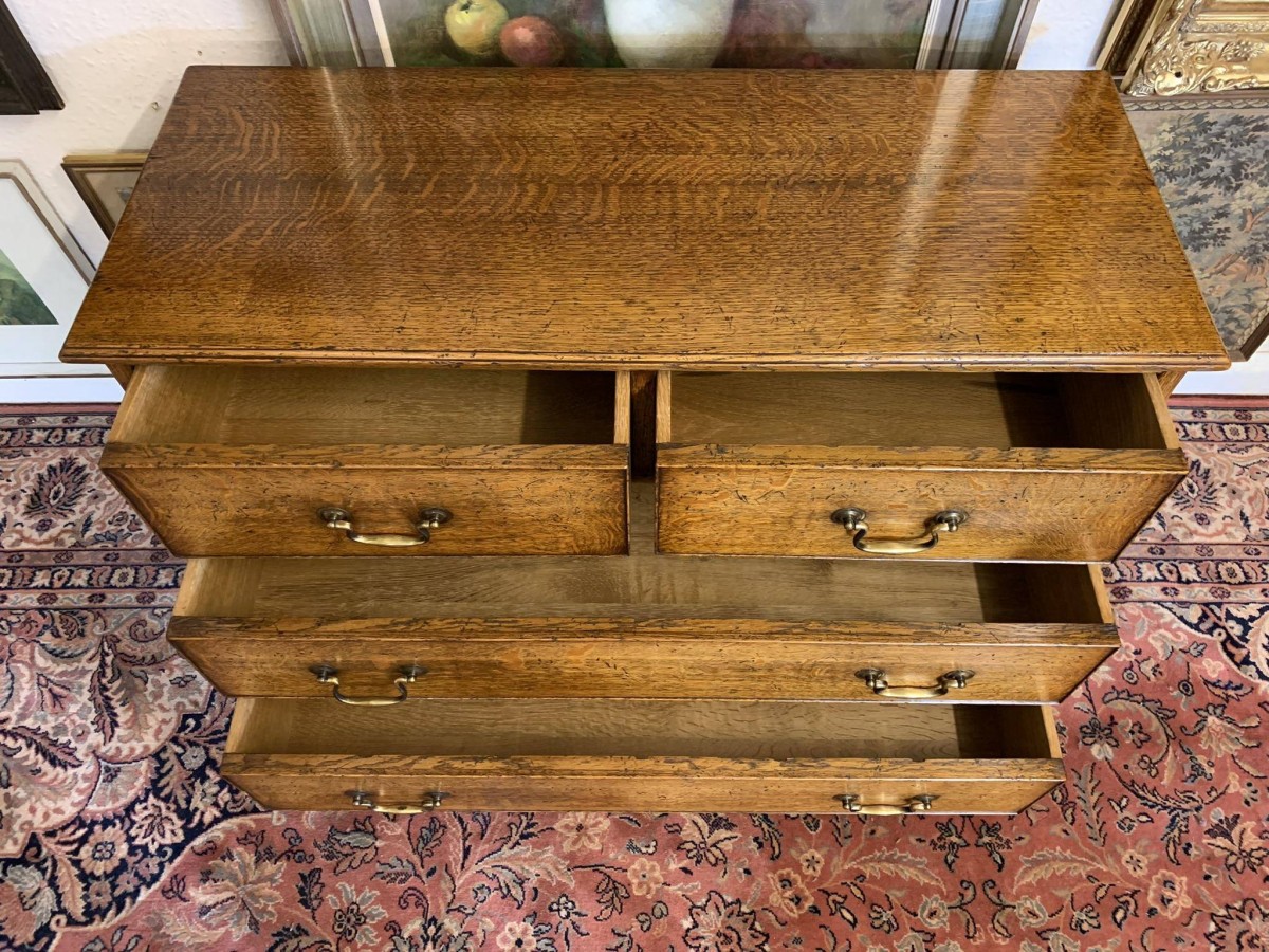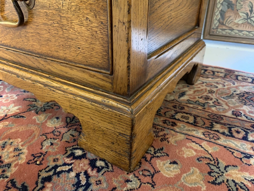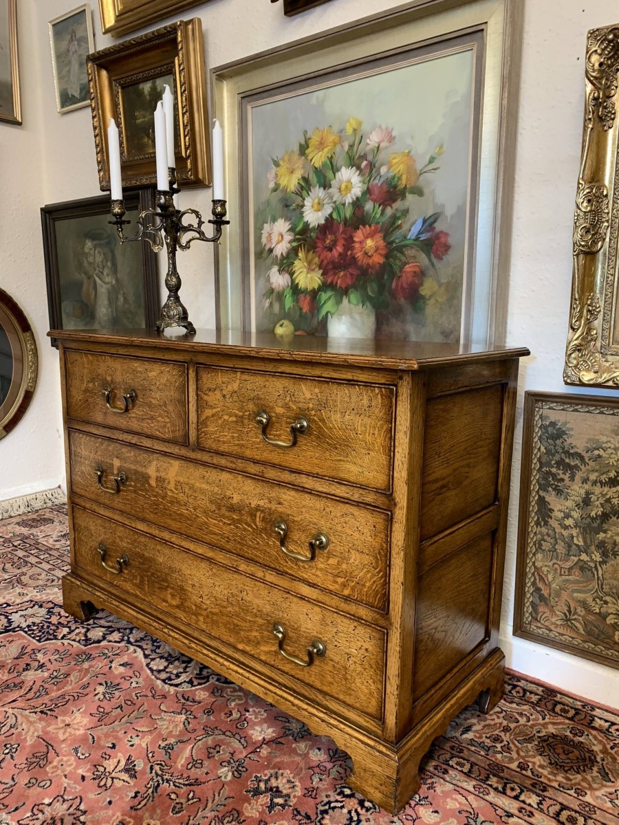 Made in glorious solid medium oak which gives a lovely warm feel to this quality chest of drawers which are in excellent condition. The oversailing top sits above two short and too long drawers, the short drawers each having a brass handle with the two long drawers having a pair of brass handles. Recessed panelled sides, this fabulous chest of drawer sits on four traditional bracket feet. Please see our other listings for matching items.