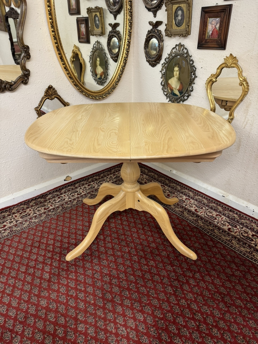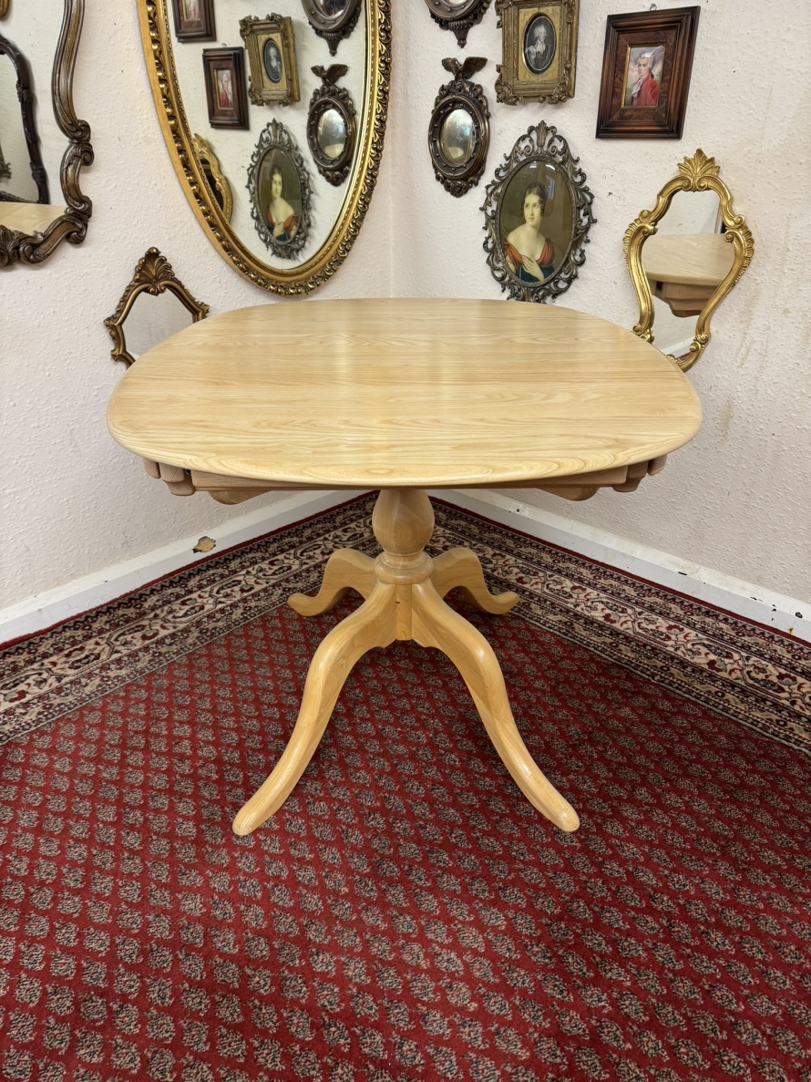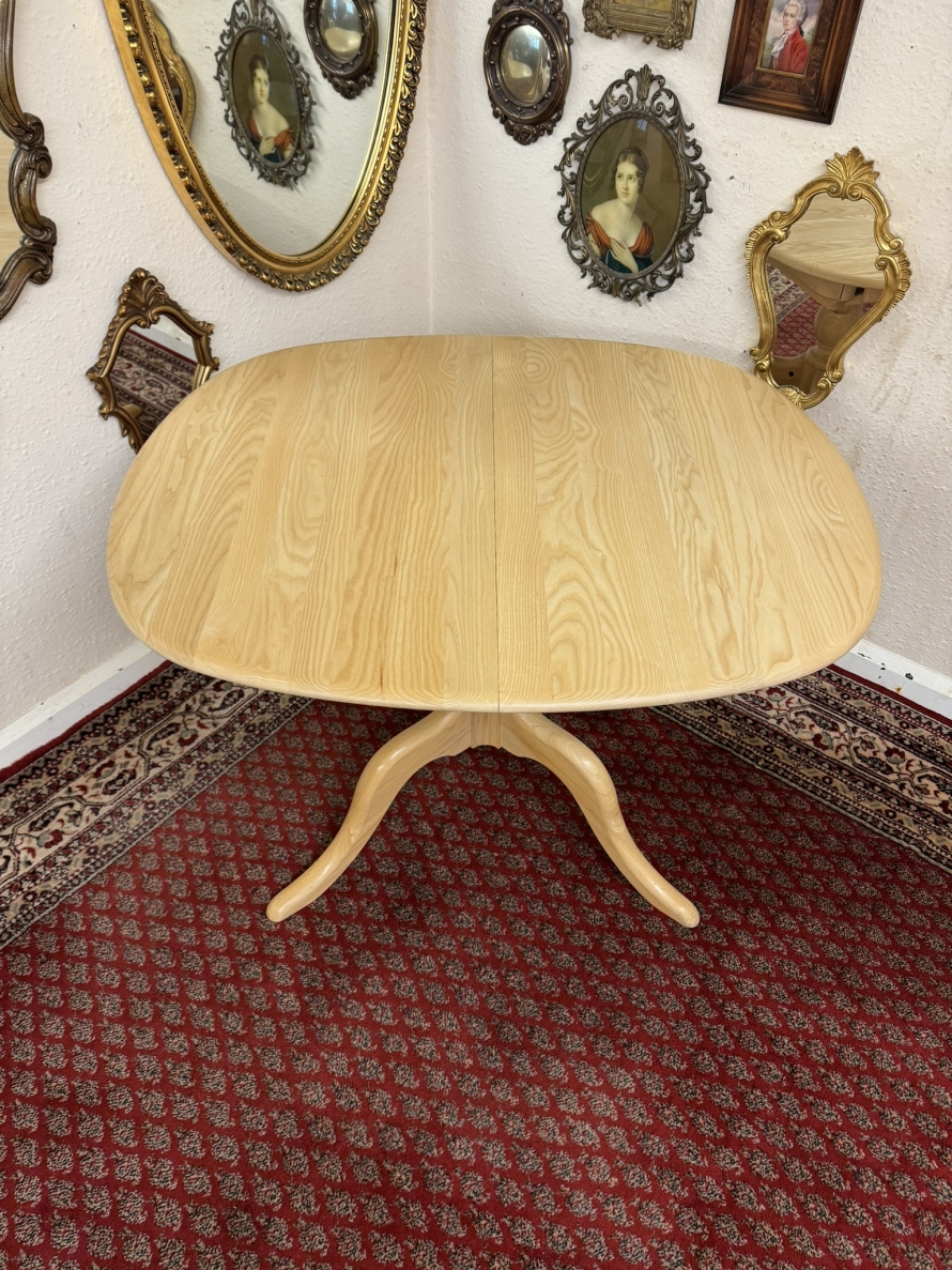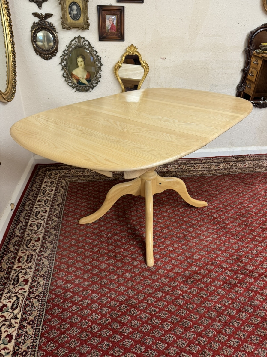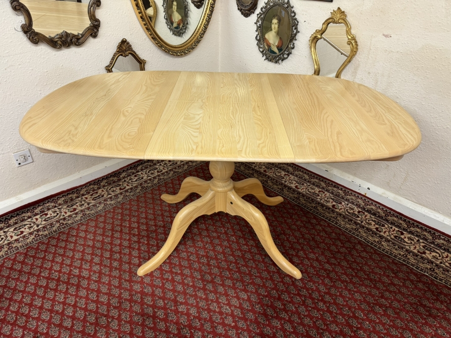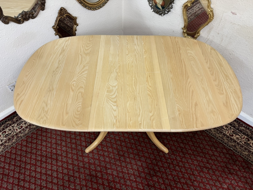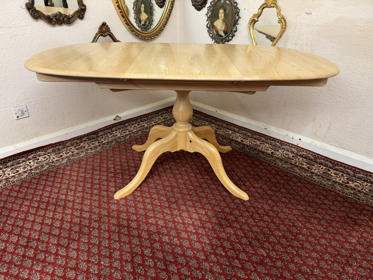 This fabulous quality table made by the renowned Ercol furniture makers is in excellent condition. The colour is clear matt Ash. The table opens to reveal a hidden extension leaf which easily slides in to position. The turned pedestal base has four curved legs.
