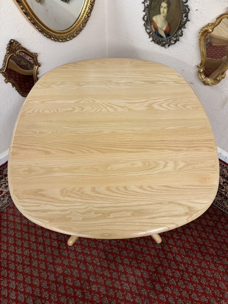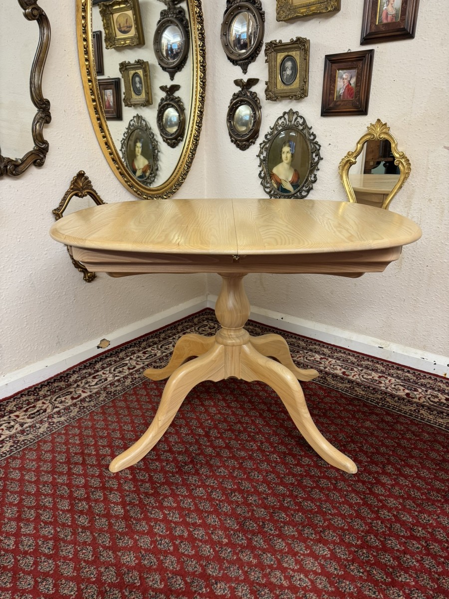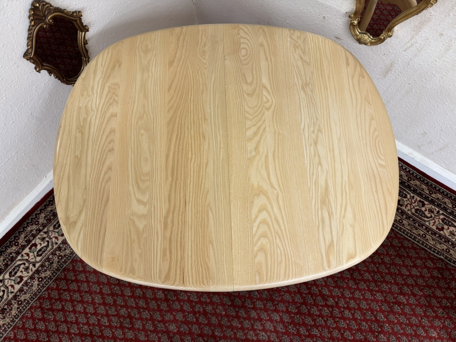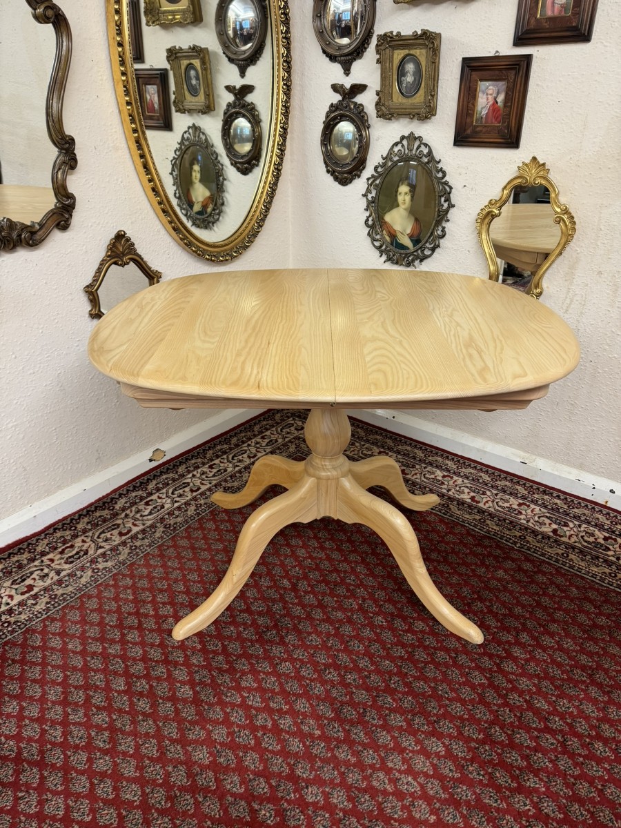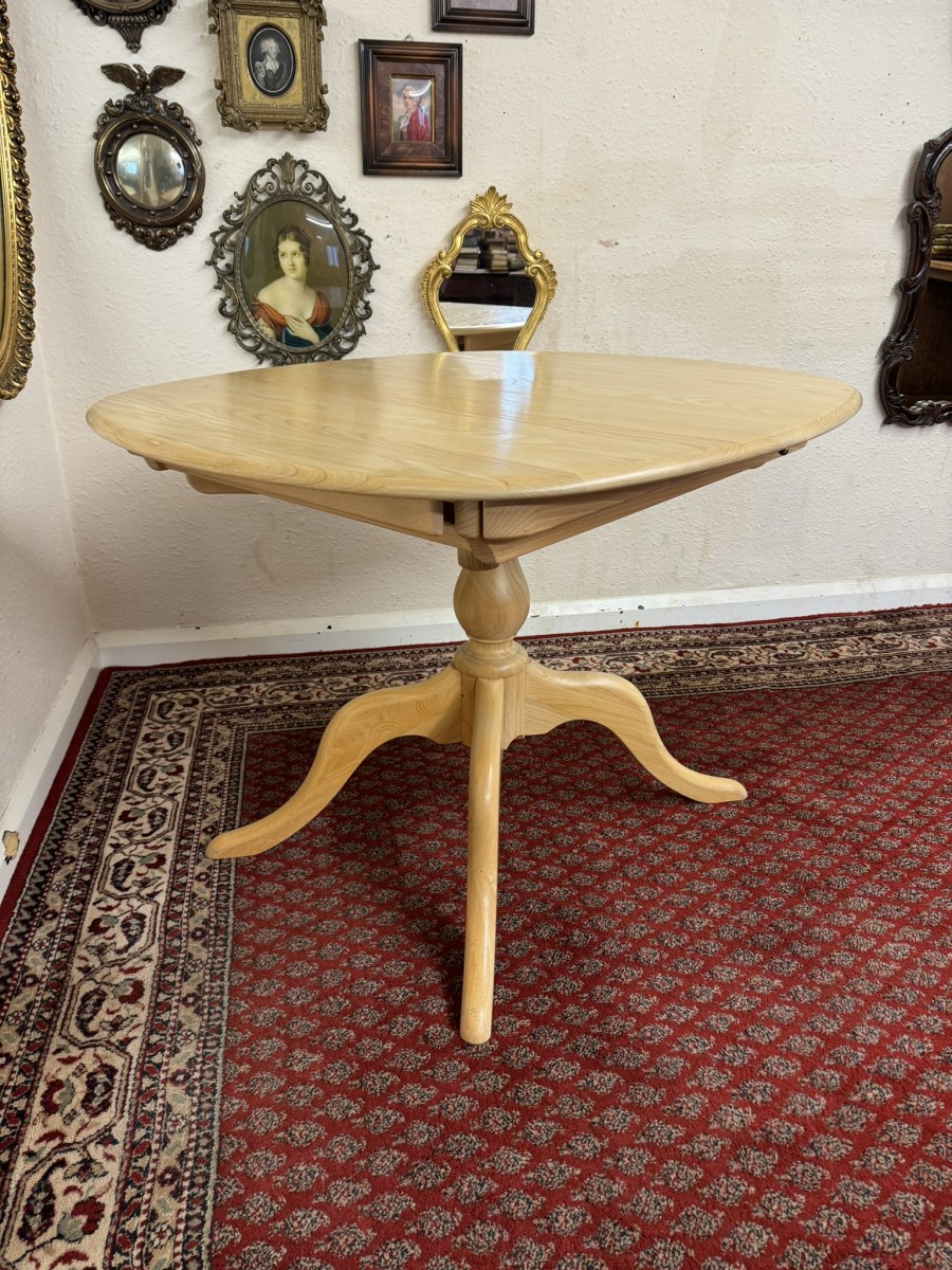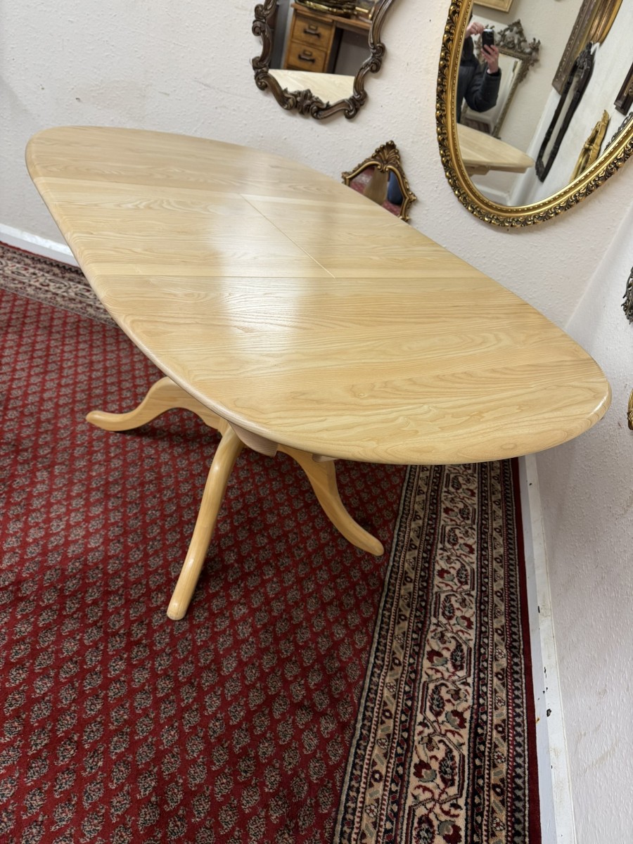 This fabulous quality table made by the renowned Ercol furniture makers is in excellent condition. The colour is clear matt Ash. The table opens to reveal a hidden extension leaf which easily slides in to position. The turned pedestal base has four curved legs.