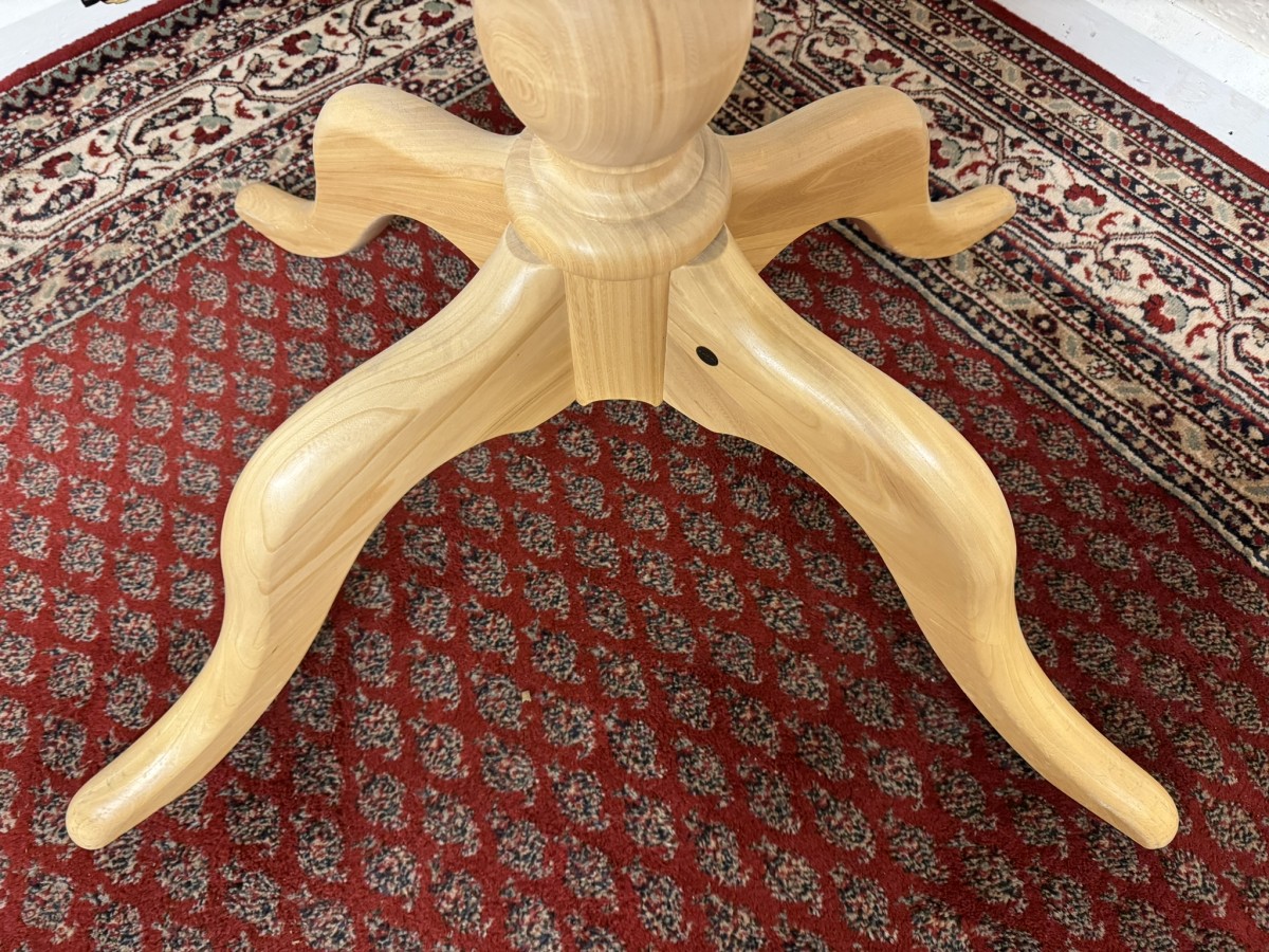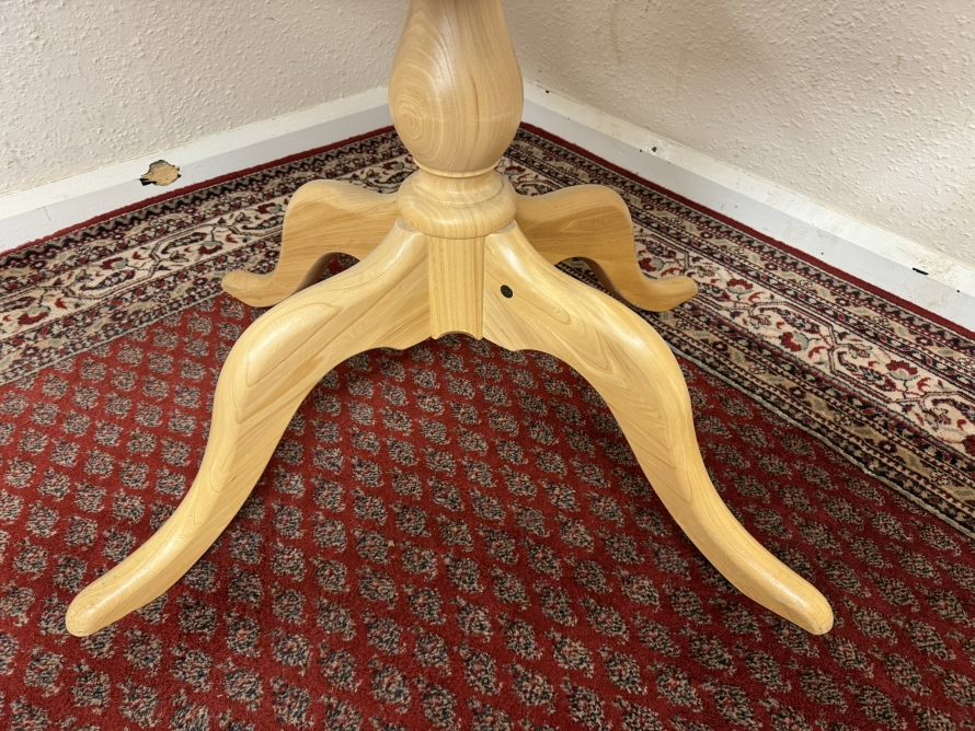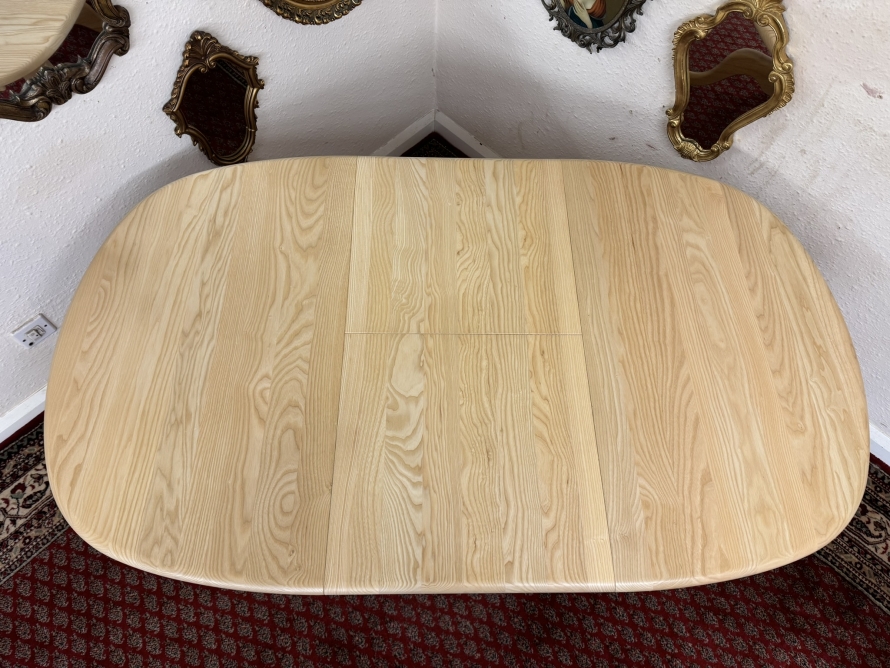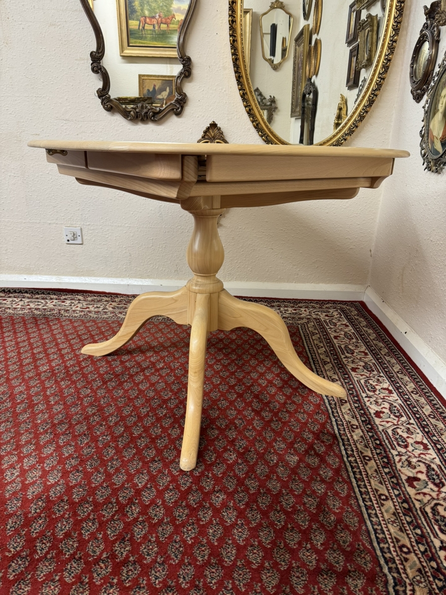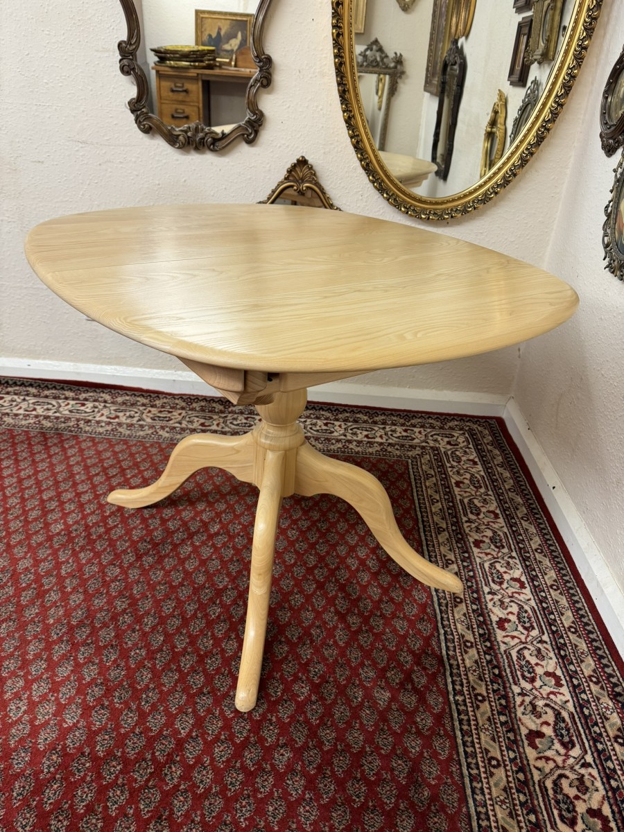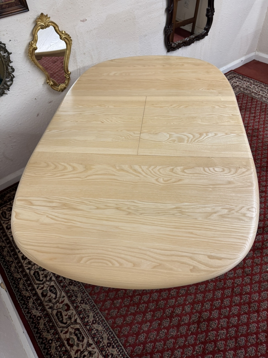 This fabulous quality table made by the renowned Ercol furniture makers is in excellent condition. The colour is clear matt Ash. The table opens to reveal a hidden extension leaf which easily slides in to position. The turned pedestal base has four curved legs.