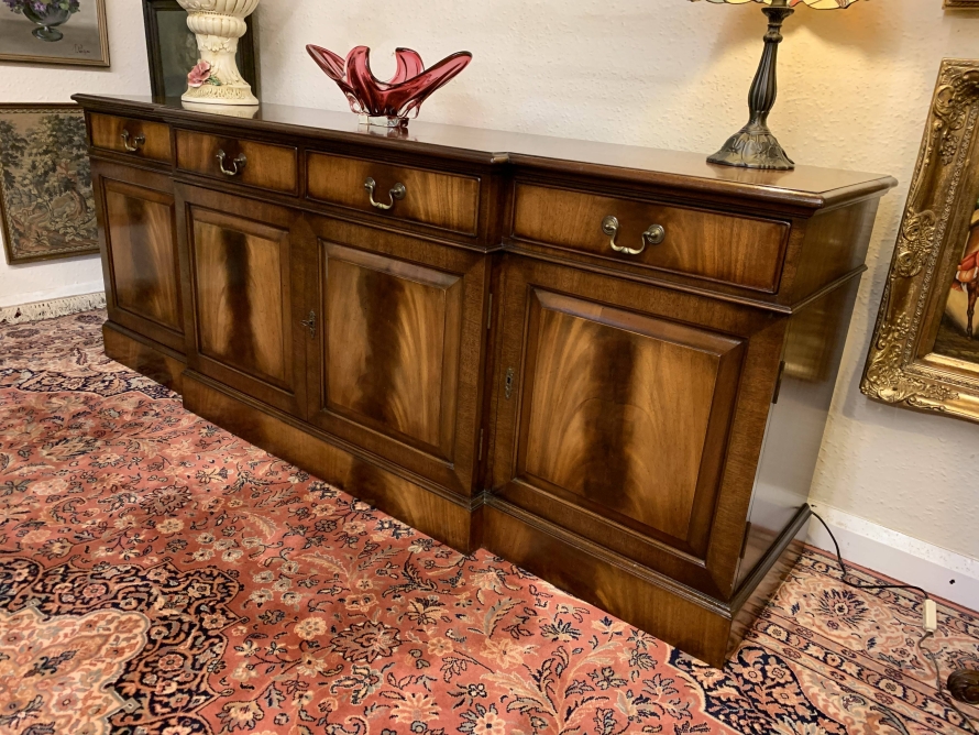 Made in striking flame mahogany this brakefront sideboard has an oversailing top, four drawers each with brass handles and four lockable recessed panelled cupboard doors which open to reveal adjustable and removable shelves. This fabulous sideboard which offers great storage sits on a platform plinth base.